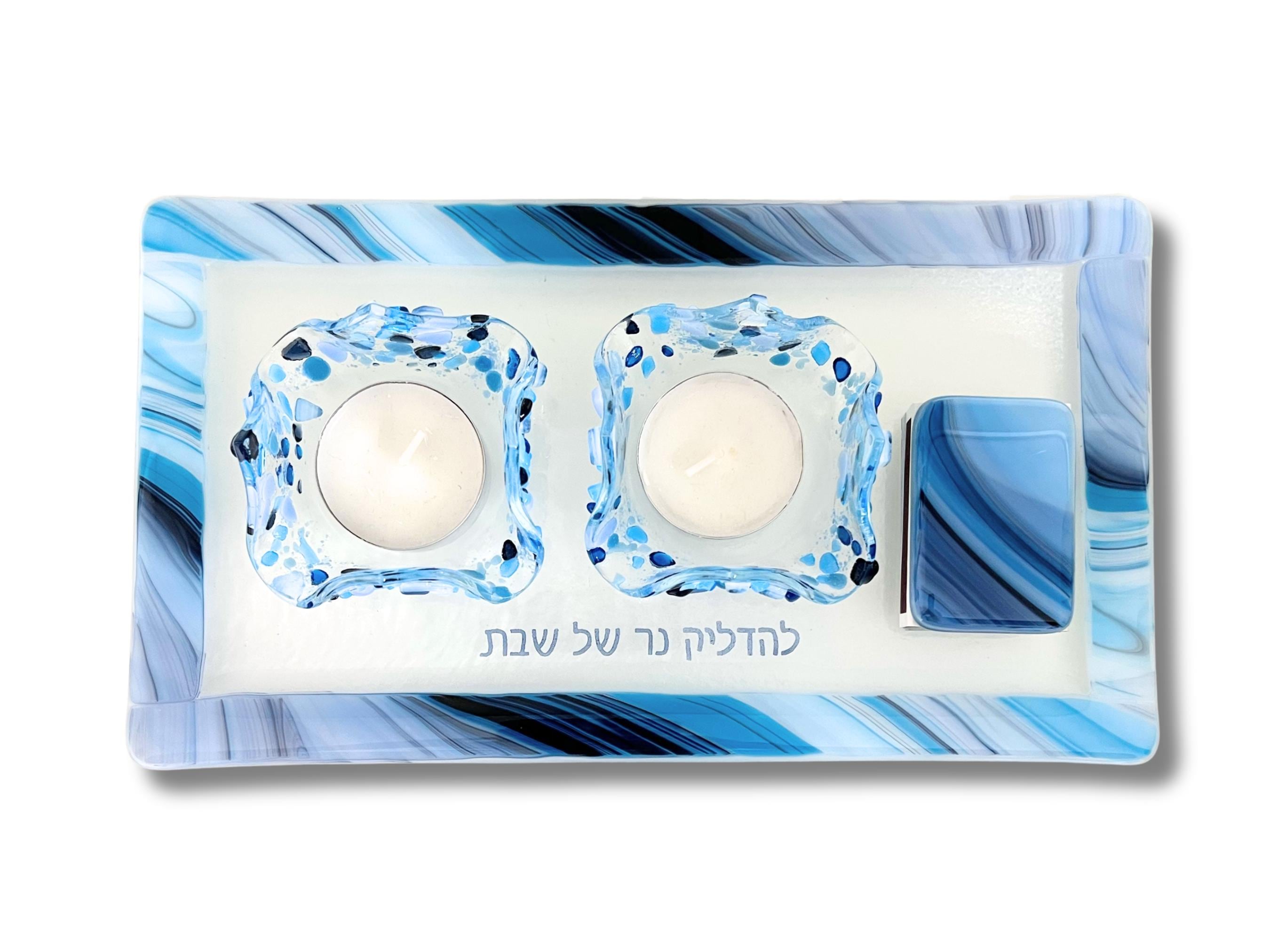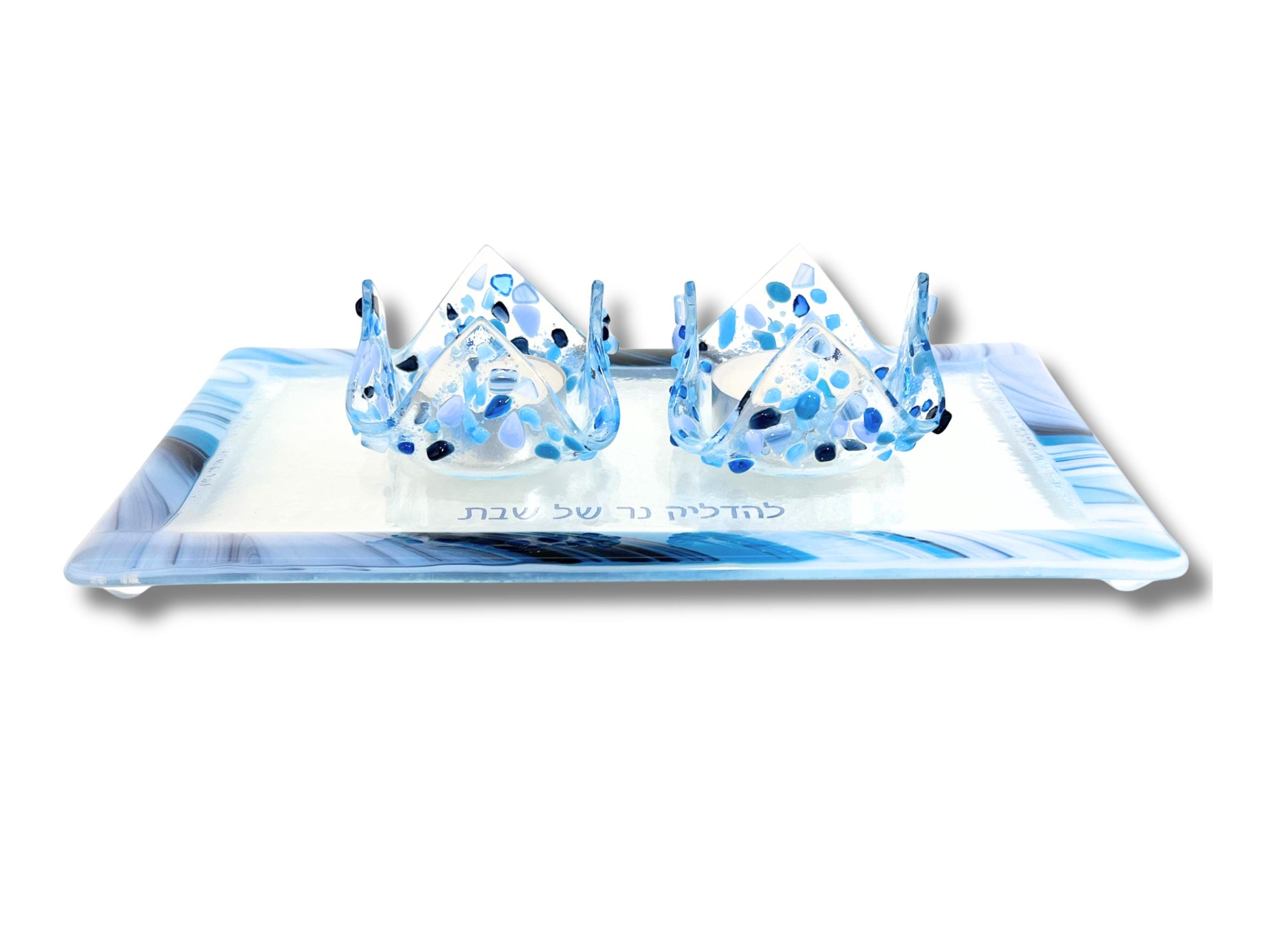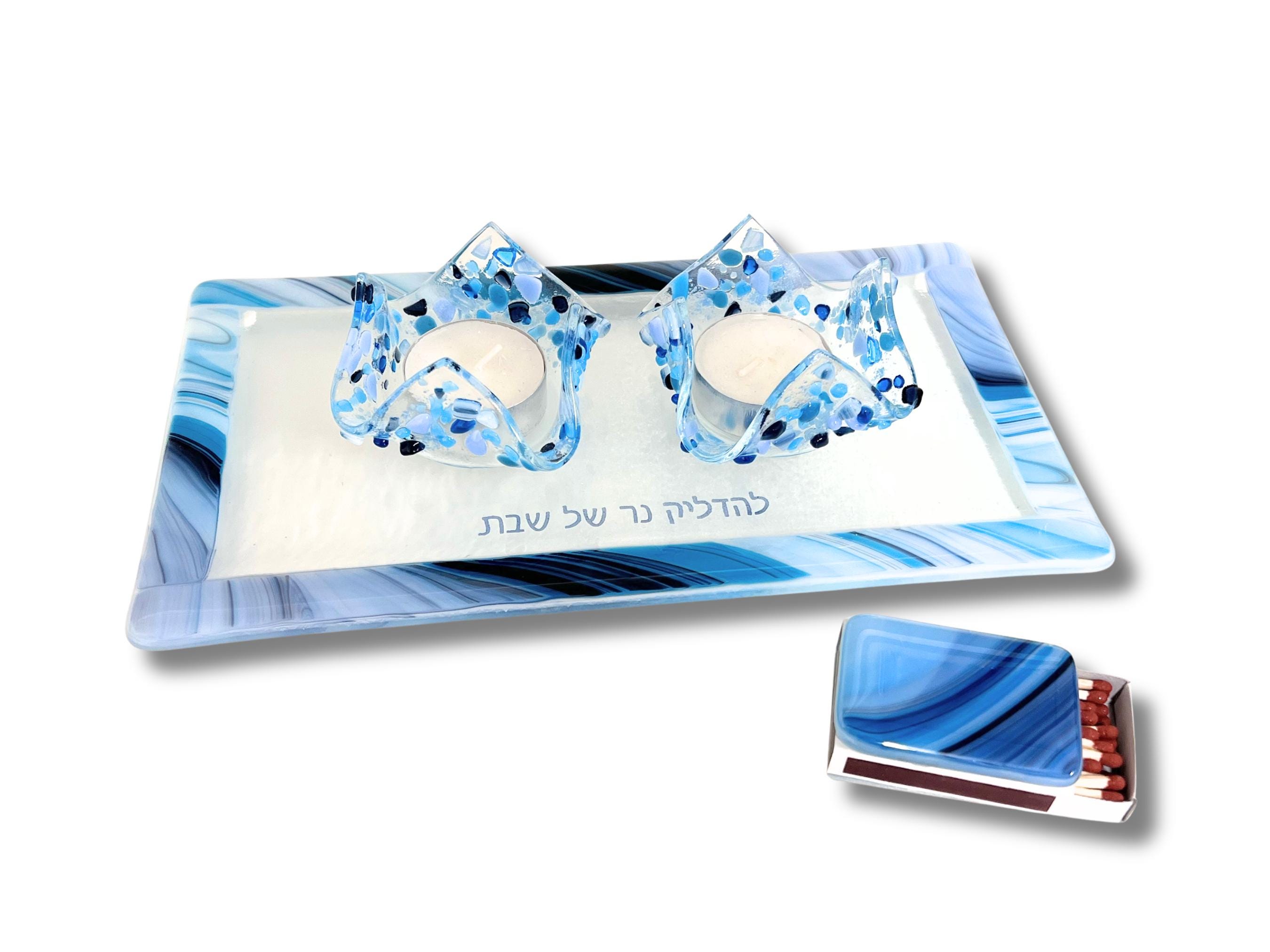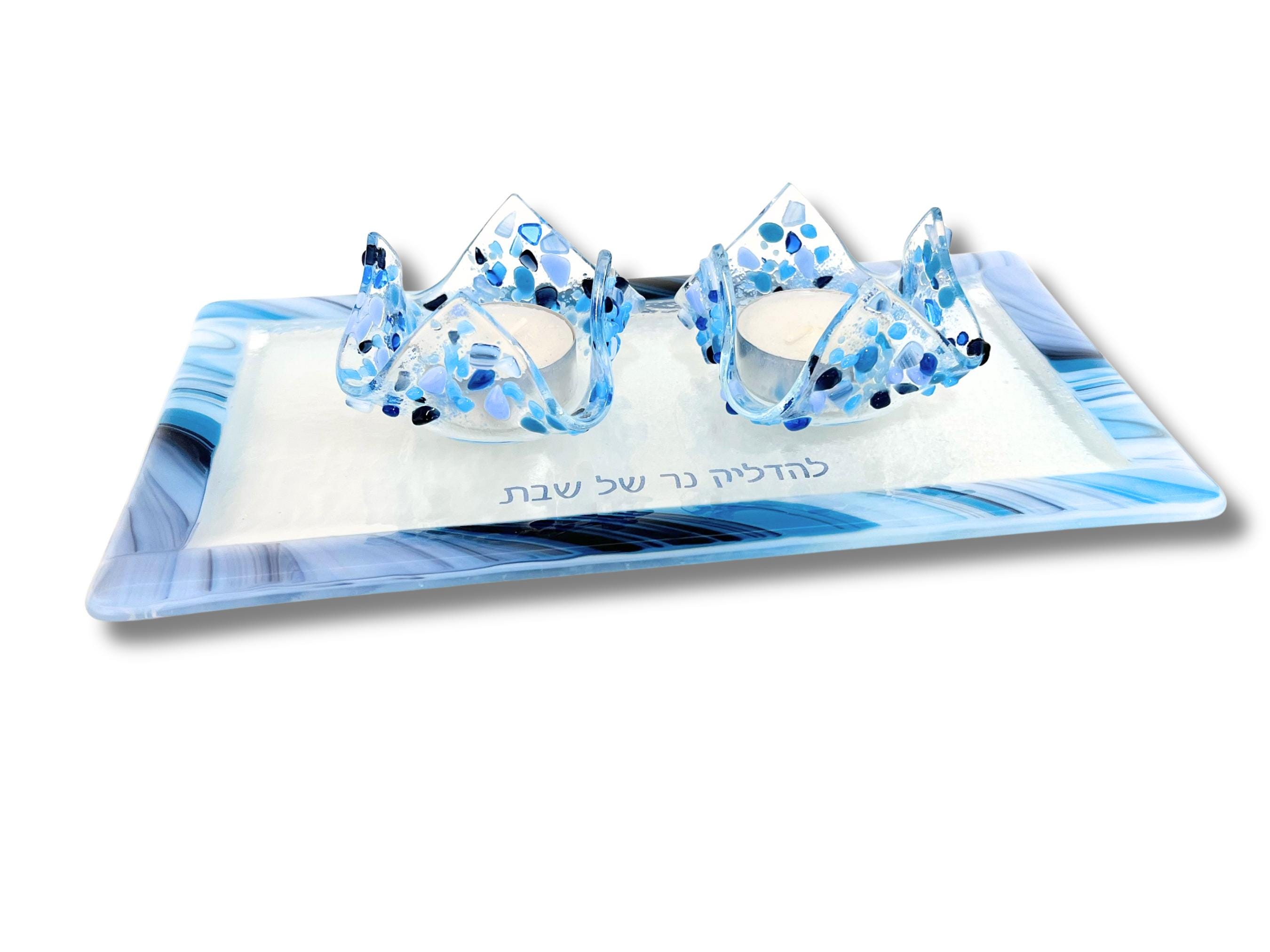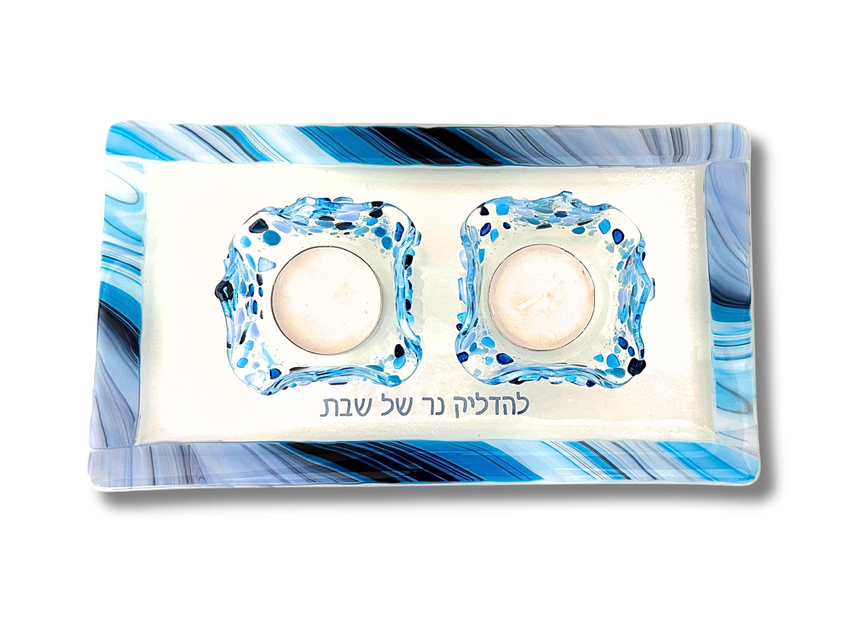 The Hebrew words for the blessing said over the candles is fused onto the glass tray creating a unique Judaica piece.