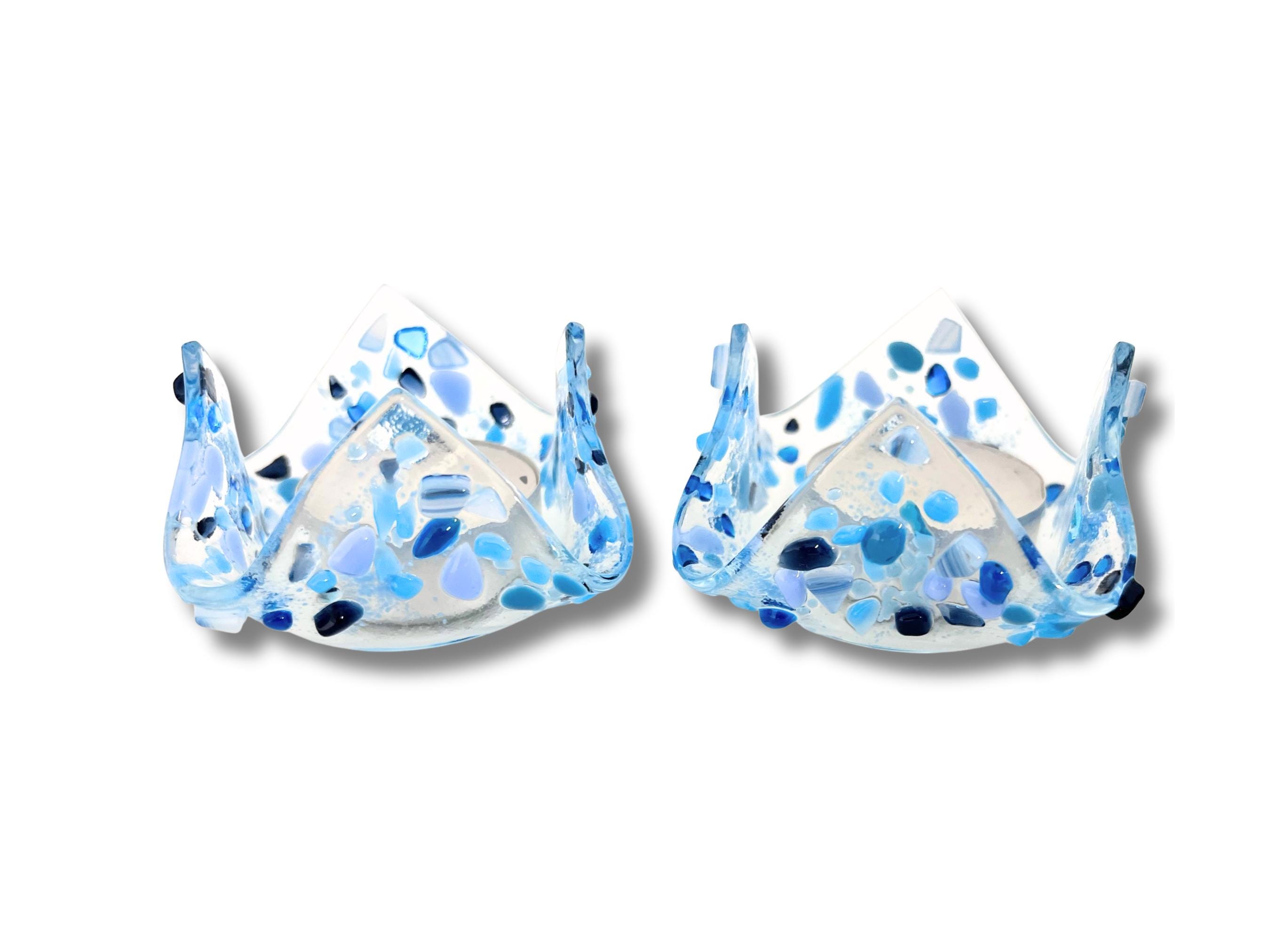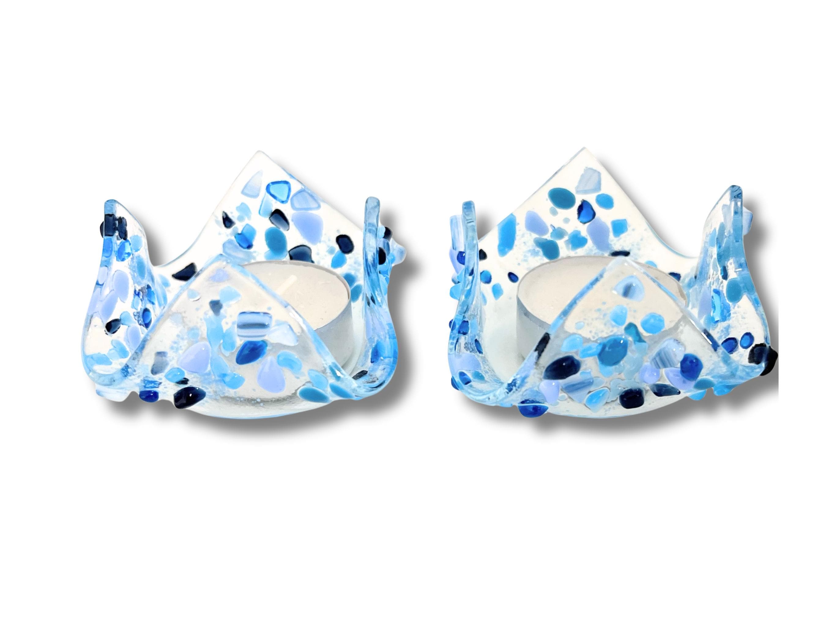 These elegant Shabbat tealight candle holders are made from fused glass. The glass is tack fused so that the pieces of colored glass remain raised yet rounded. Being handmade, each item has slight variations giving you a truly unique set.