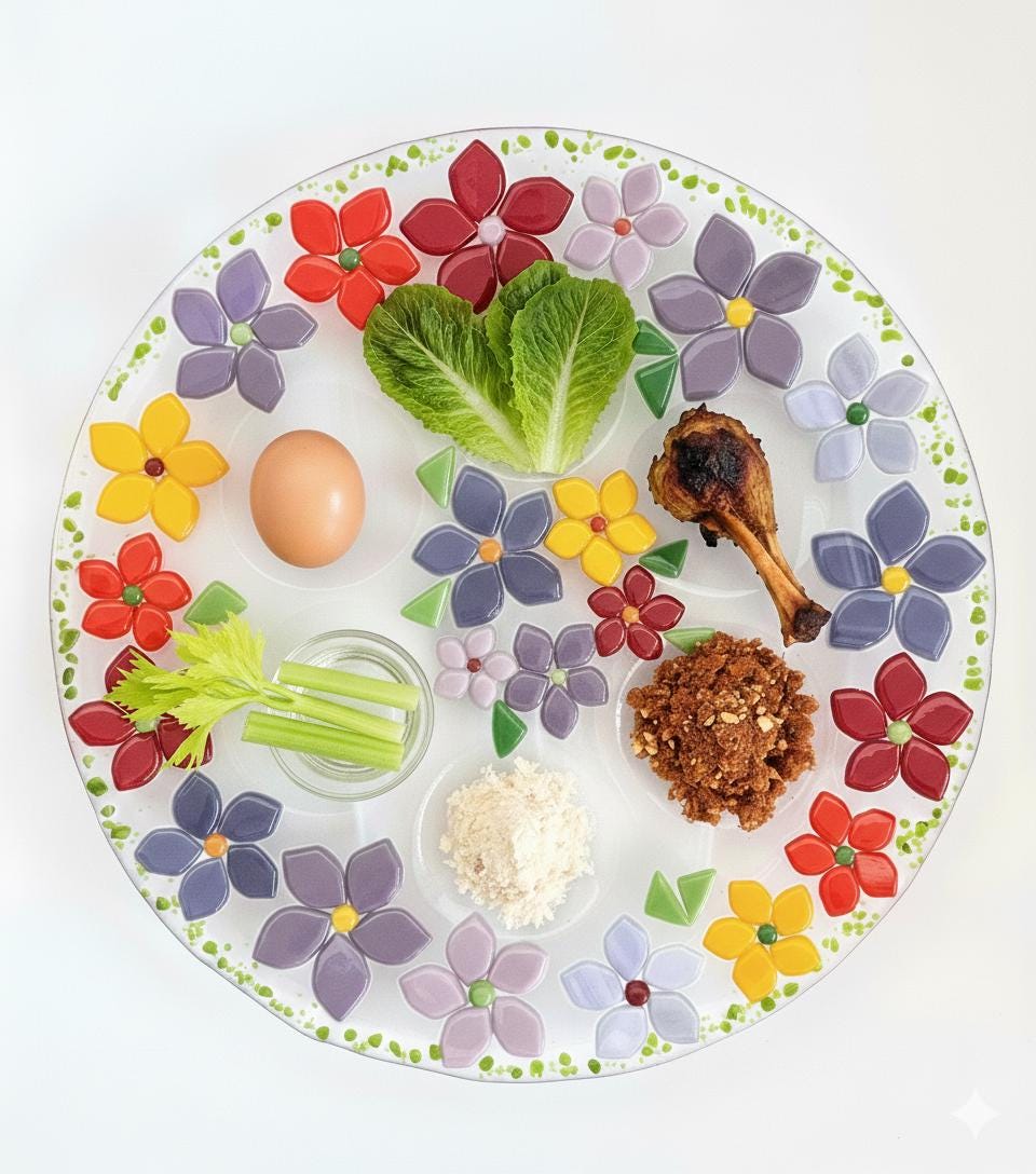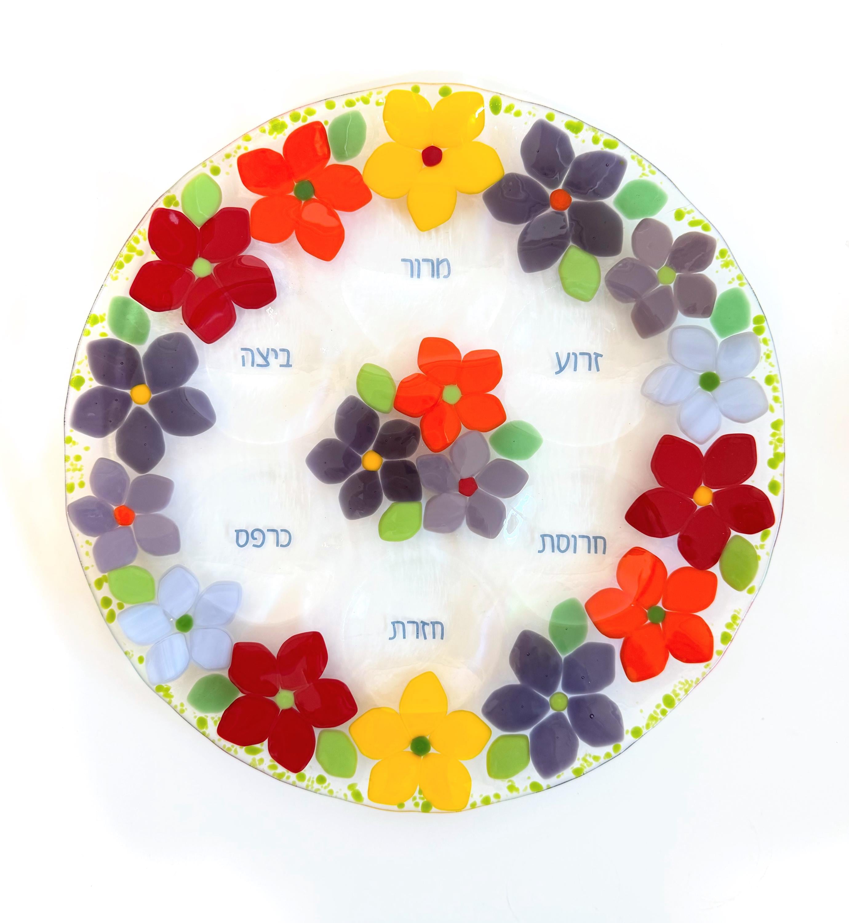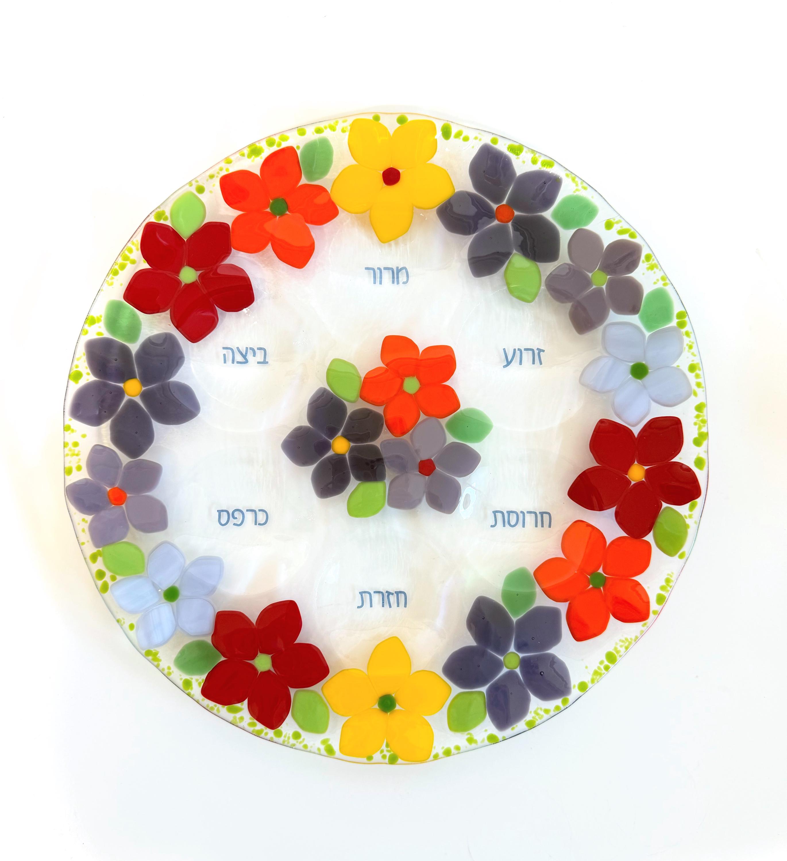 To commemorate the spring holiday of Passover (חג האביב) this unique fused glass Seder plate was designed to be an indoor spring garden!