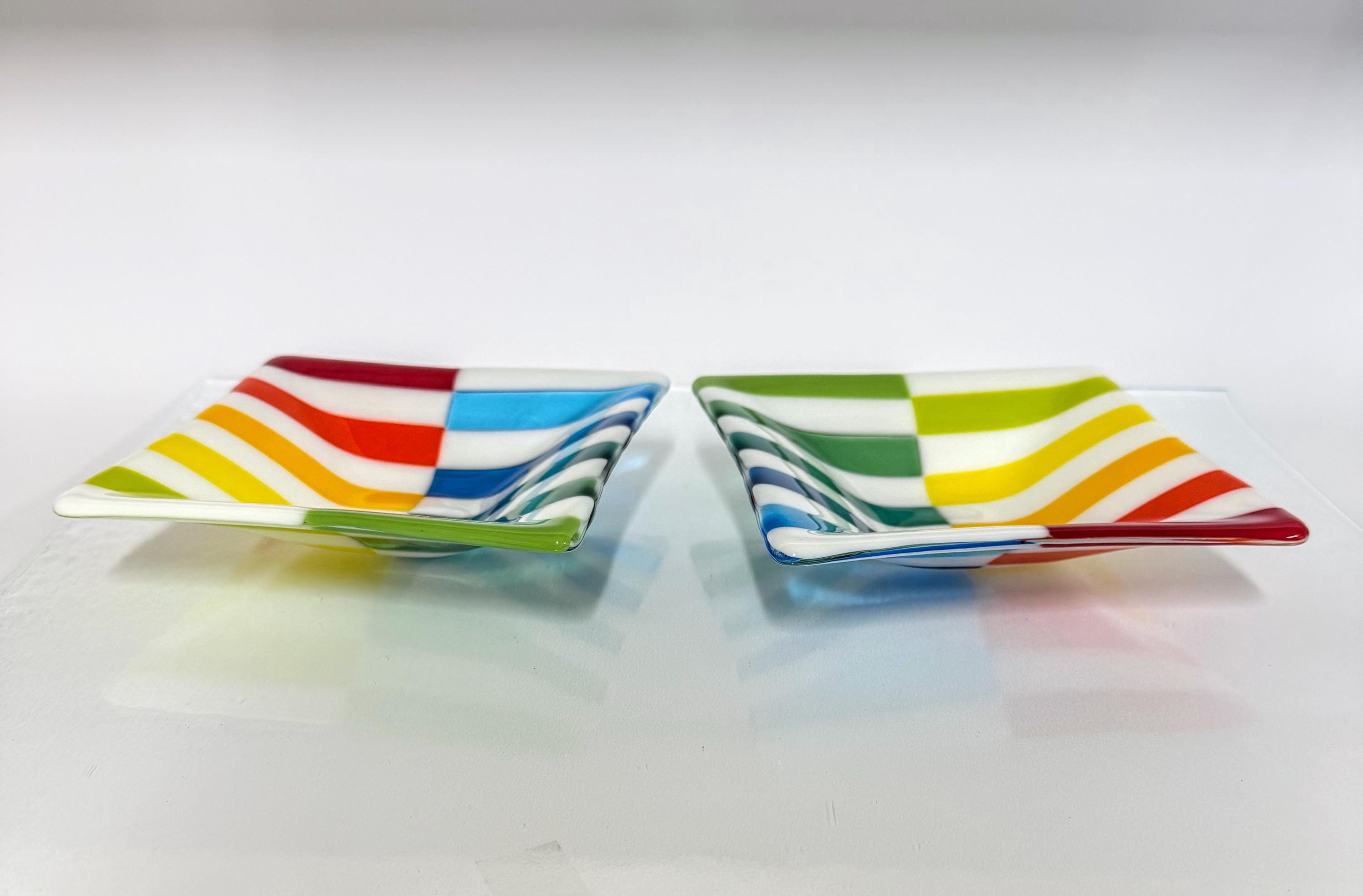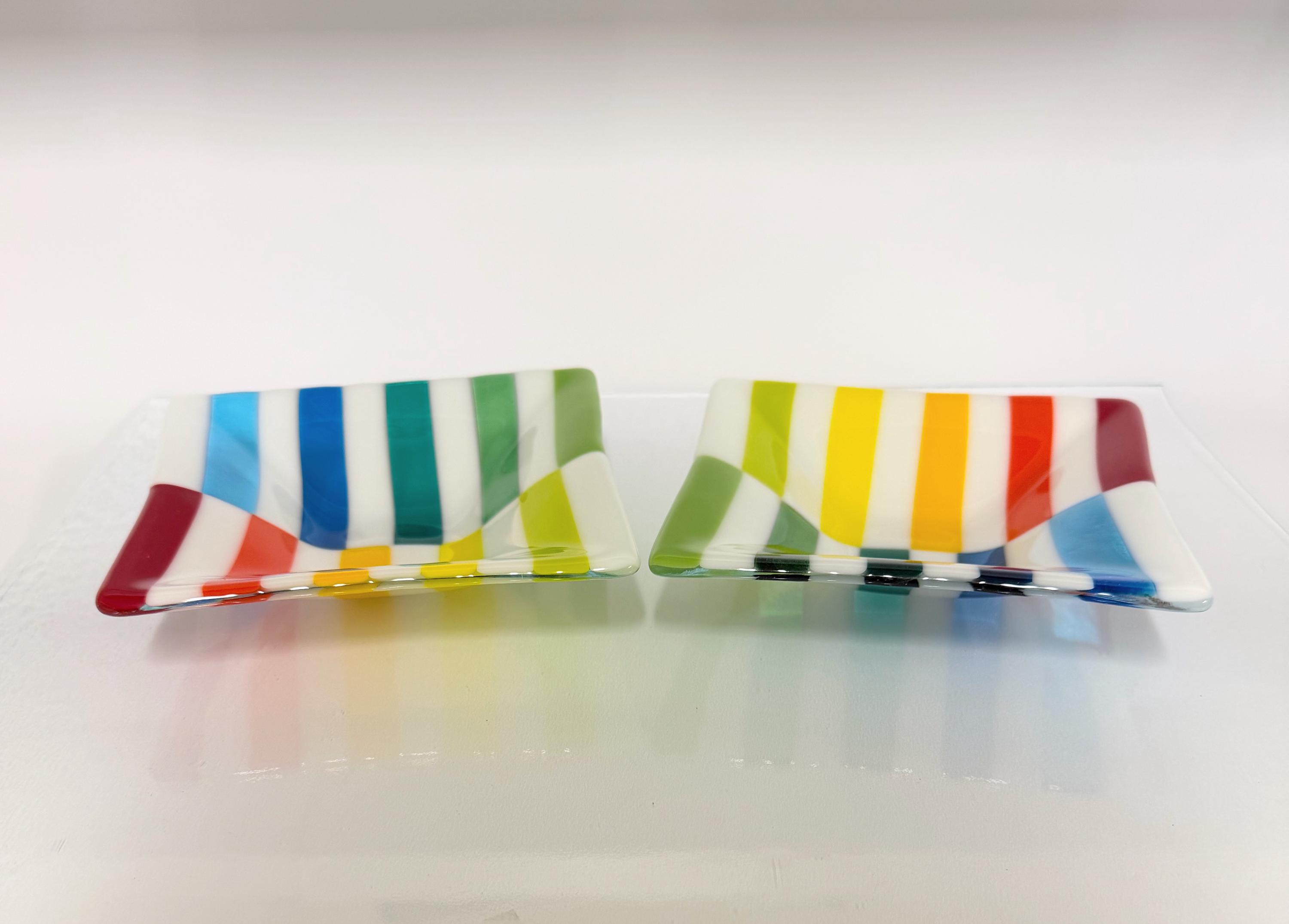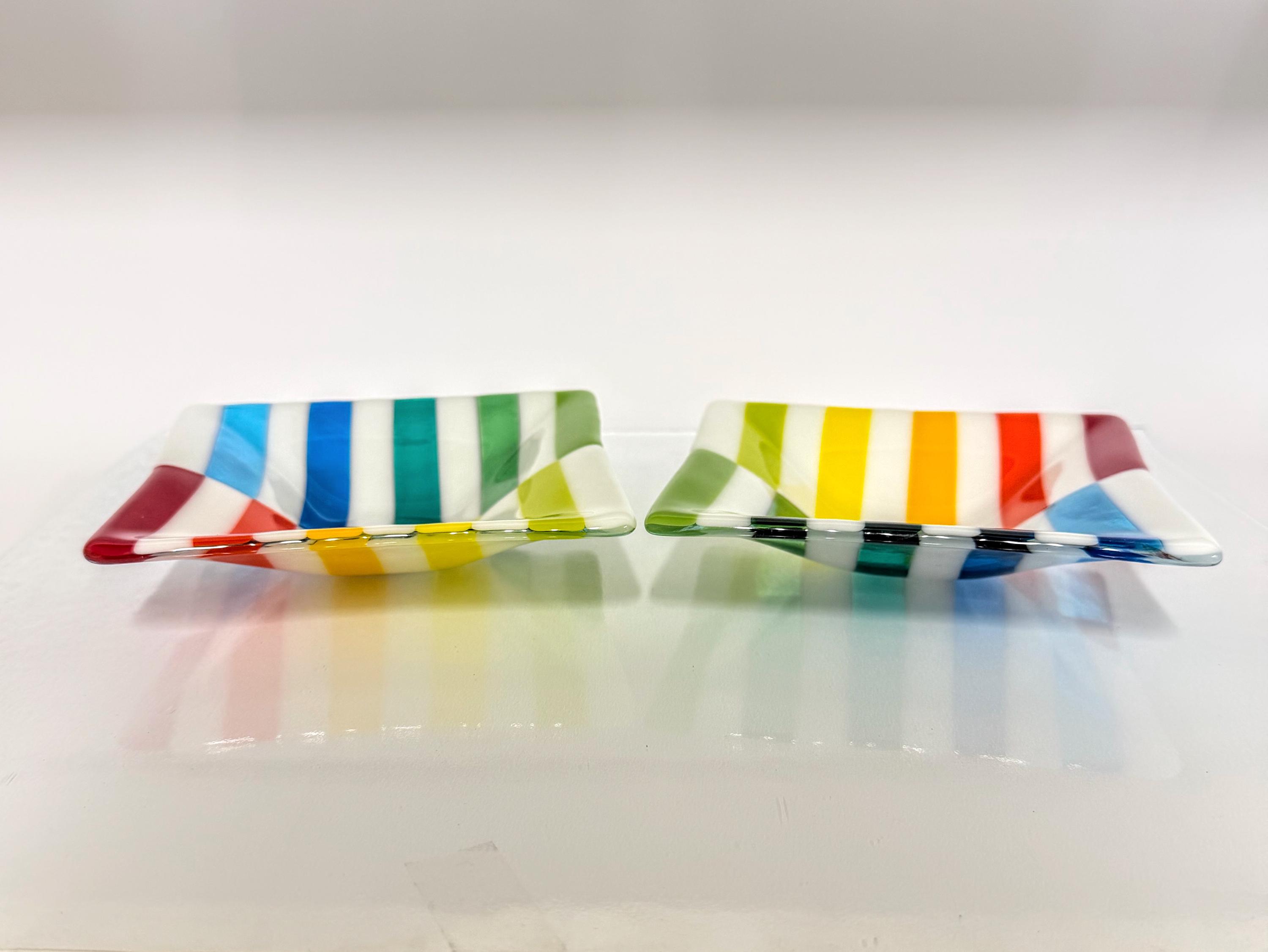 This set of 2 rainbow themed fused glass dishes adds a lively and cheery addition to your home decor. This multipurpose dish can be used as a candy dish or a jewelry dish. It will make your table alive and festive. Enhance your decor with a piece of modern art that has a functional use.