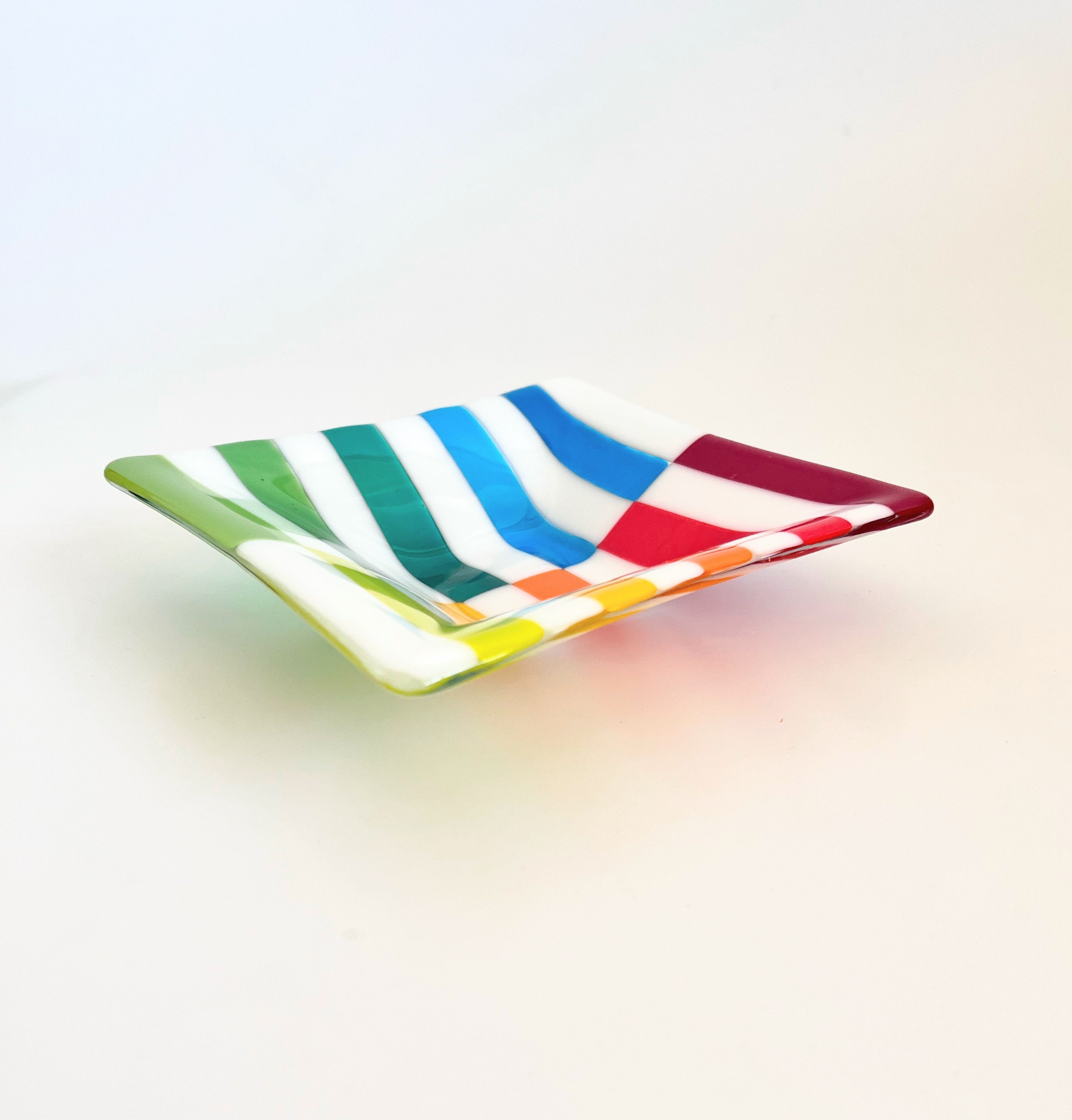 Layers of glass were fused in a kiln at high temperatures to create a smooth and glossy finish. The fused piece was then fired again in a mold to create this beautiful square bowl. This piece is strong and solid.