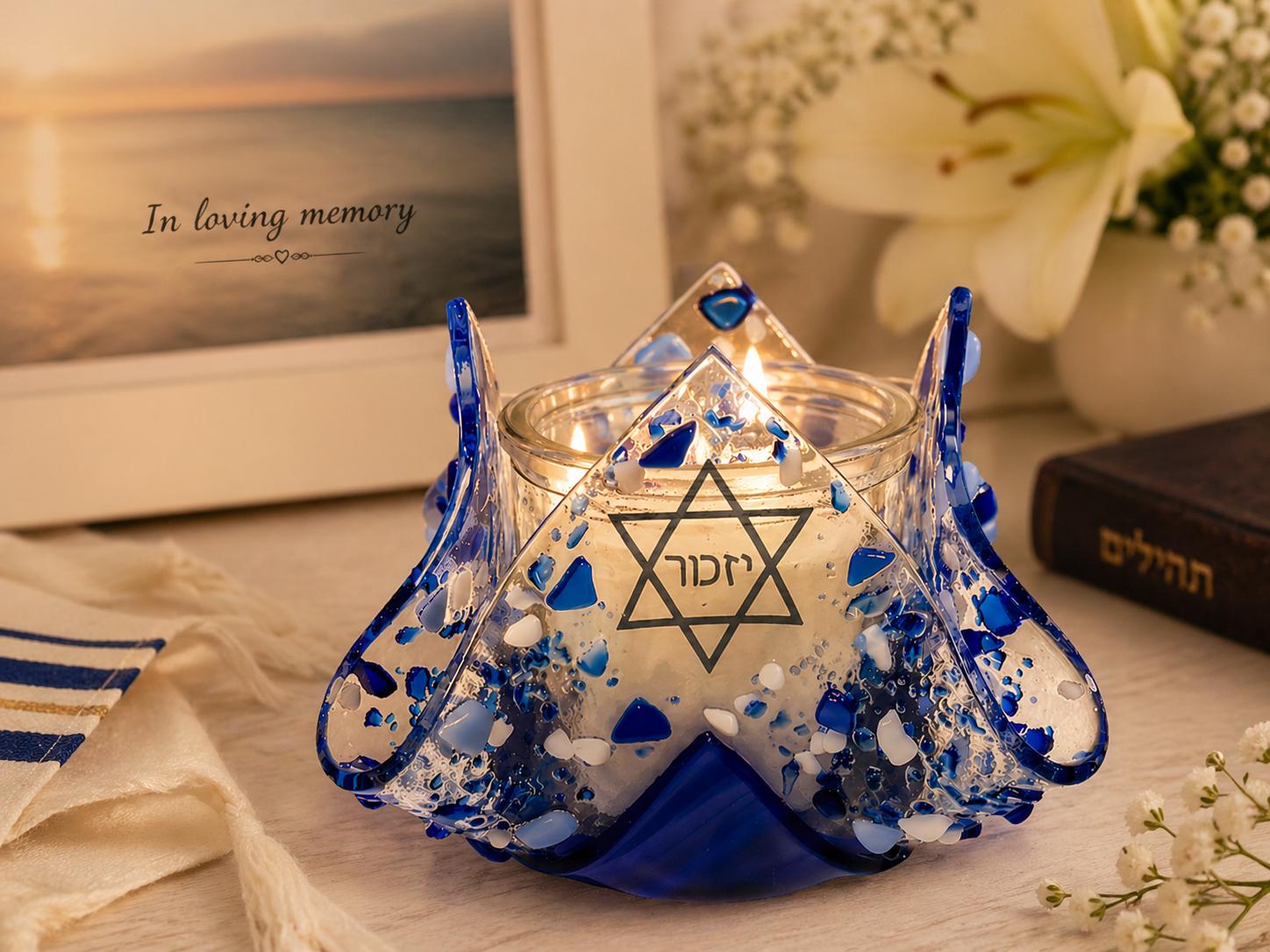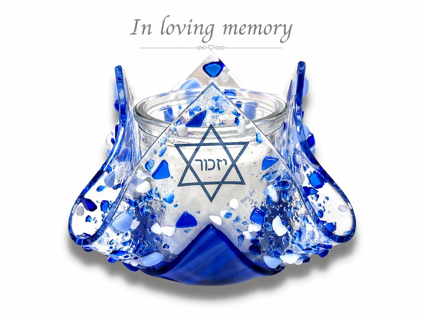 This elegant candle holder is made from fused glass. In Jewish tradition a 24 hour memorial (Yahrzeit) candle is lit on the anniversary of death of a close relative and on certain Jewish holidays when the Yizkor prayer is recited. These candle holders were designed to enhance this tradition allowing the memory of a loved one to be honored in a more beautified fashion.