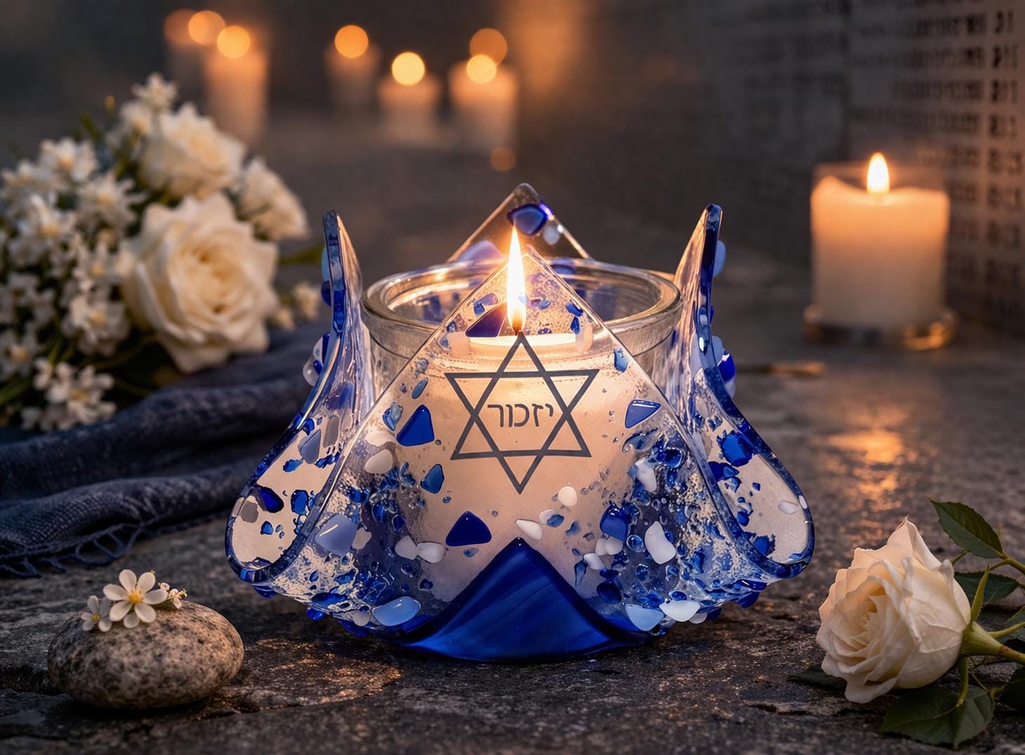 On one corner a Magen David (star of David) with the Hebrew word יזכור (remember) is fused onto the glass.