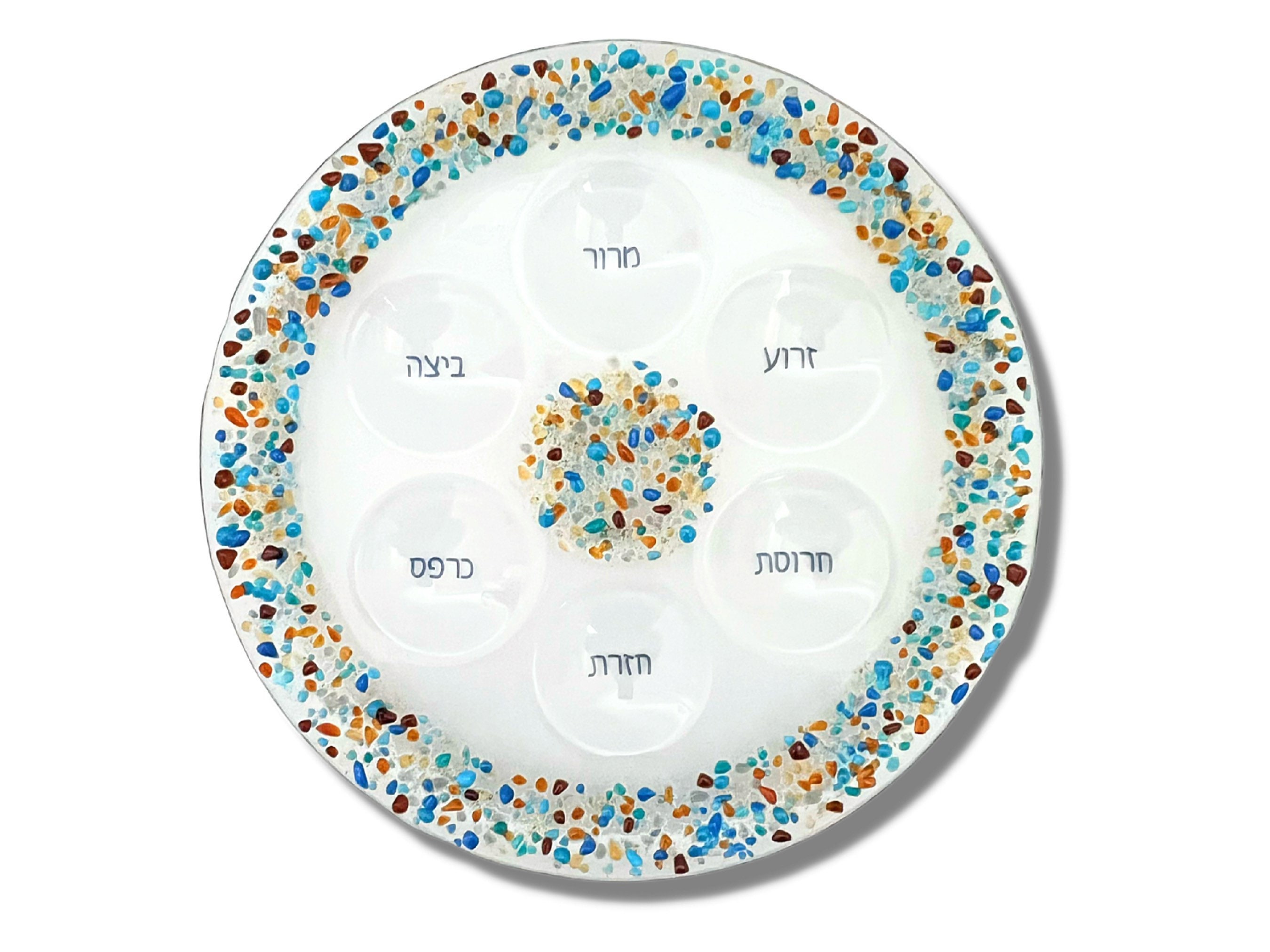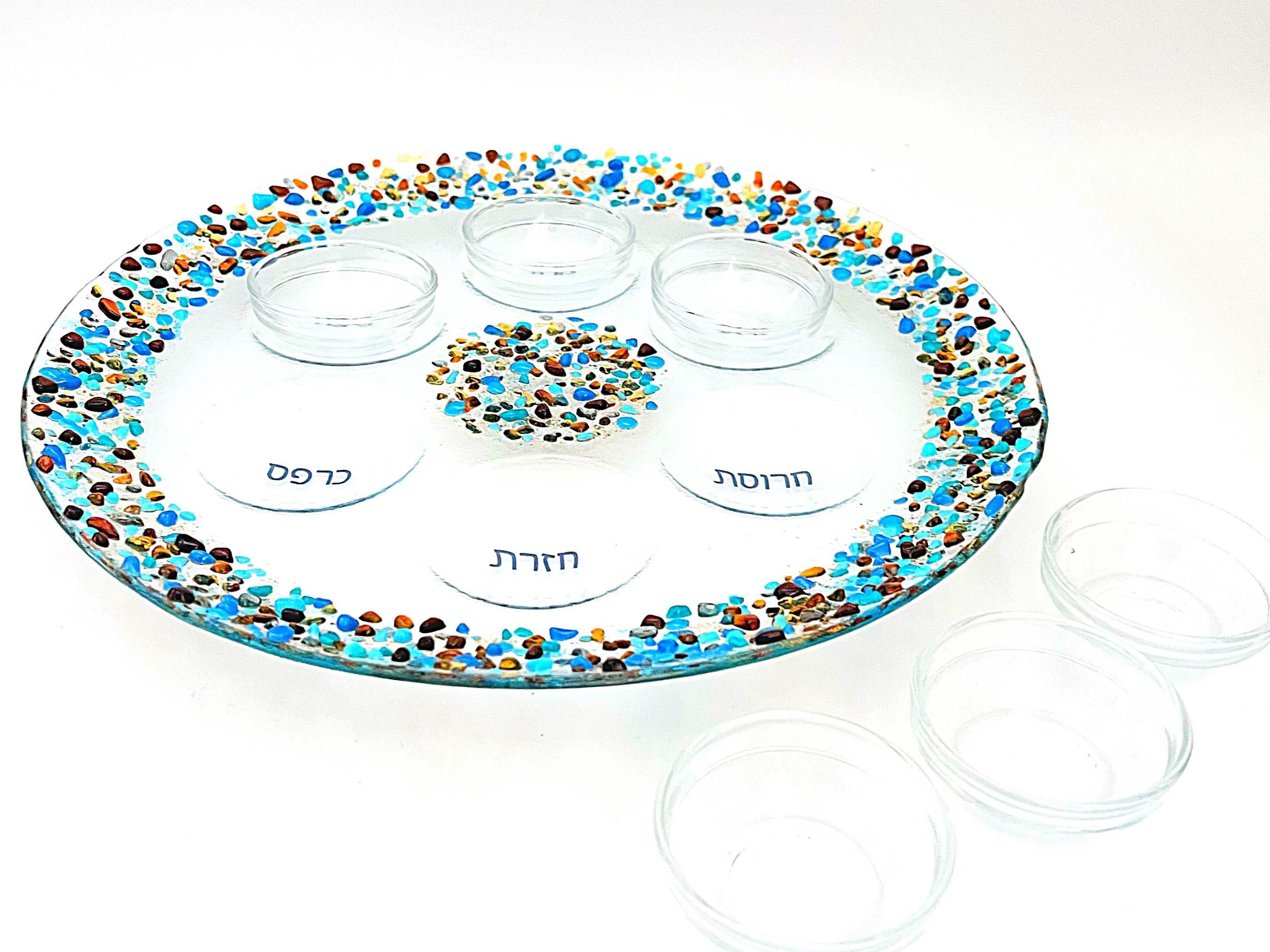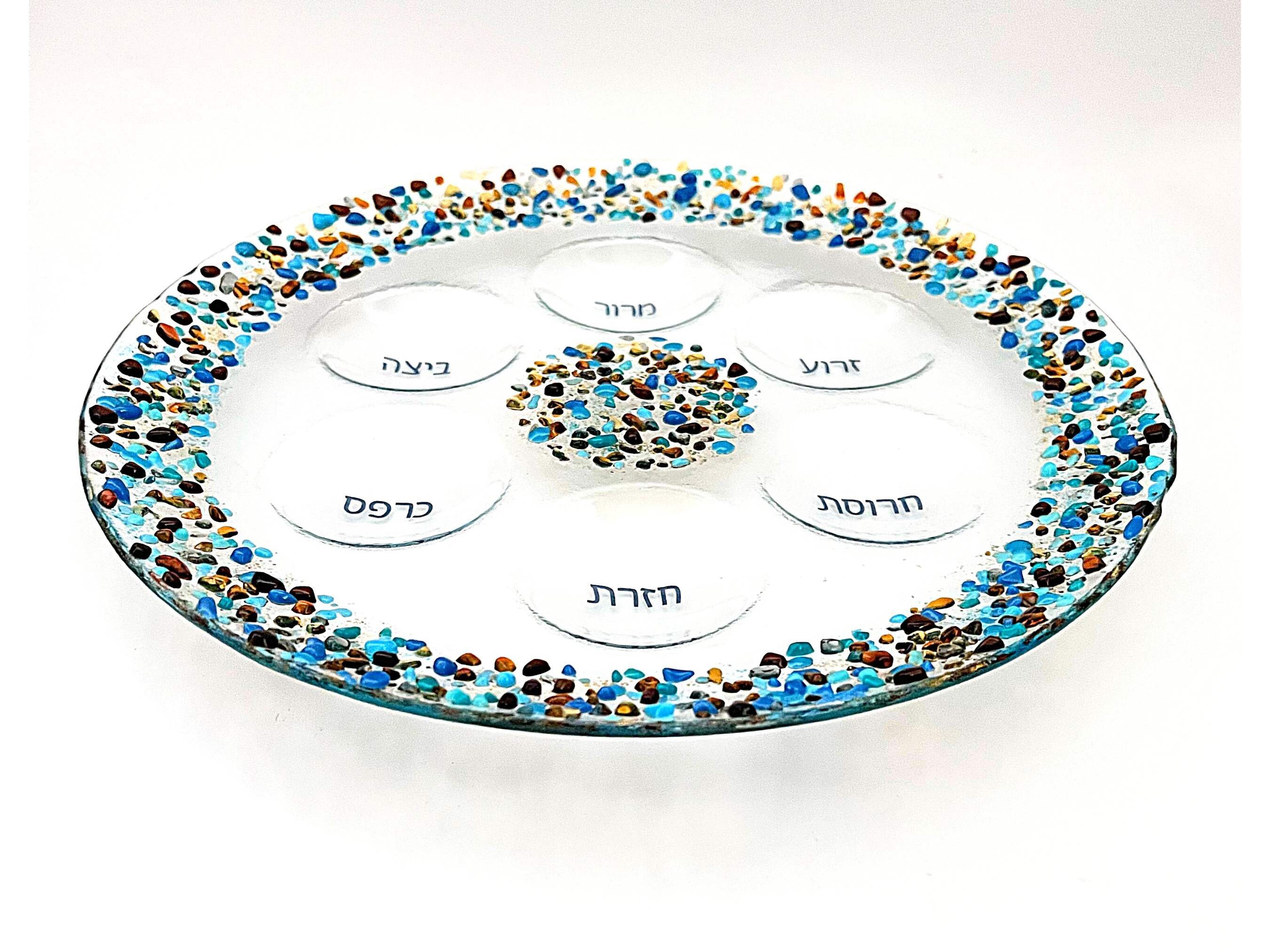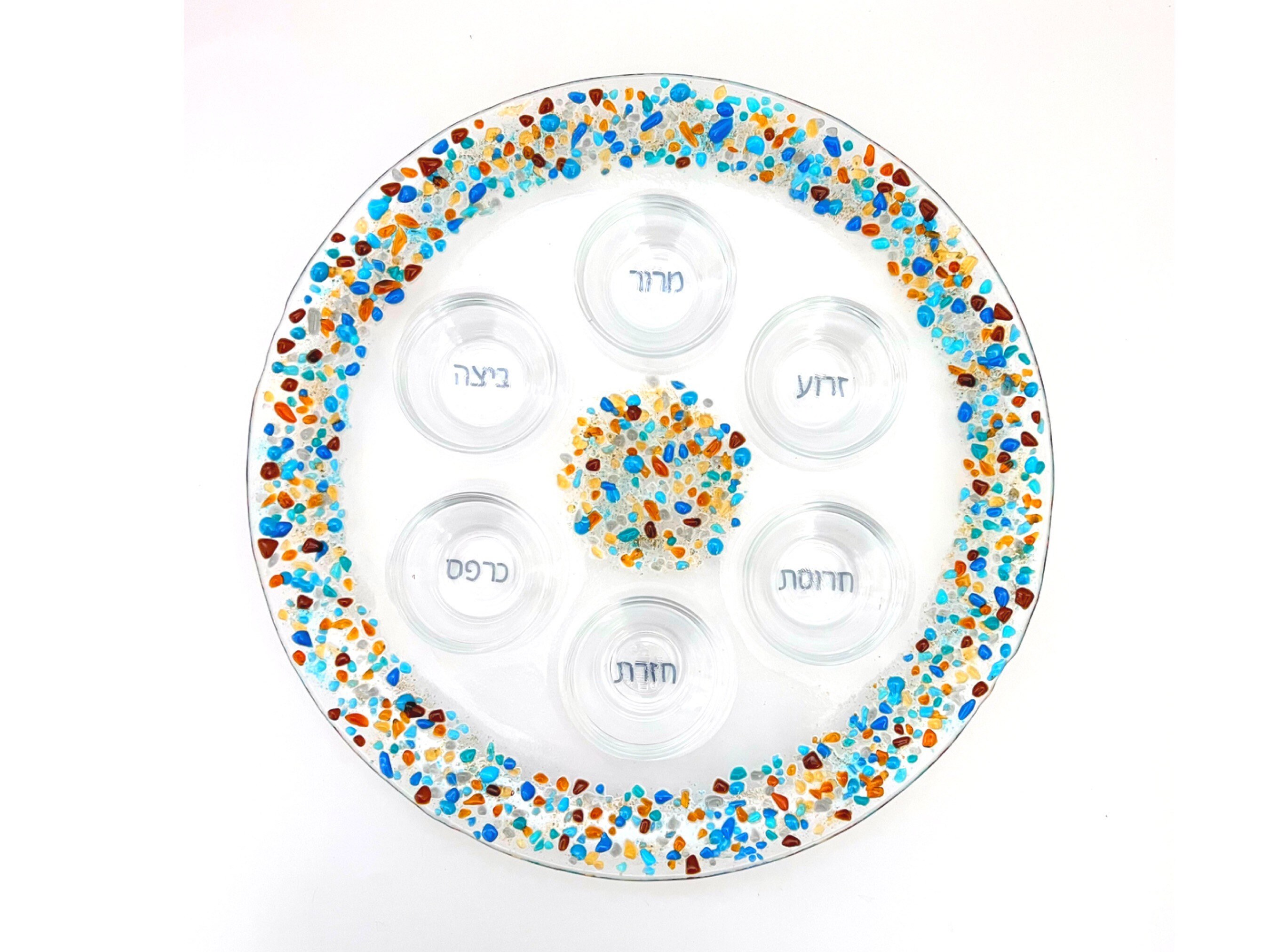 Uniquely designed, this elegant fused glass Seder plate makes a true centerpiece for Passover. It will make your table alive and festive. The border and middle are speckled with colorful crushed glass. The Hebrew words for the symbolic foods on the Seder plate are fused onto the glass.
