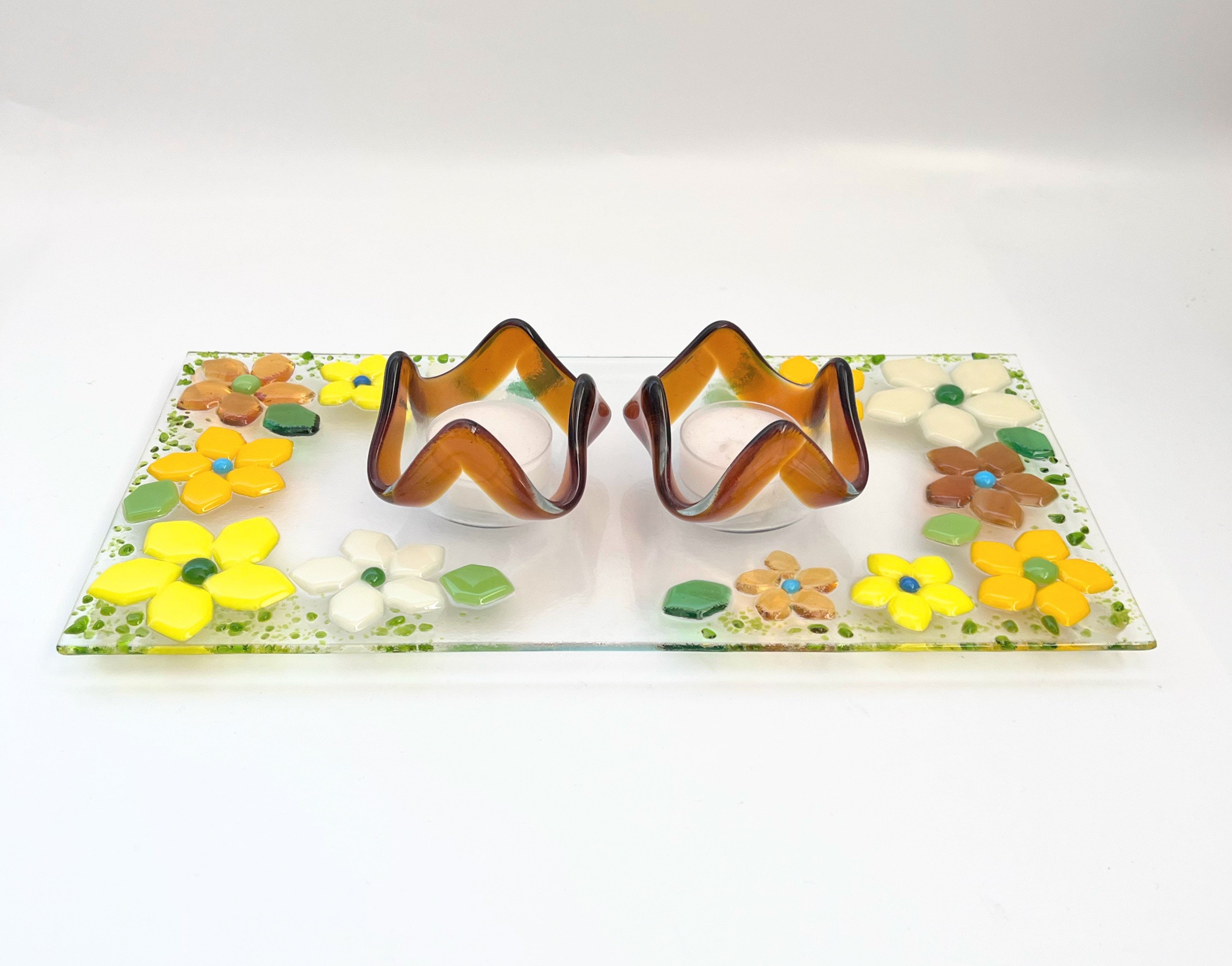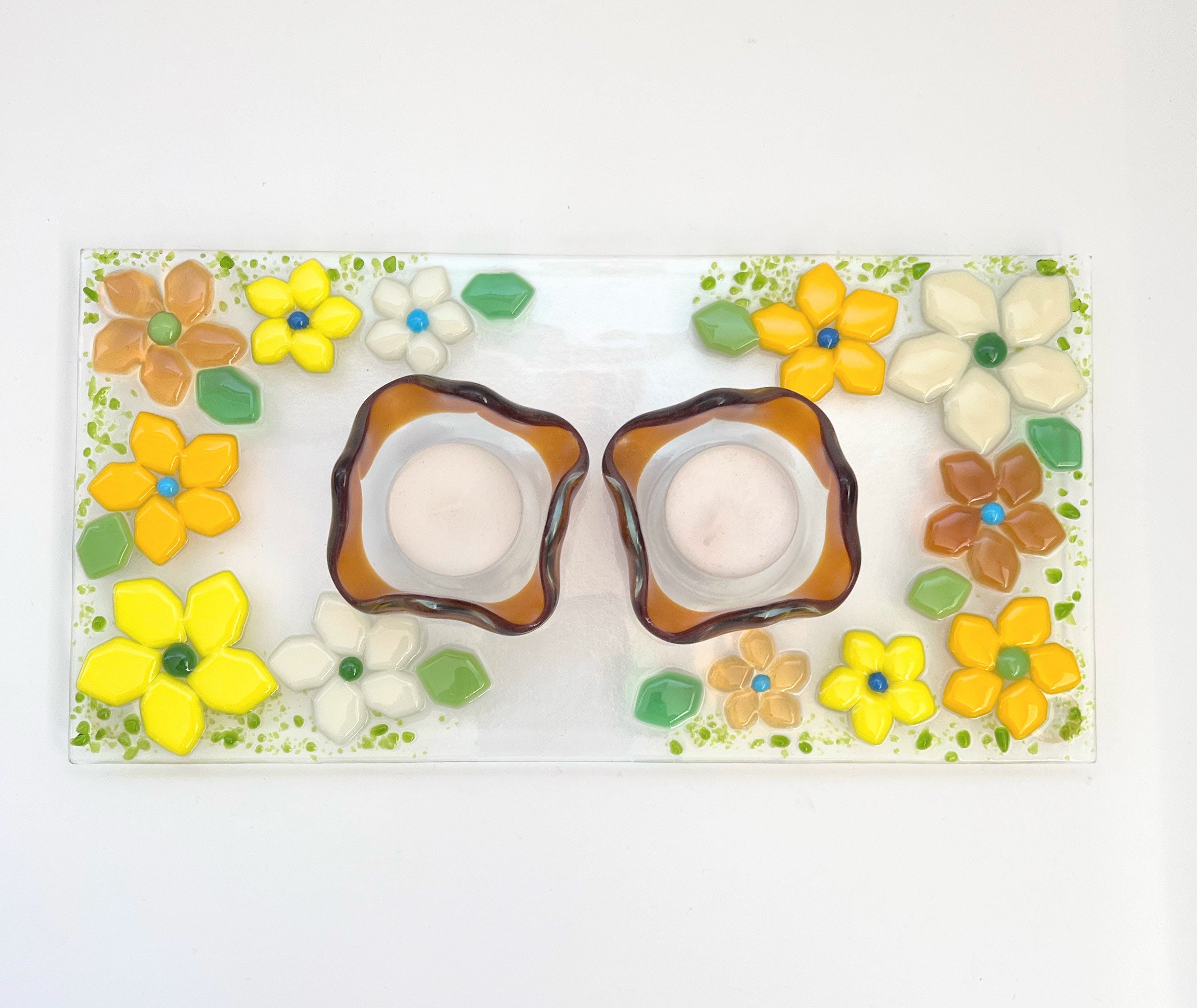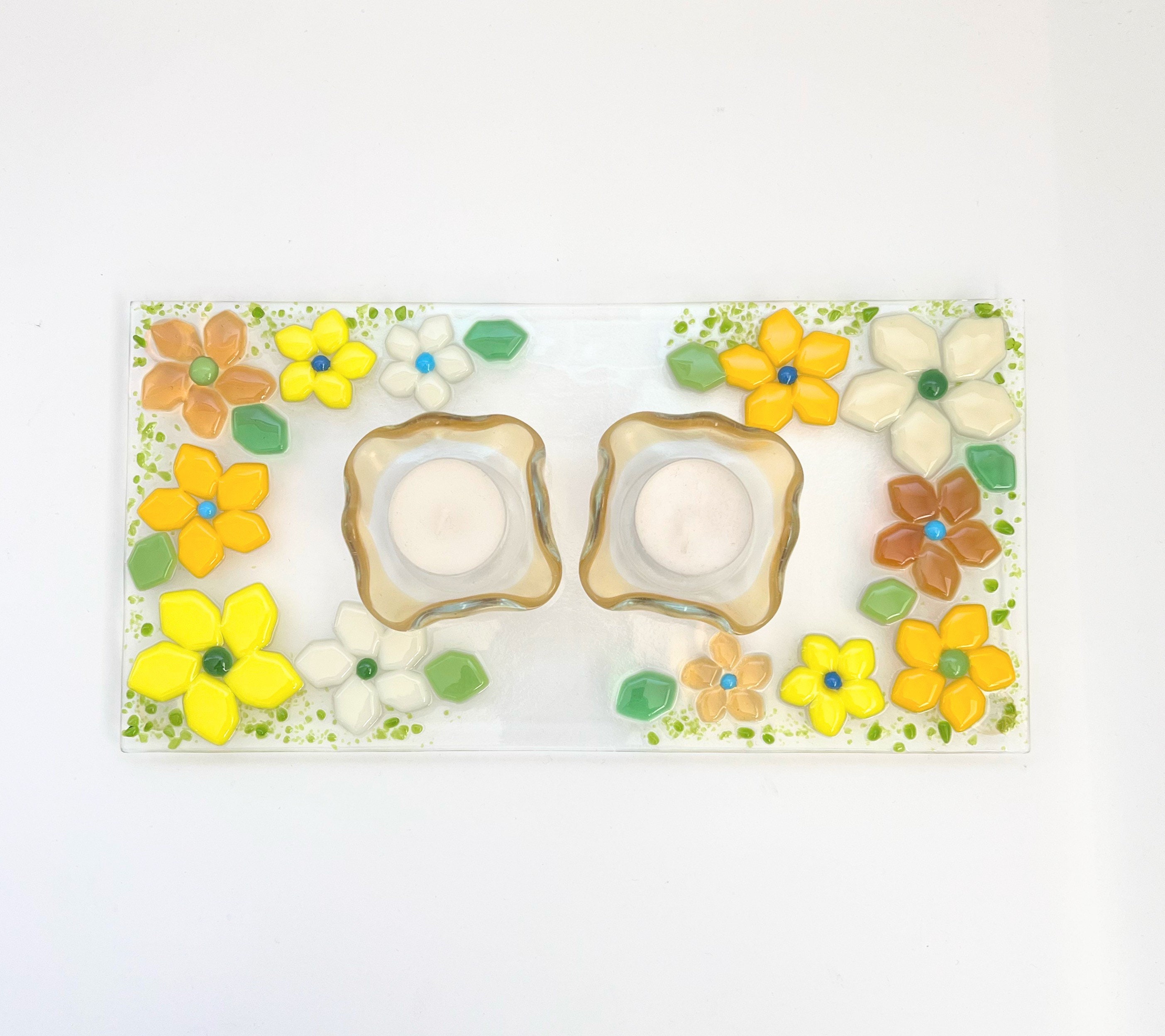 This decorative Shabbat candlestick tray with matching candle holders is a unique and modern Judaica set. The yellow and gold flowers add a gorgeous element to this Jewish ritual.