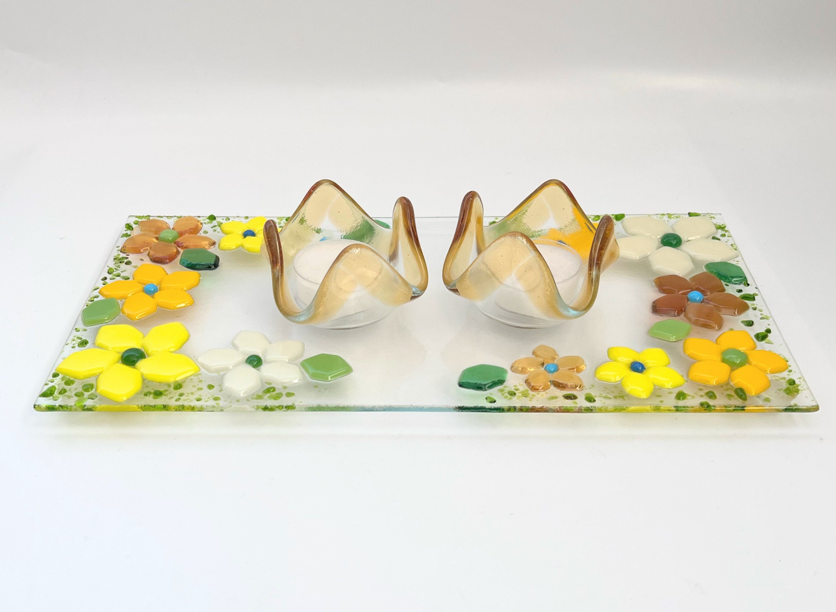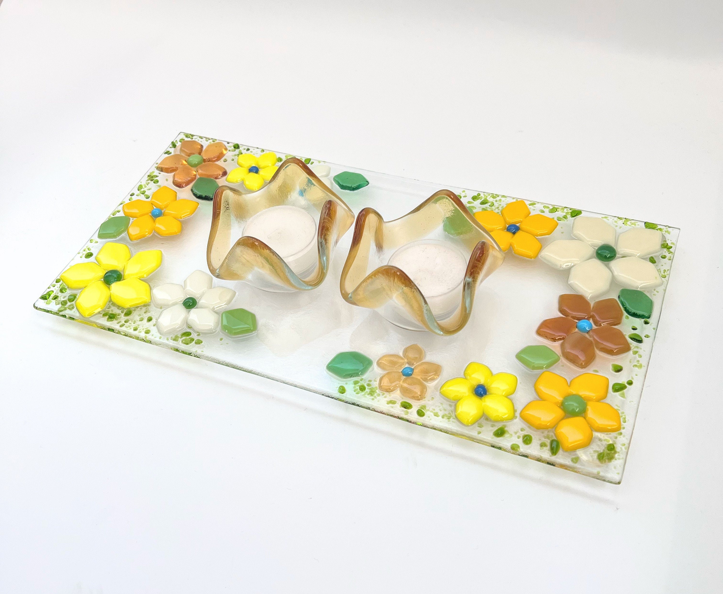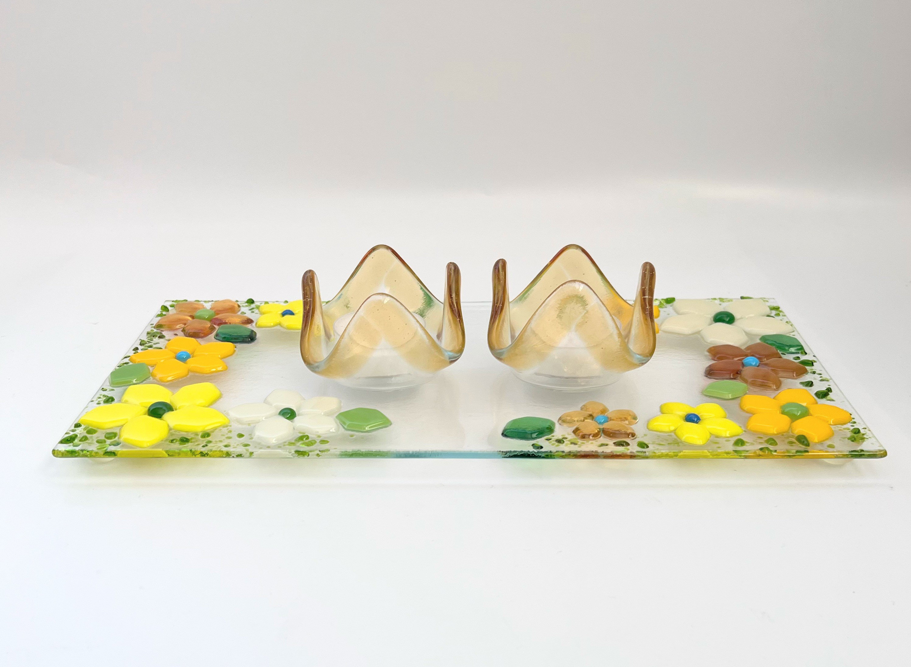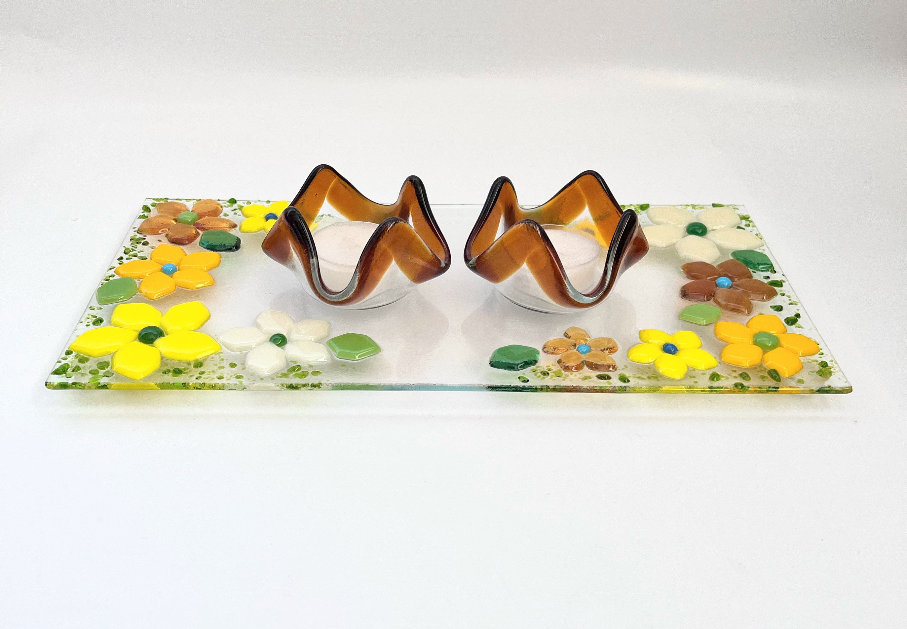 This decorative Shabbat candlestick tray with matching candle holders is a unique and modern Judaica set. The yellow and gold flowers add a gorgeous element to this Jewish ritual.
