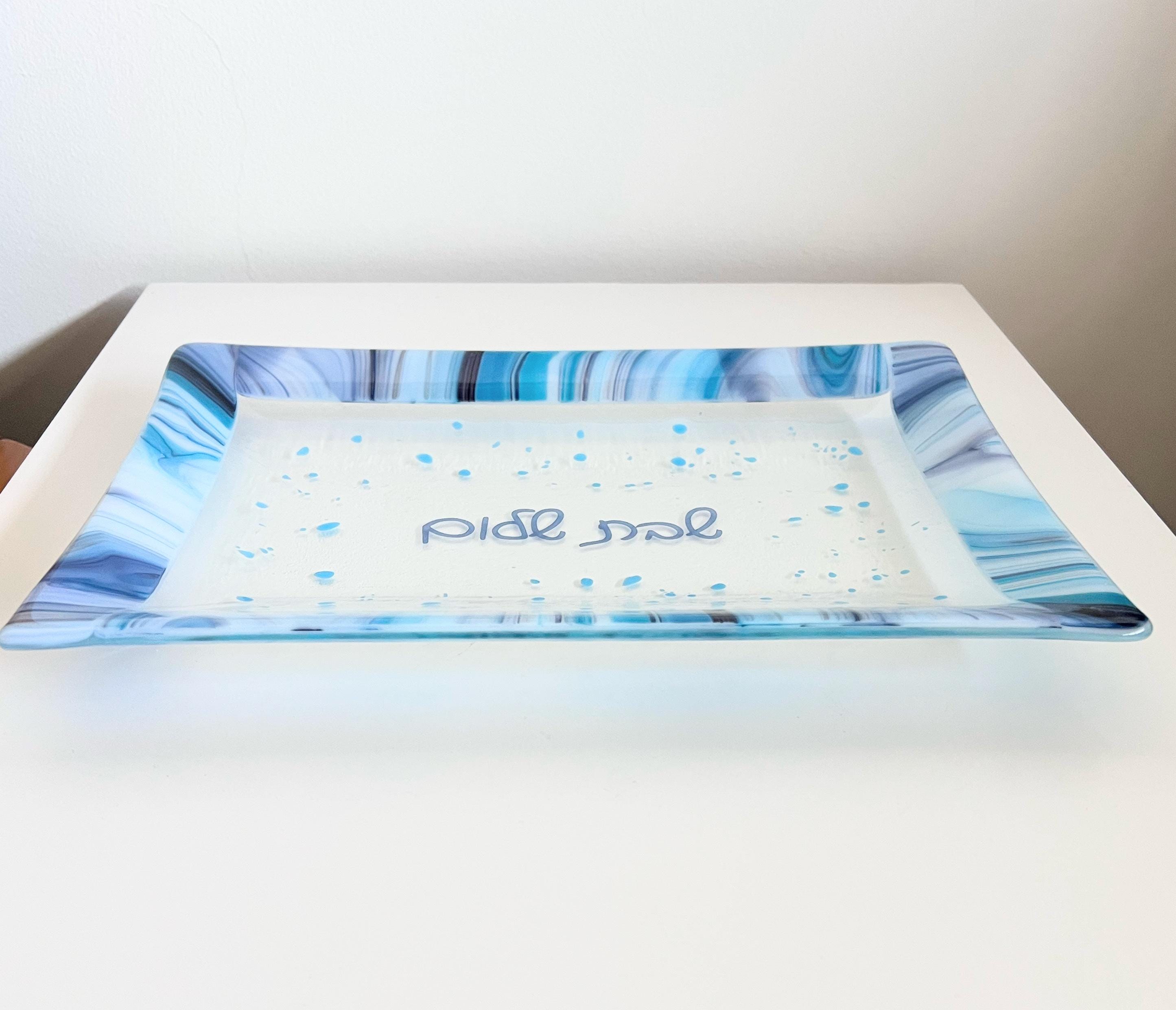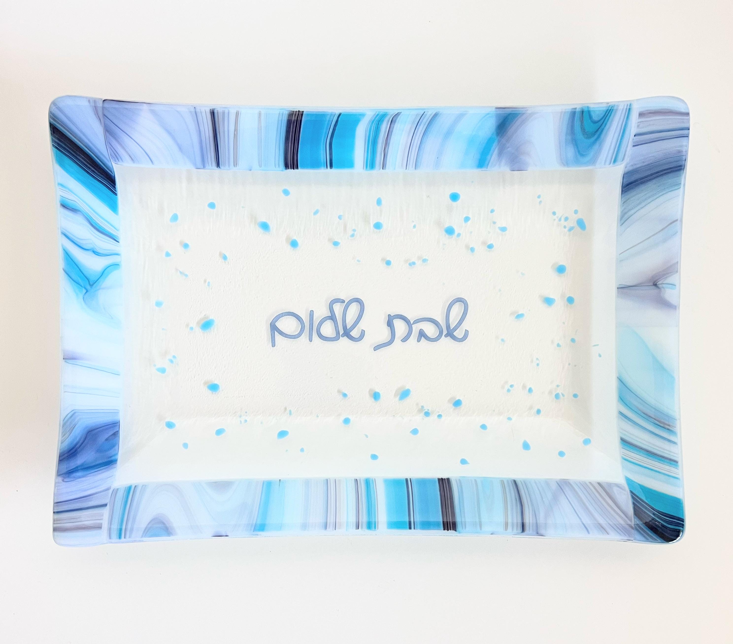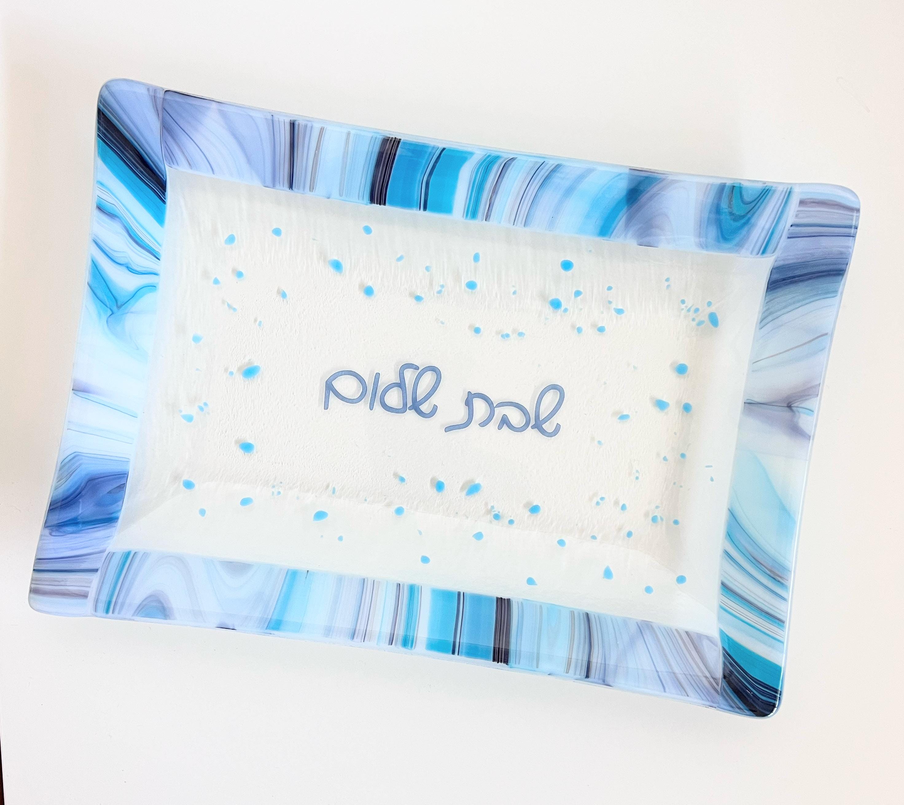 This glass piece was thoughtfully designed and carefully handcrafted. It is an artistic yet functional piece. It can be used as a tray to pass around the challah on Shabbat. The Hebrew word for Shabbat Shalom is fused onto the glass.