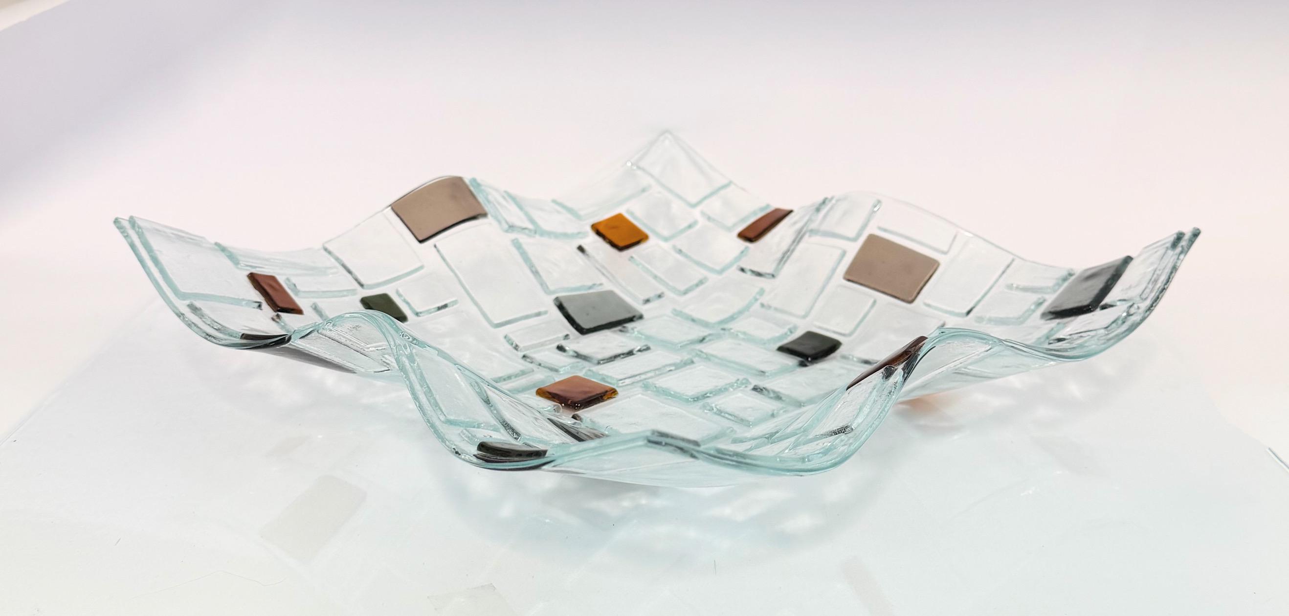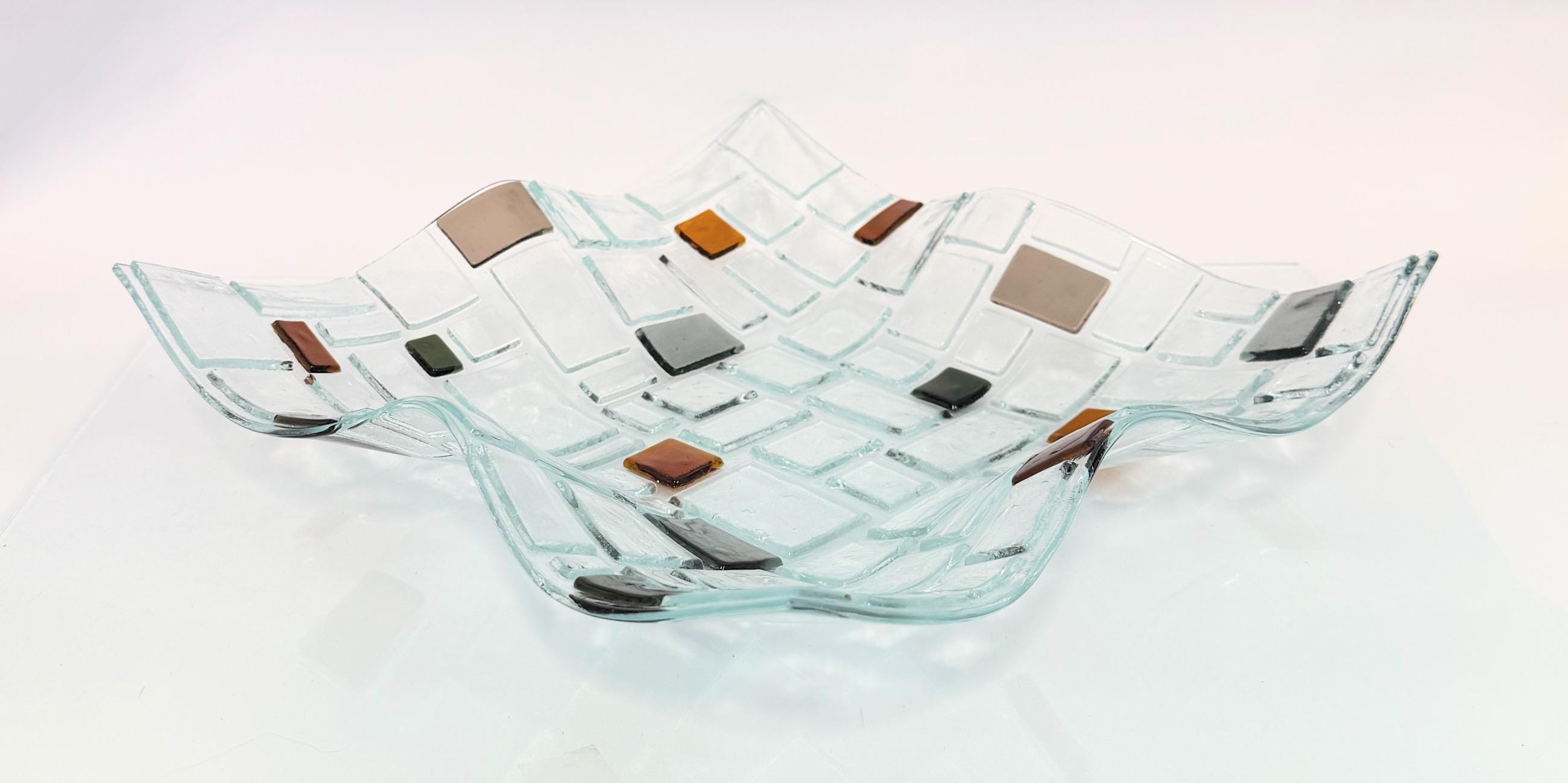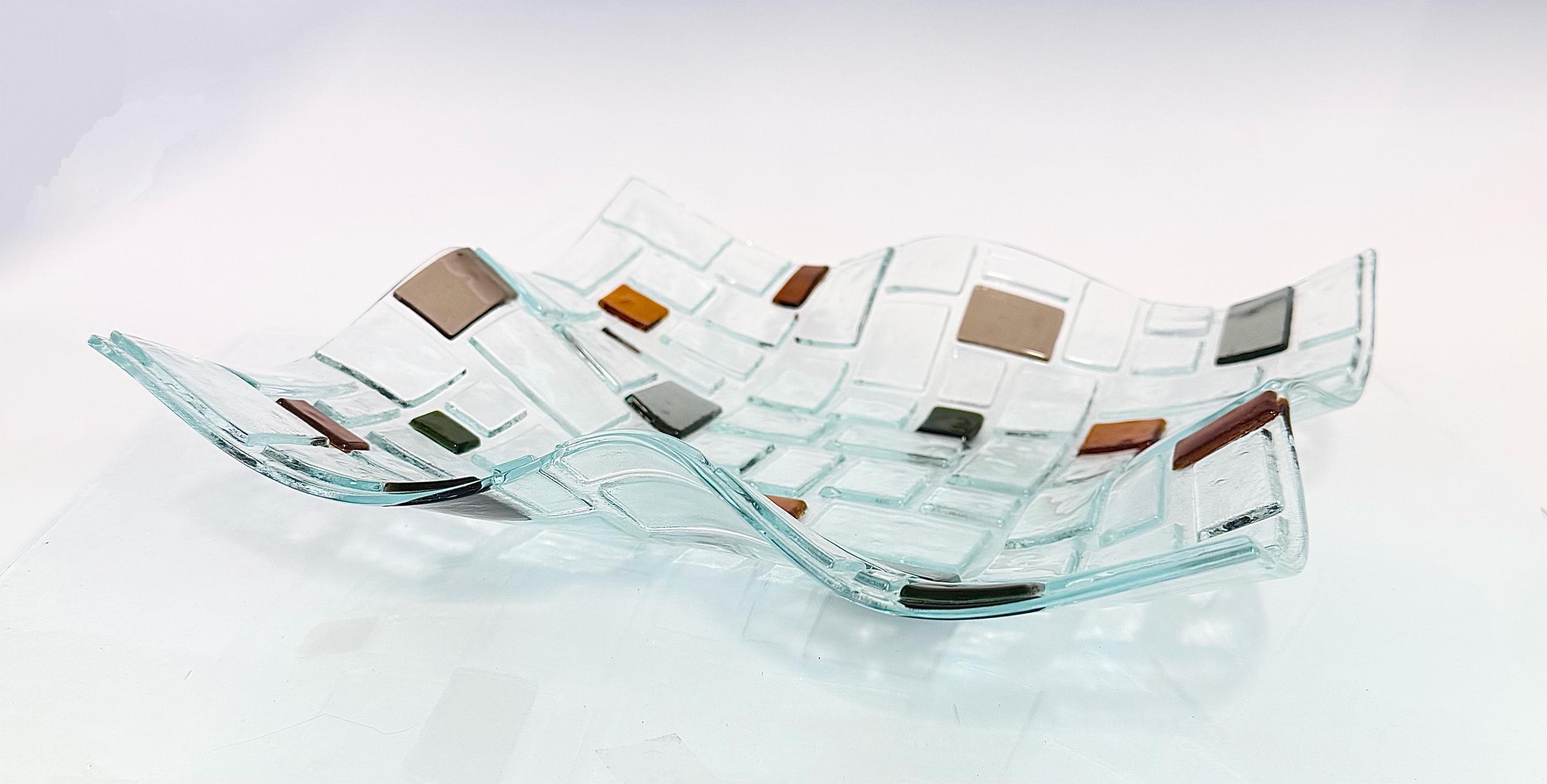 This striking clear glass bowl with a sculptural wavy shape and embedded earth-toned accent tiles is a true modern classic. Handcrafted in my studio, each piece is kiln-fused and slumped to form a flowing, organic silhouette — perfect as a fruit bowl, centerpiece, or sculptural art object.