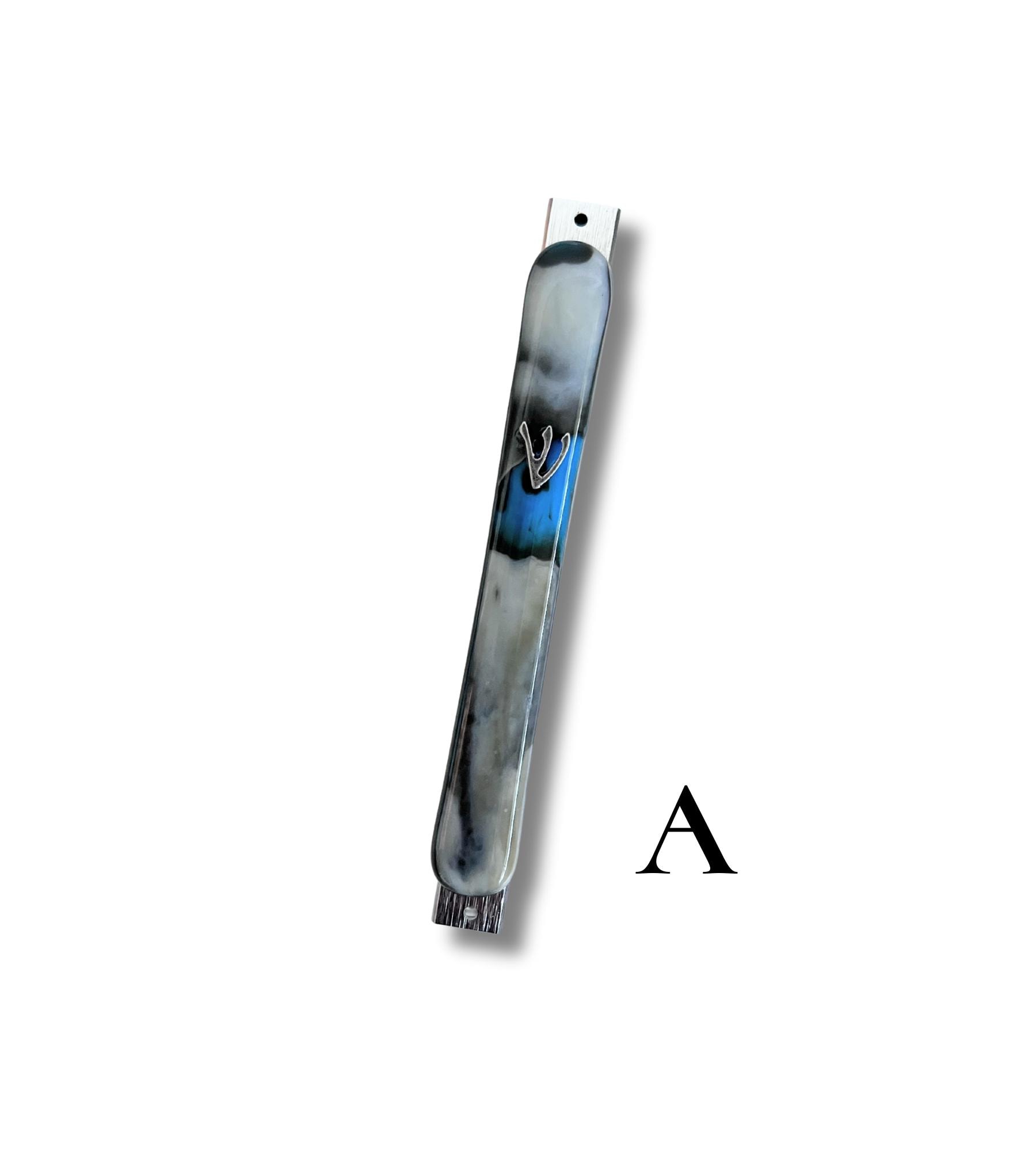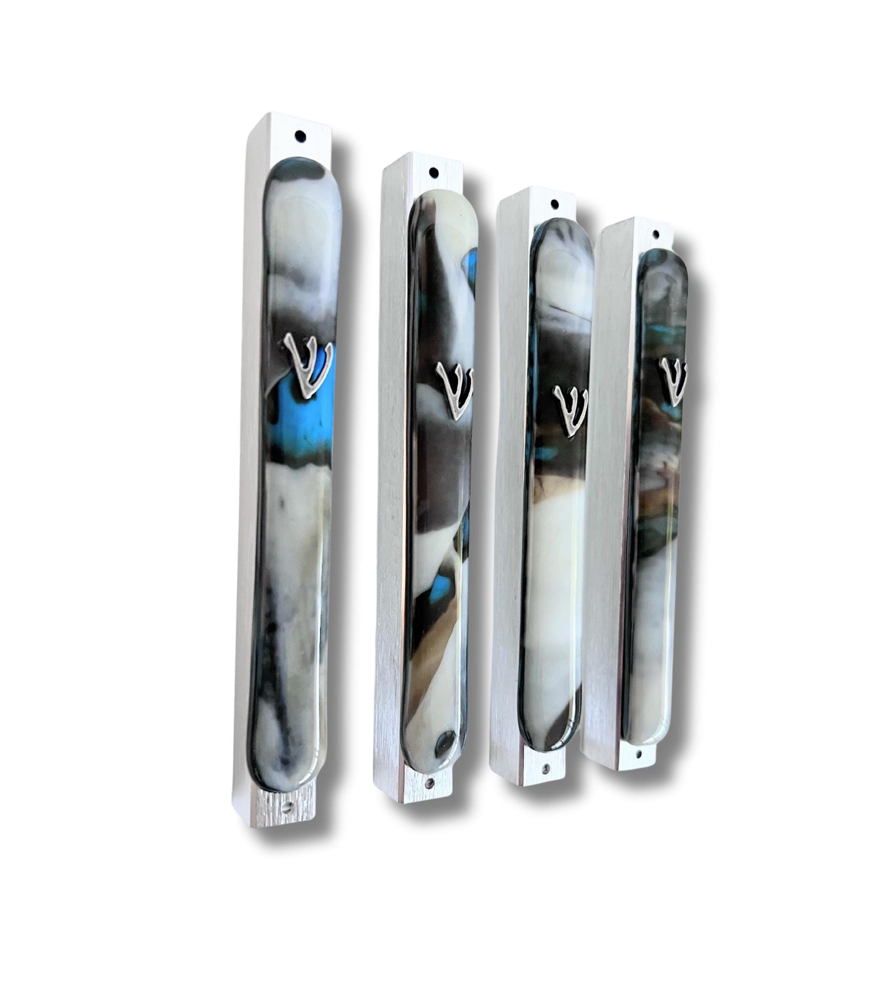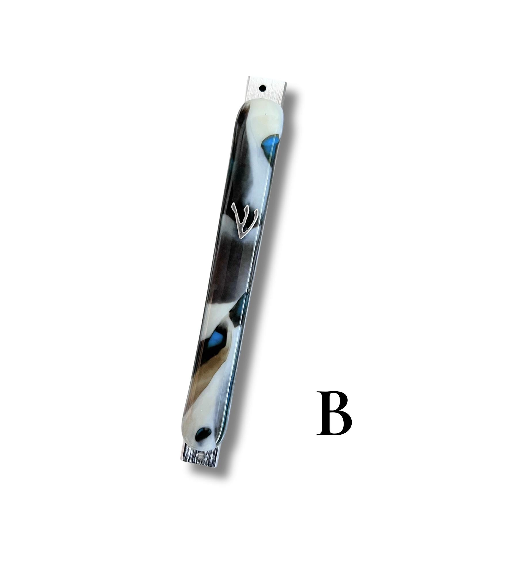 The organic swirls of brown, ivory and blue in the glass makes each mezuzah truly unique. Pick which one you like from the pictures displayed.