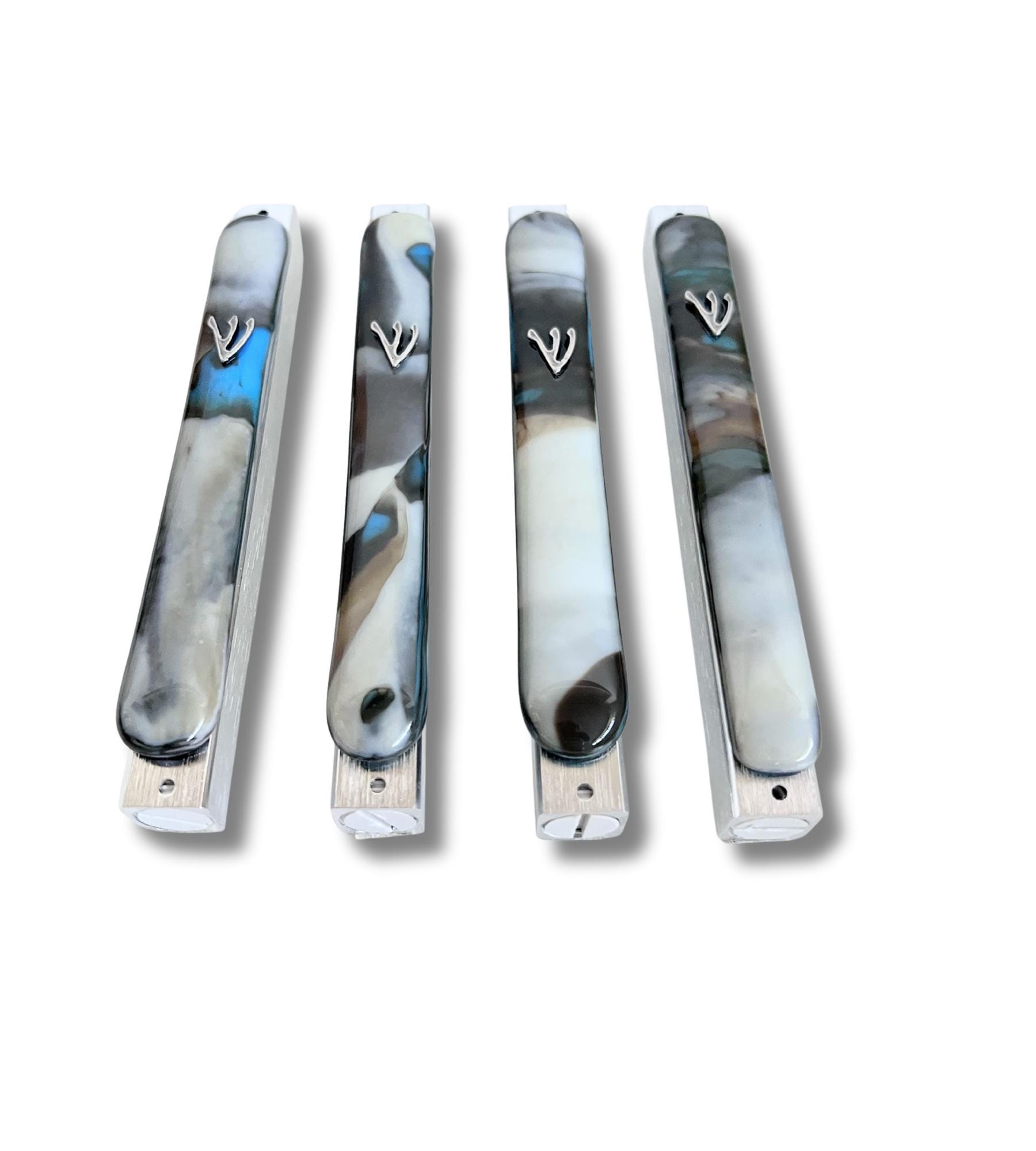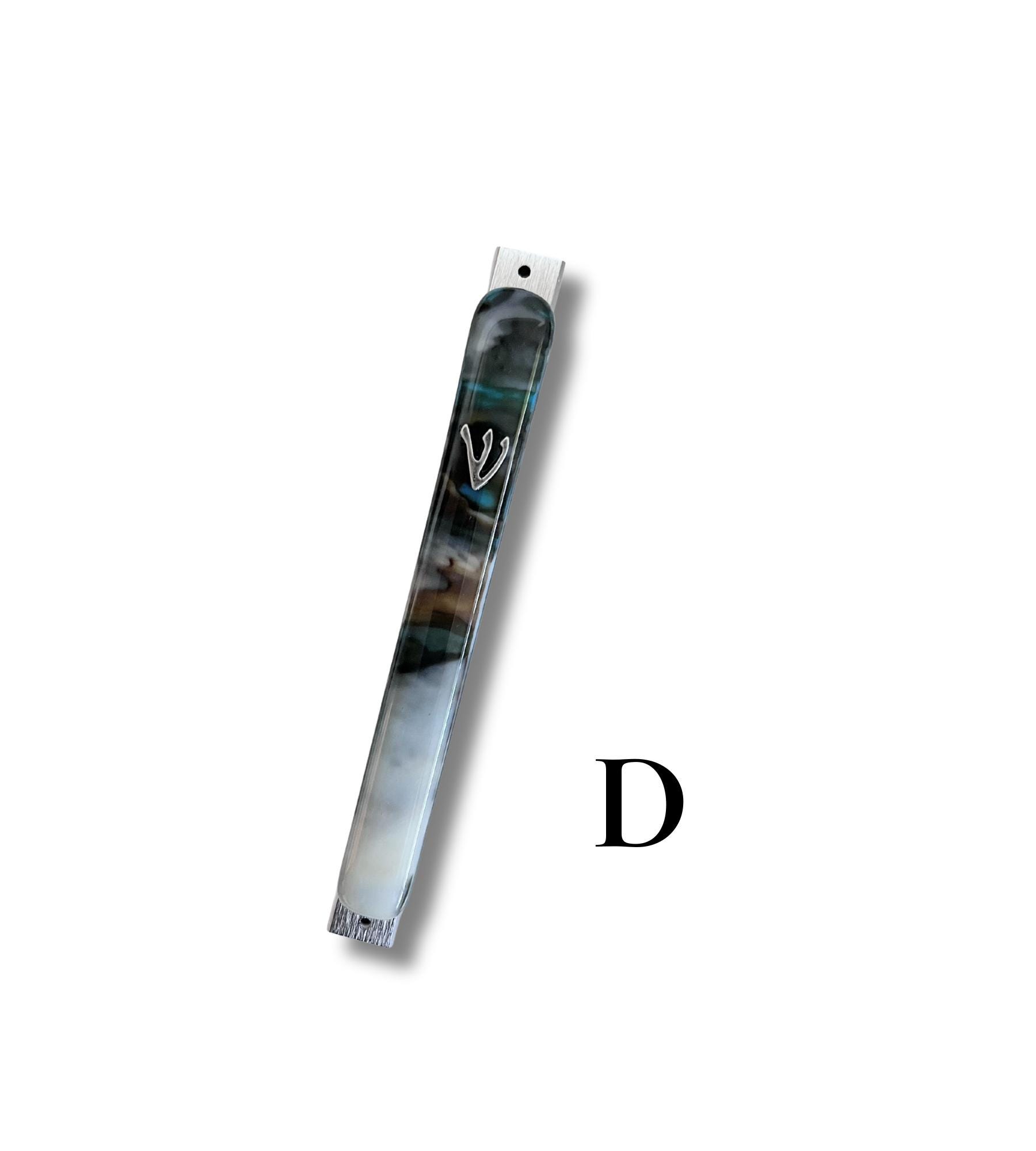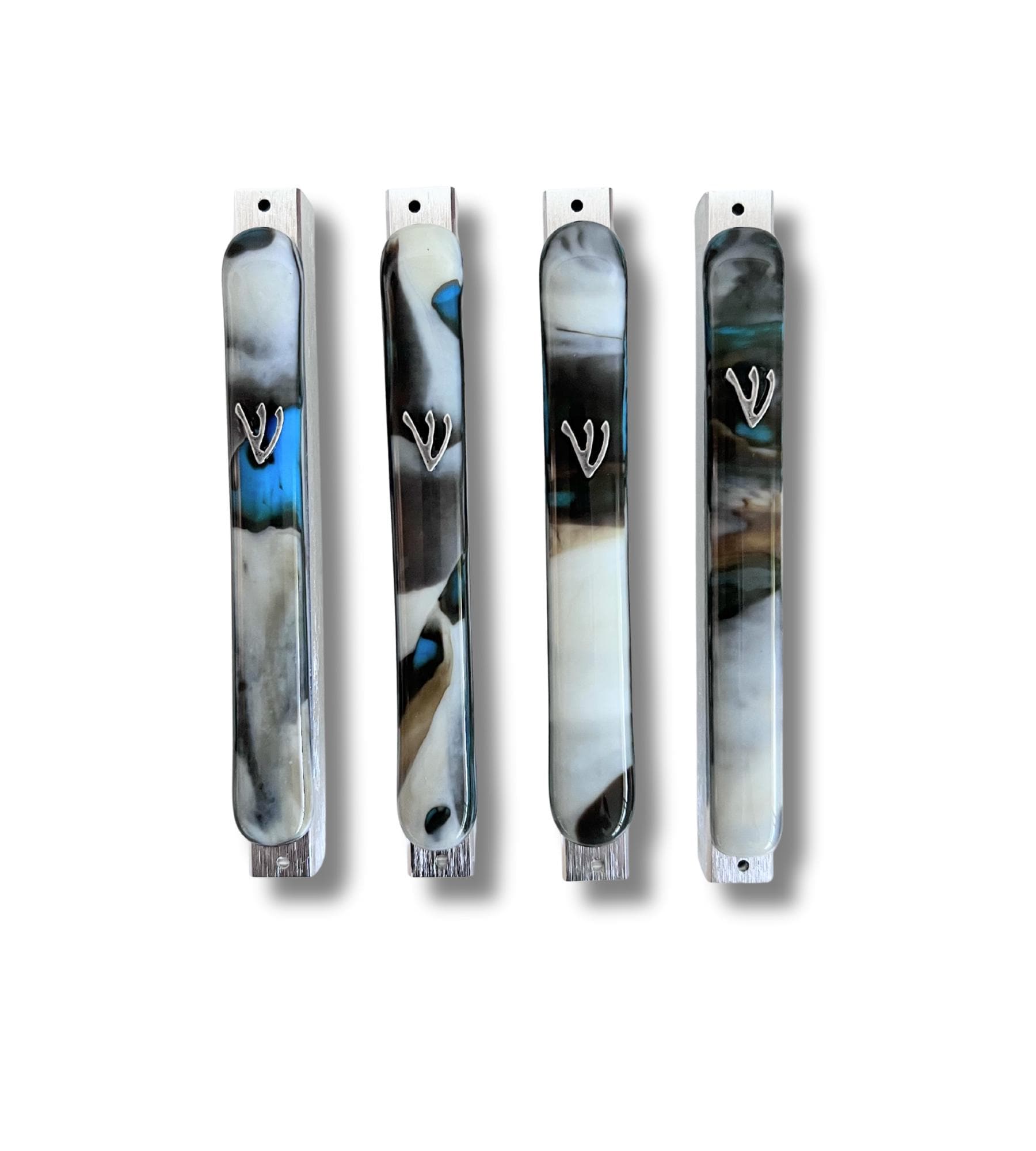 The organic swirls of brown, ivory and blue in the glass makes each mezuzah truly unique. Pick which one you like from the pictures displayed.