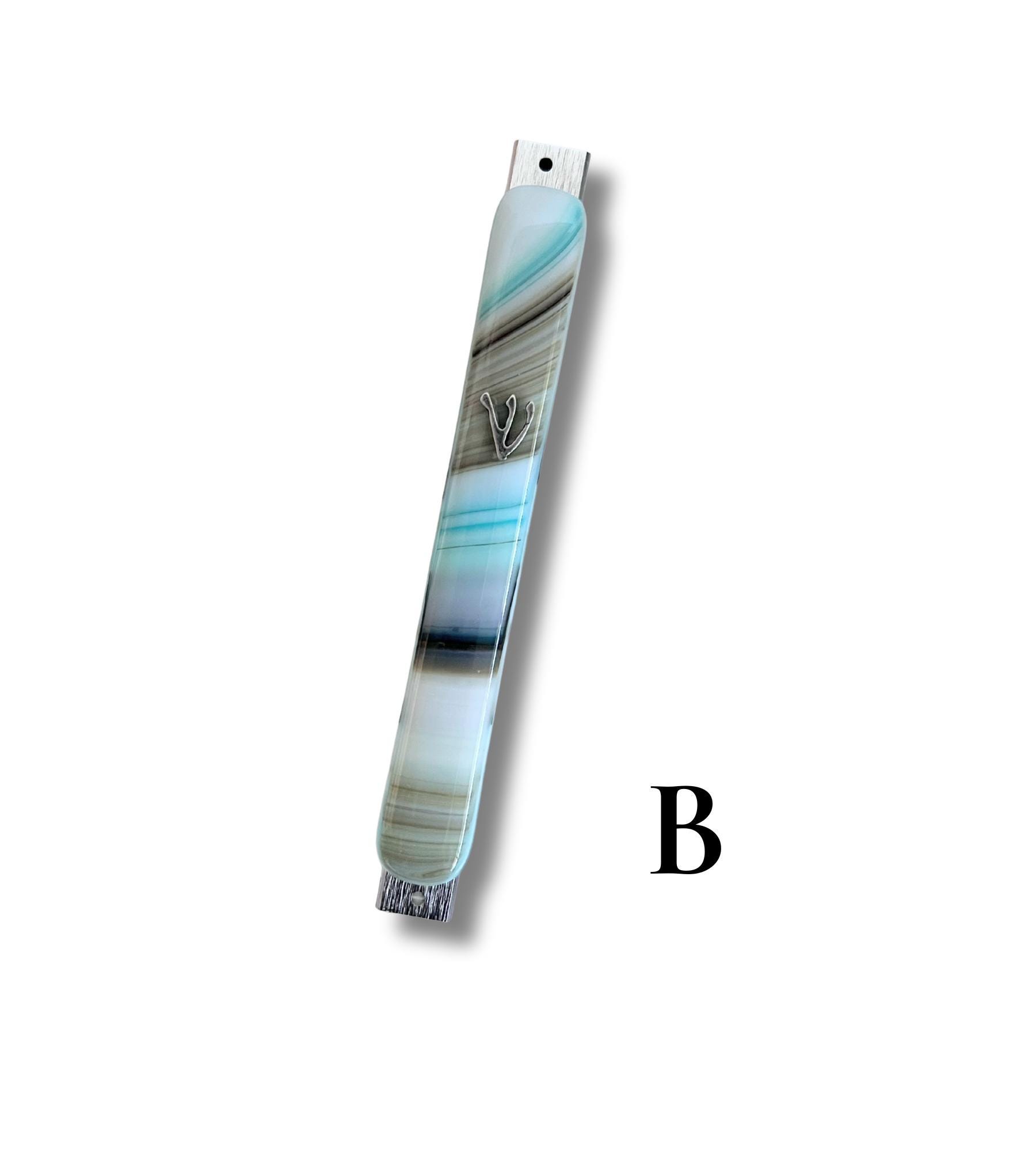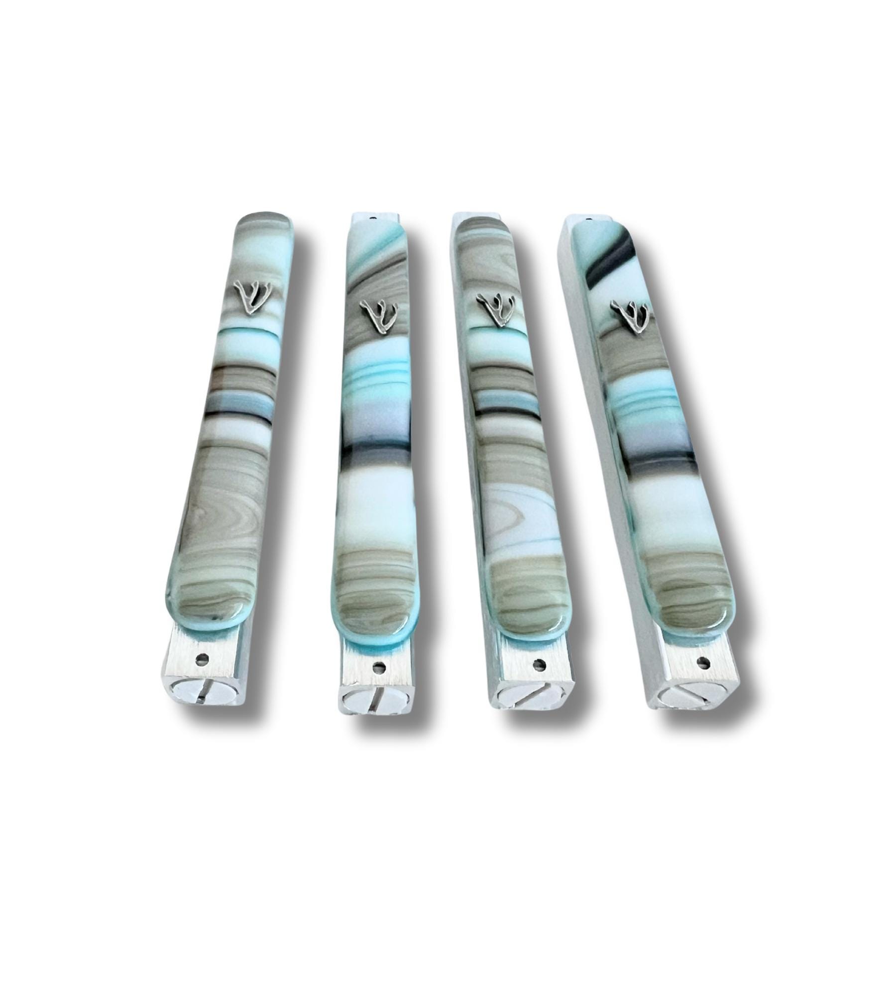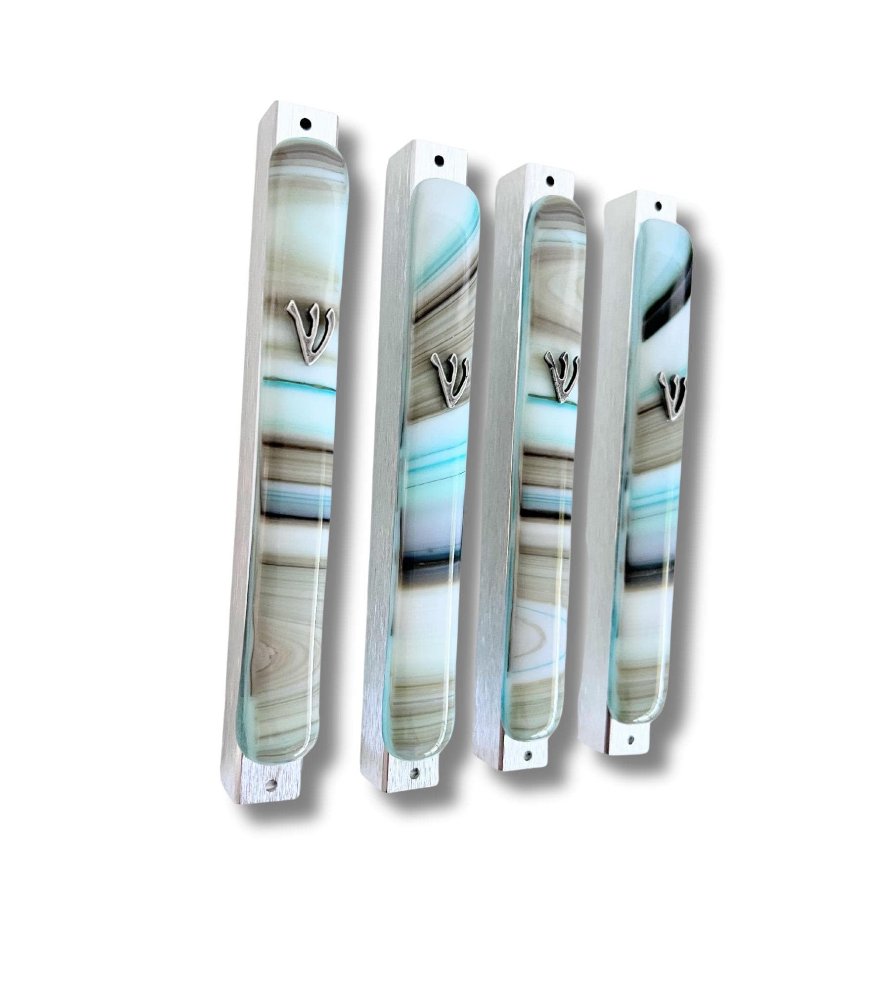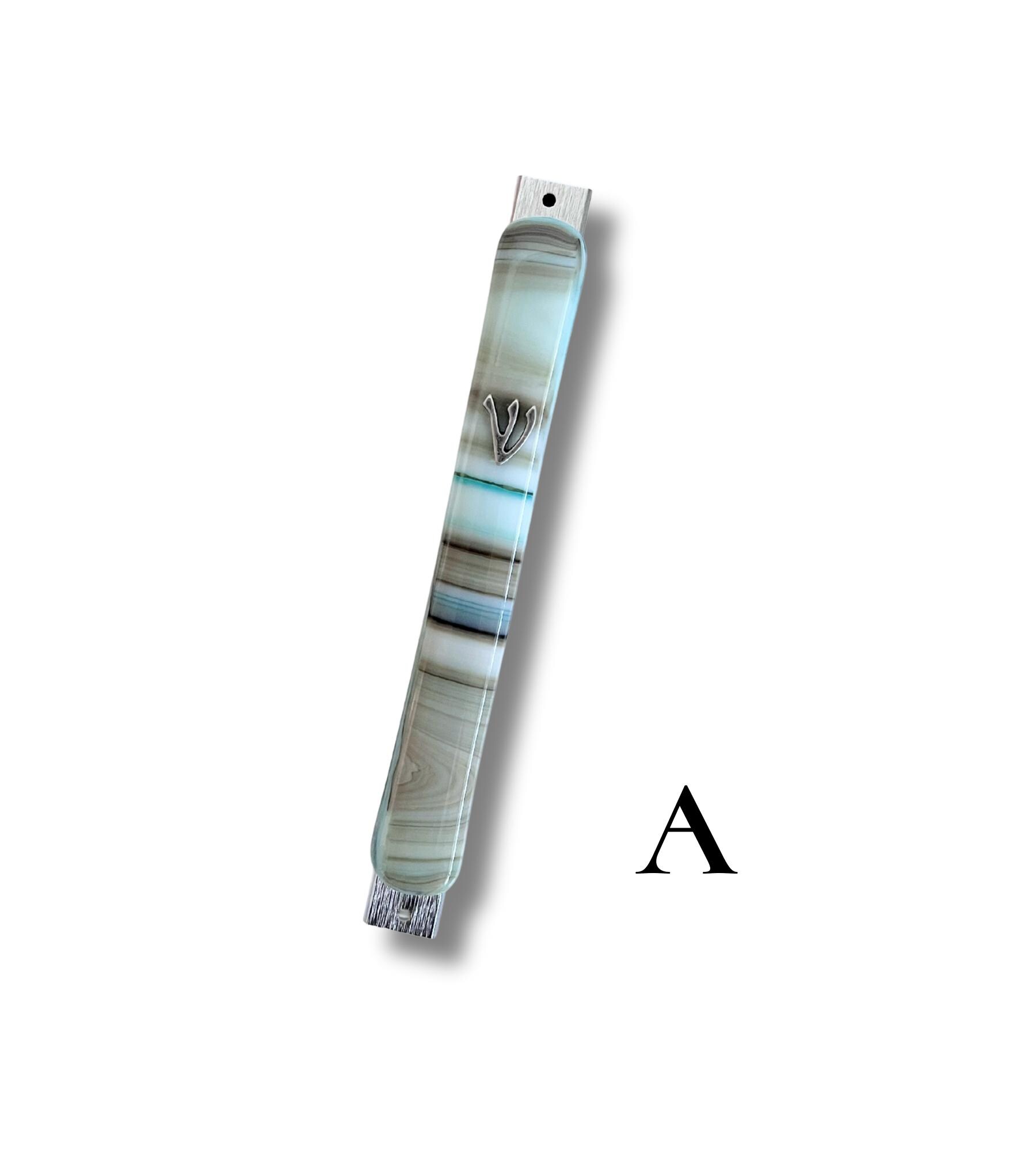 Each mezuzah cover is slightly different due to them being handmade. This mezuzah cover comes in an abstract design on a silver base.