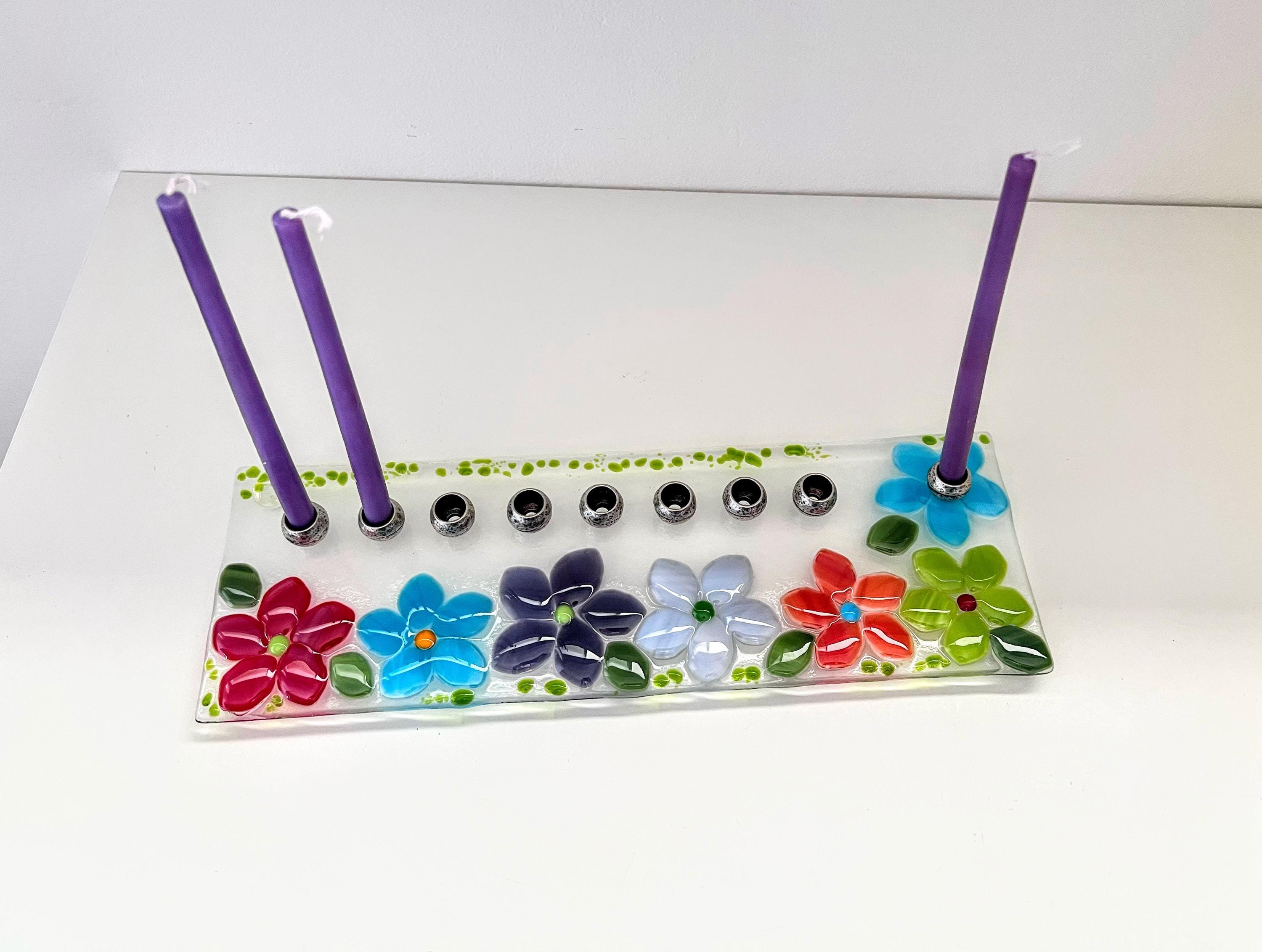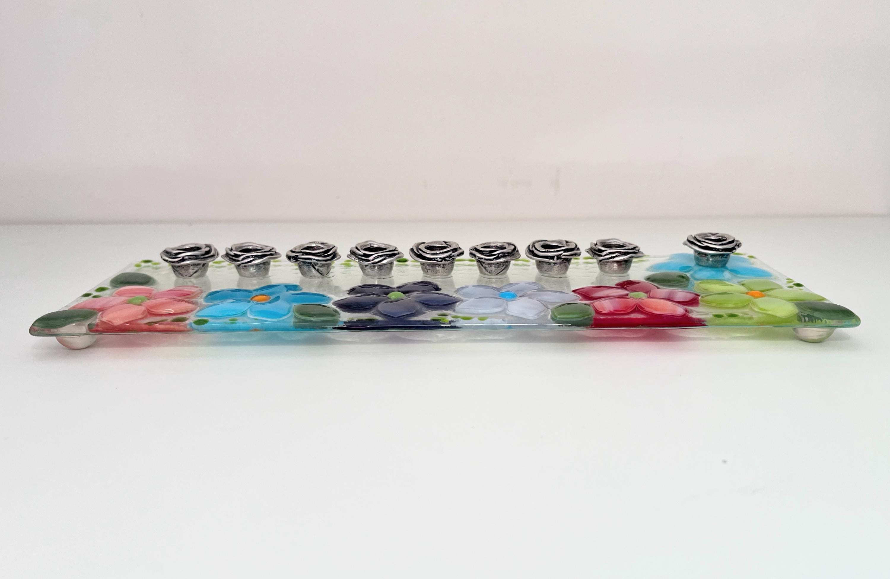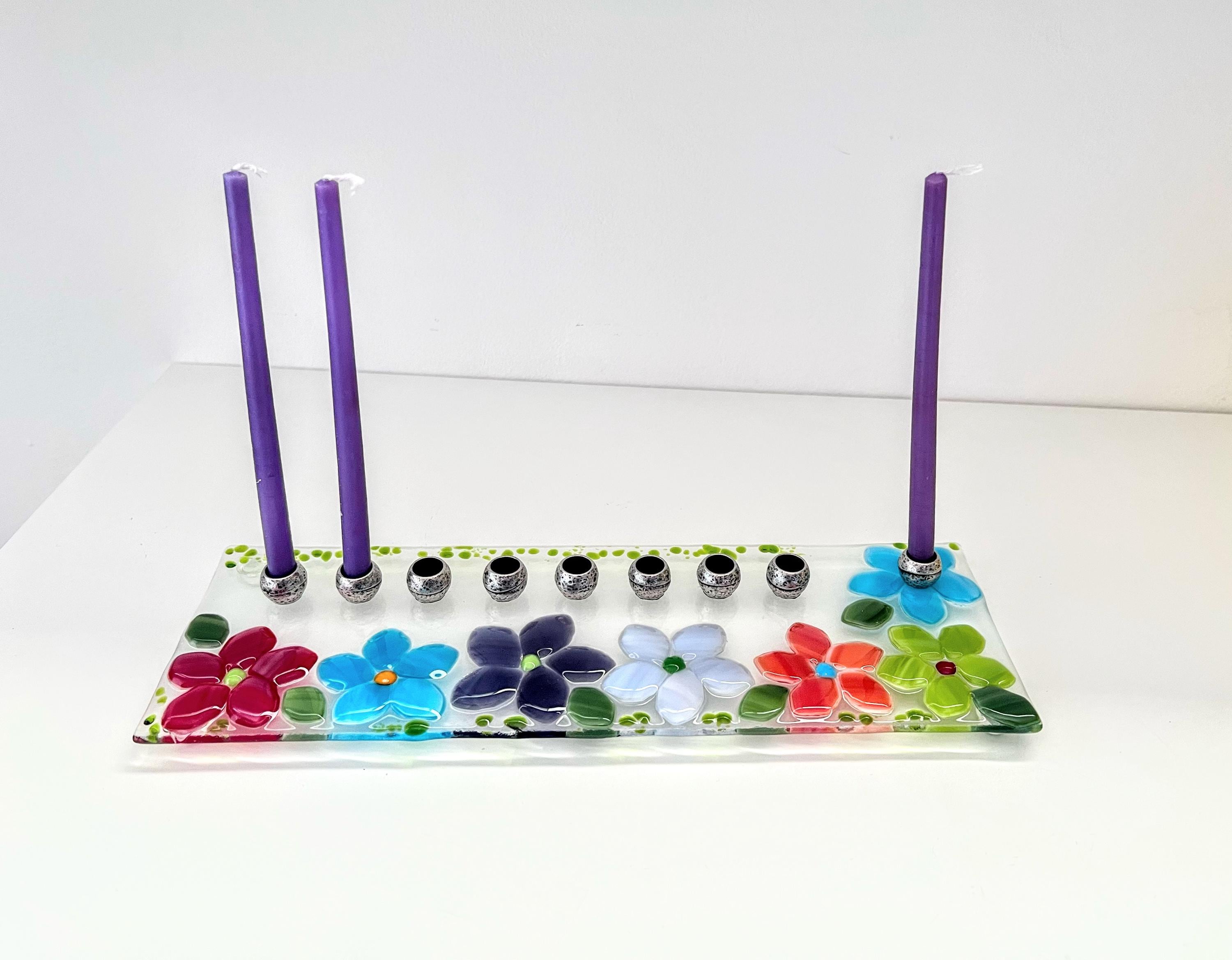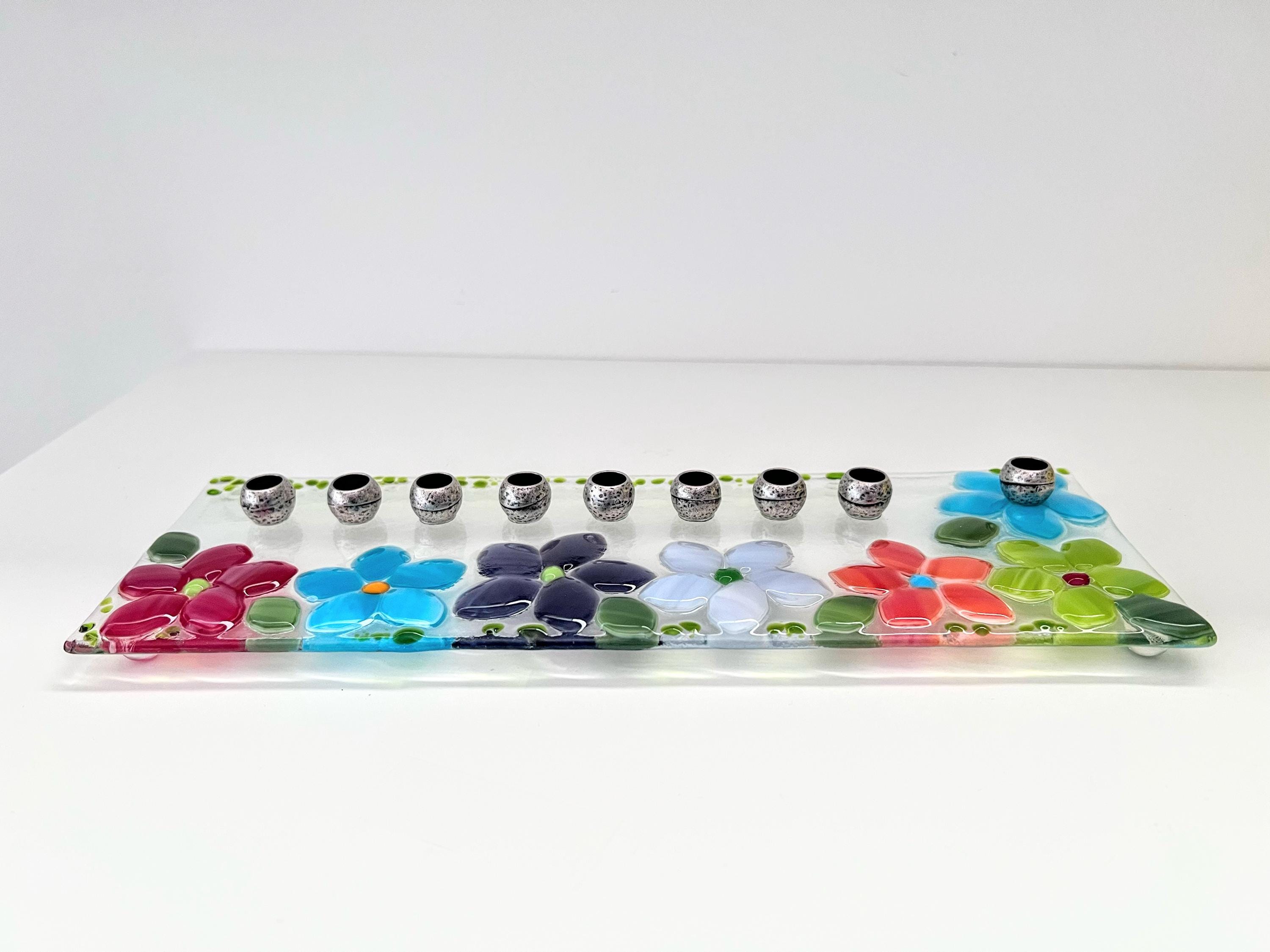 This fused glass floral Menorah for Hanukkah in vibrant colors, makes a colorful and vibrant holiday item. It is sure to bring a smile and add joy to the holiday. This menorah is bold, modern and artistic.