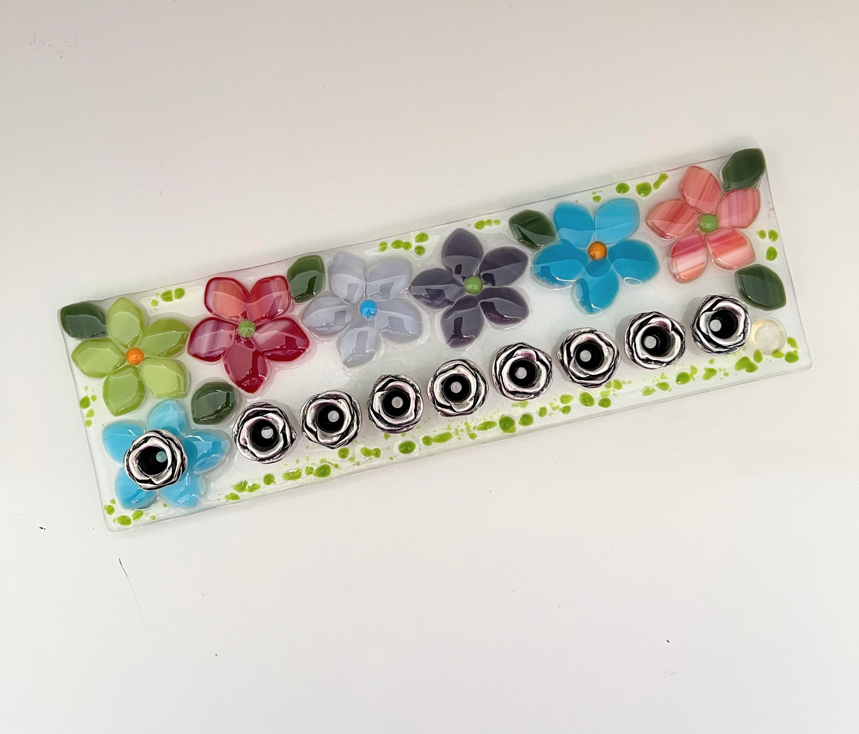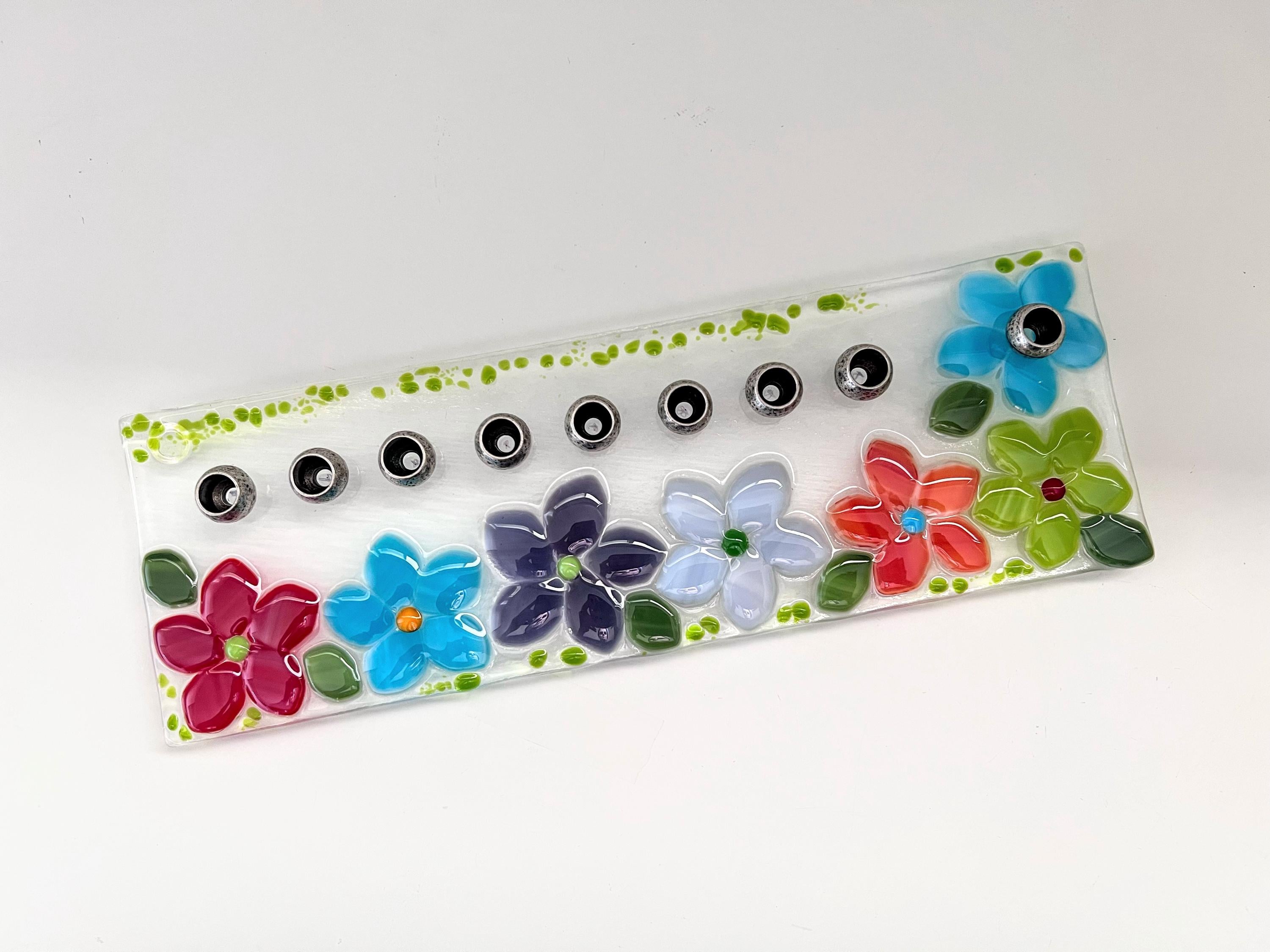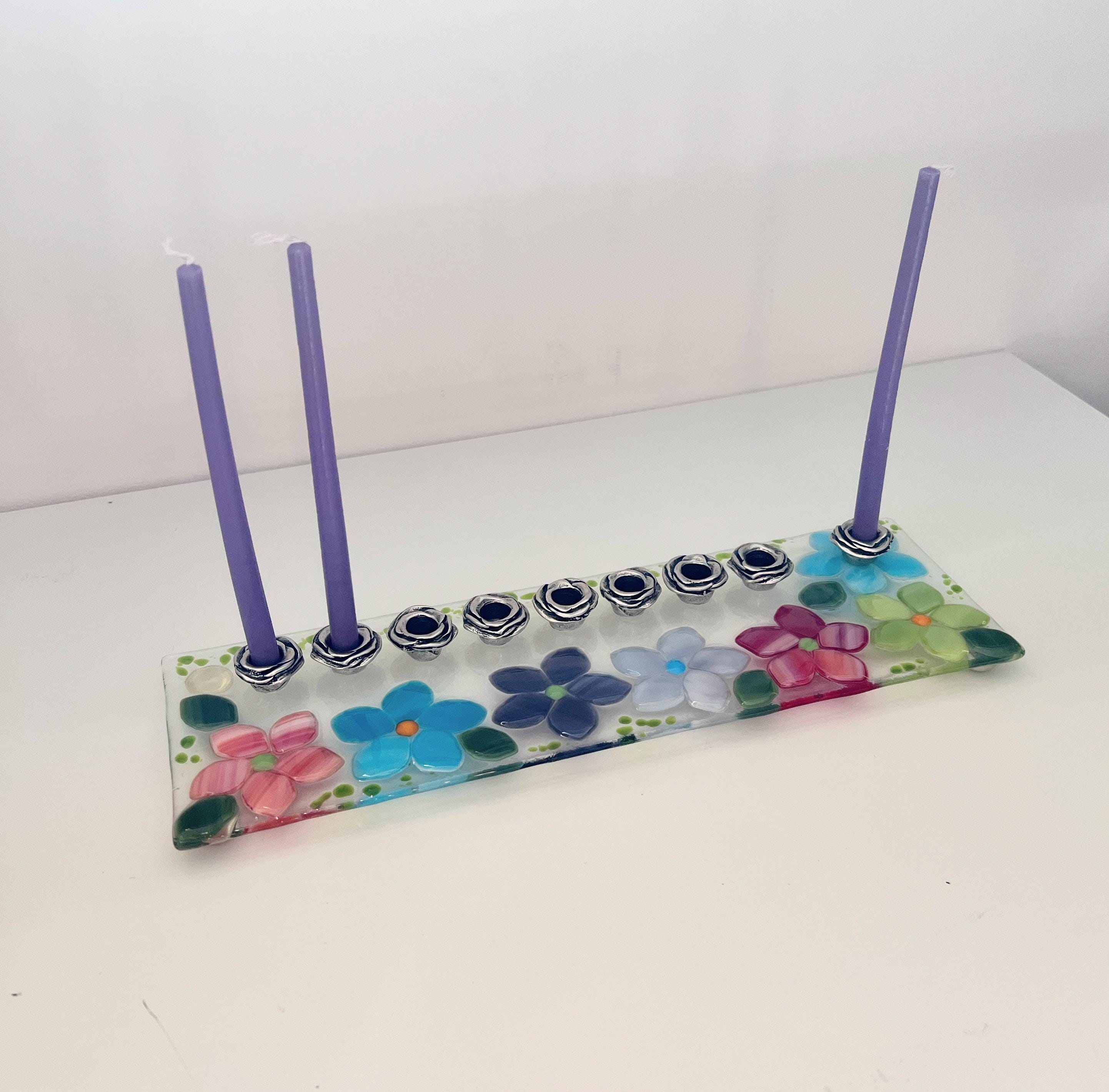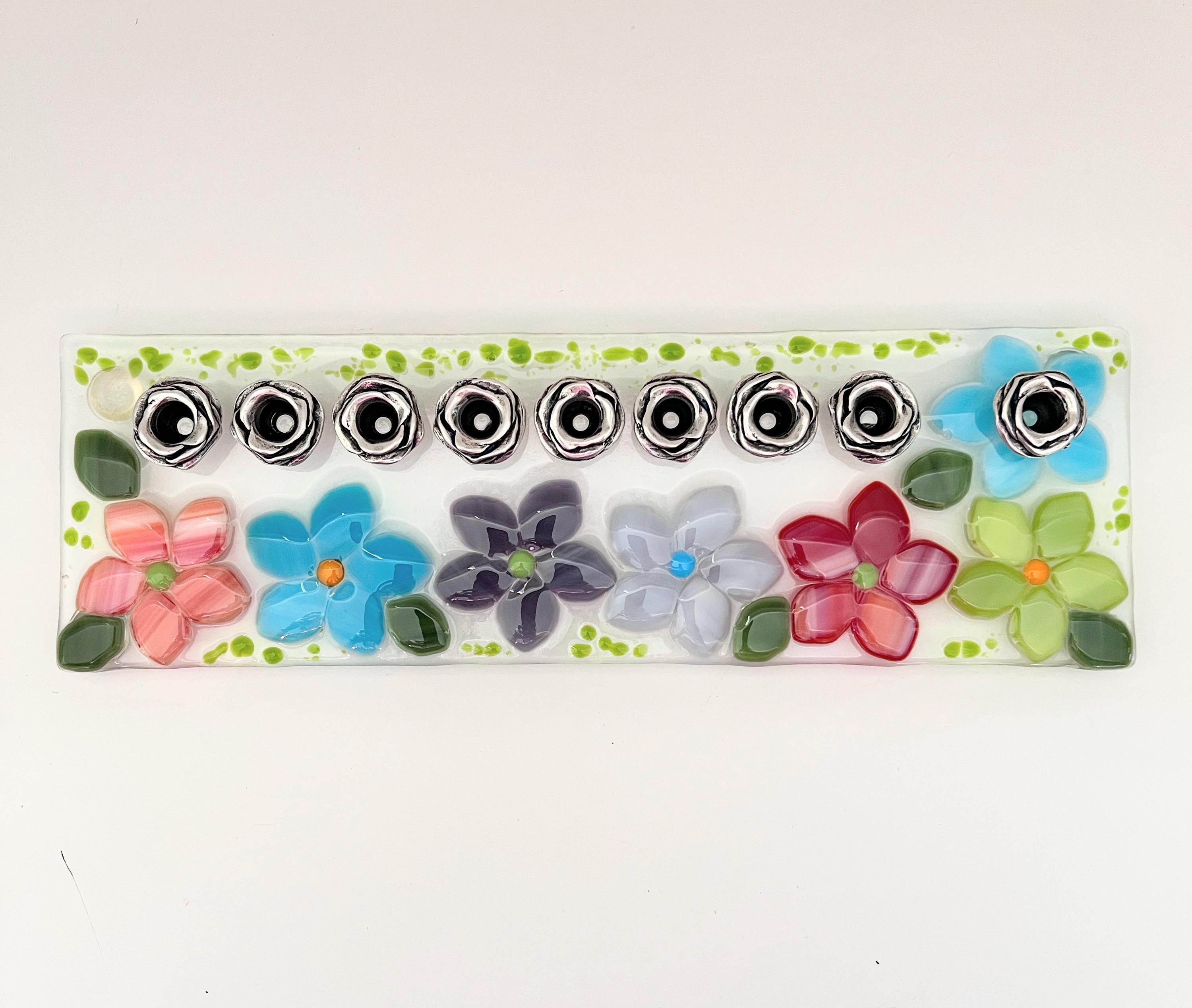 This fused glass floral Menorah for Hanukkah in vibrant colors, makes a colorful and vibrant holiday item. It is sure to bring a smile and add joy to the holiday. This menorah is bold, modern and artistic.