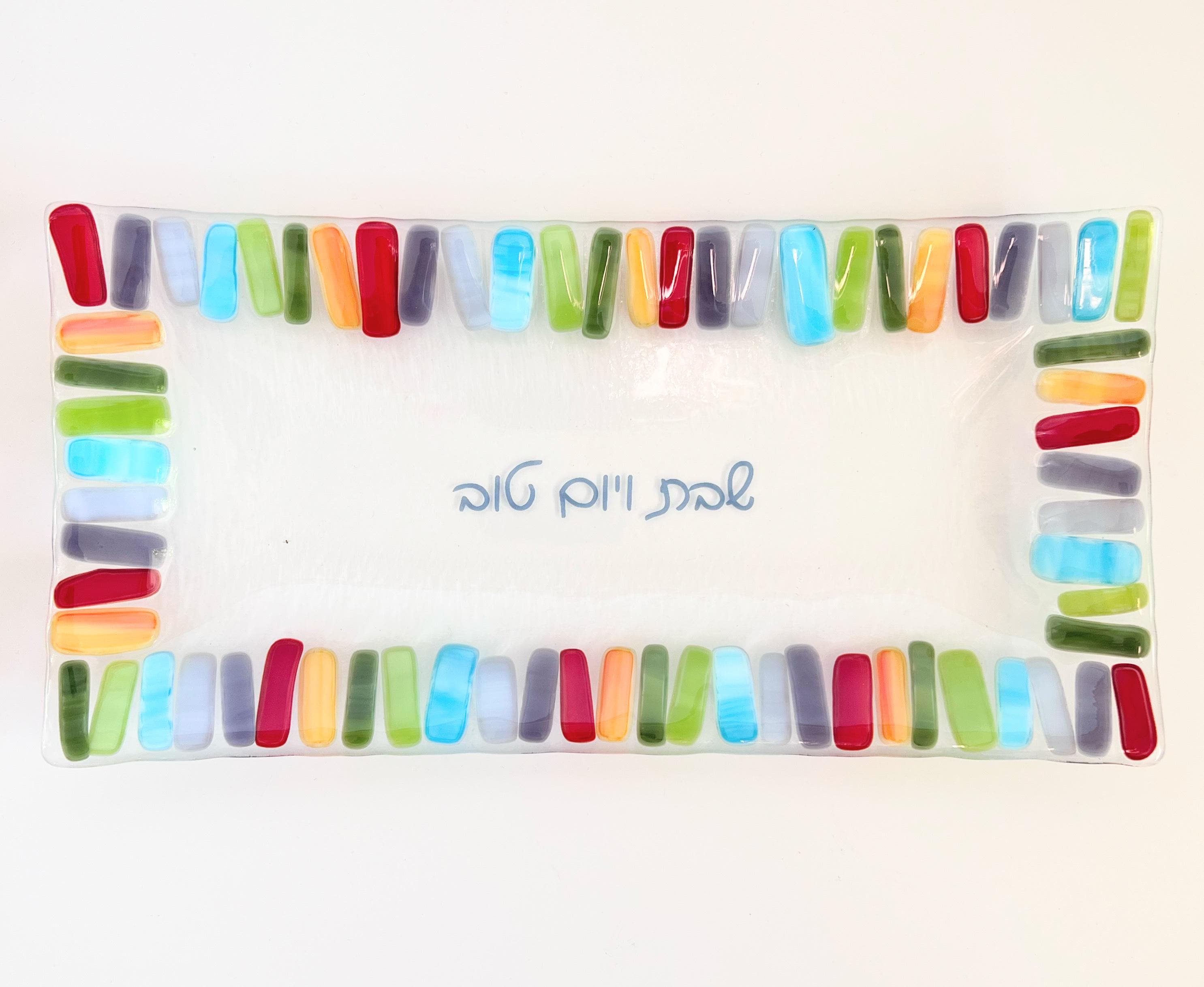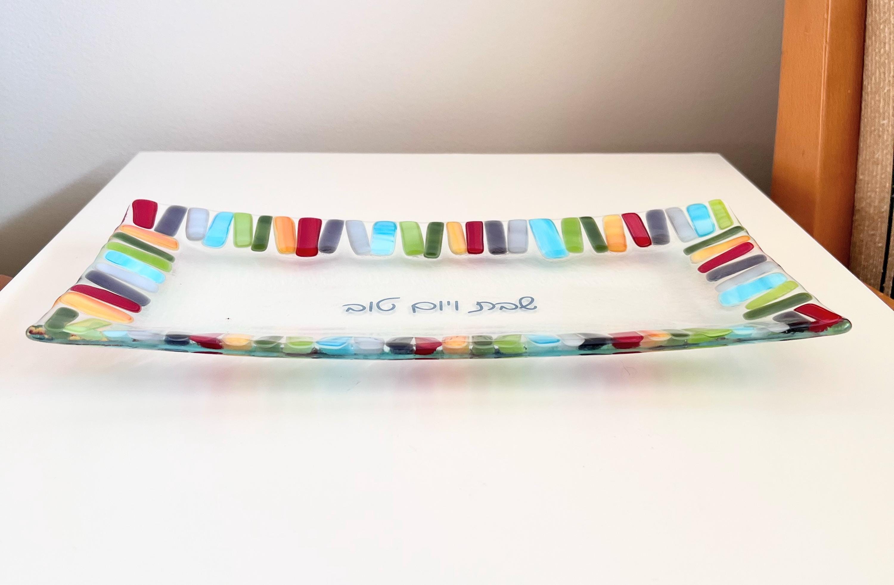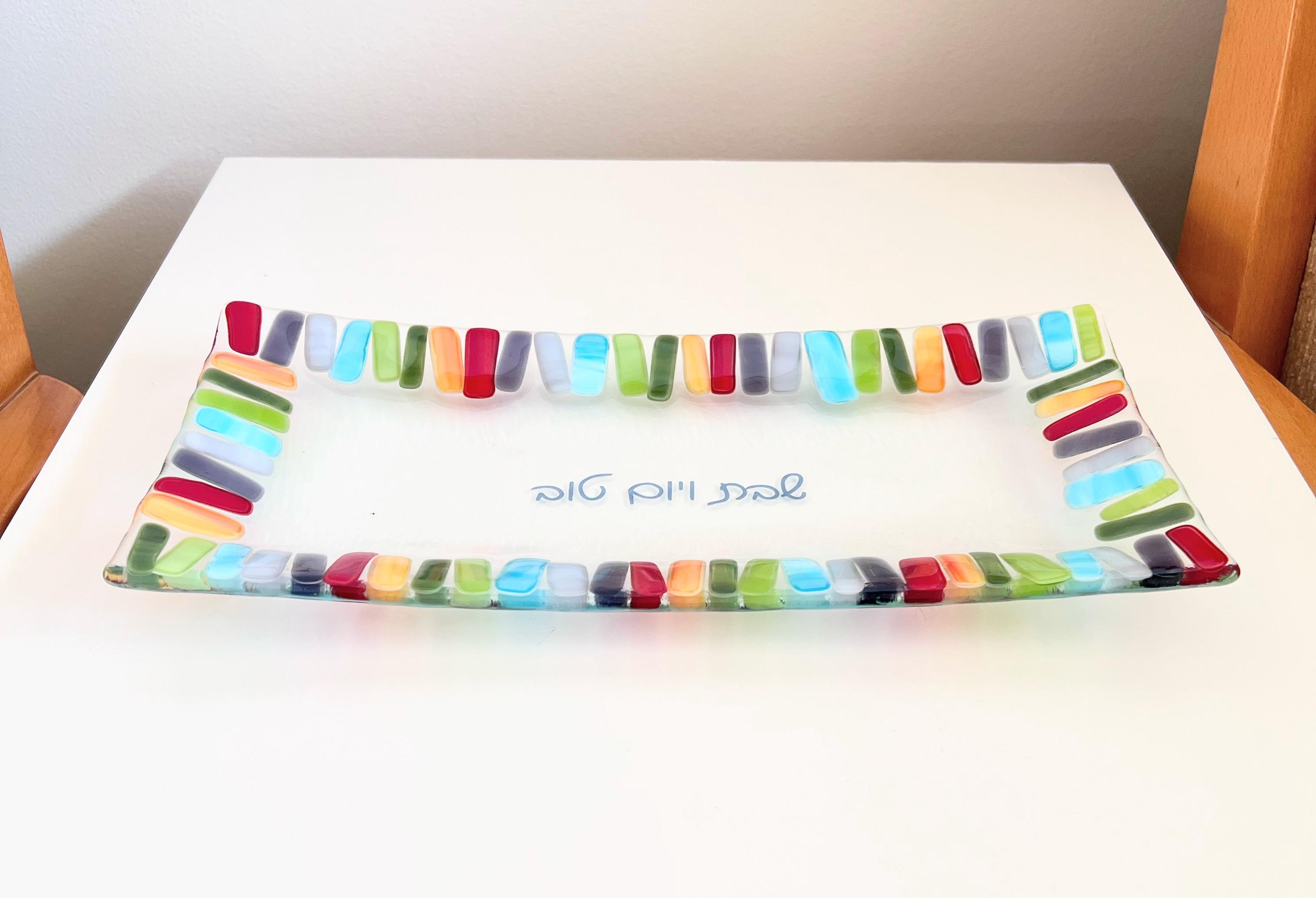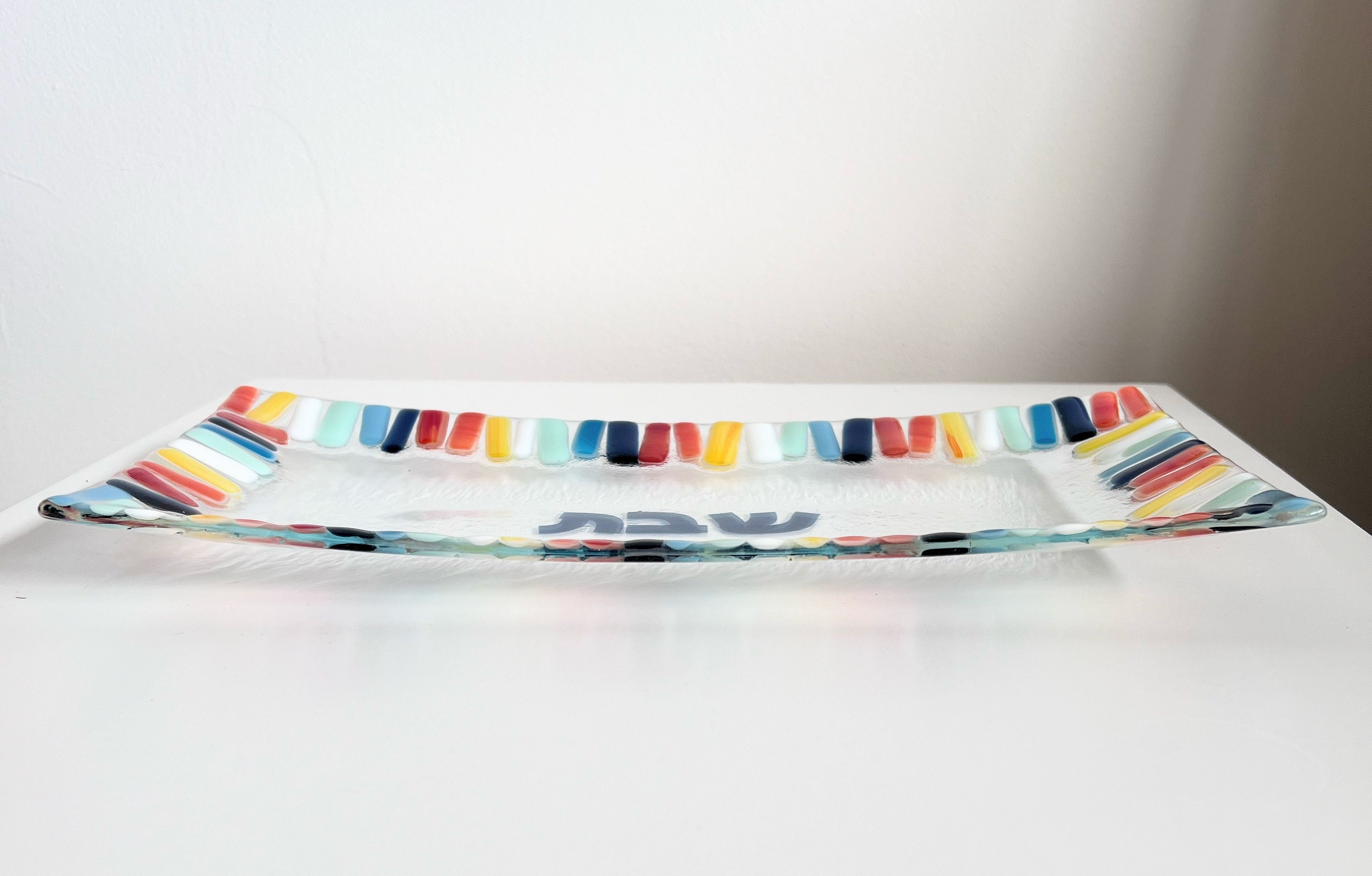A unique gift for a Jewish home, these fused glass Shabbat platters are a colorful and modern piece of Judaica that will make a beautiful adornment to a Shabbat table. The rainbow colors make a unique and joyous addition to the Shabbat table.