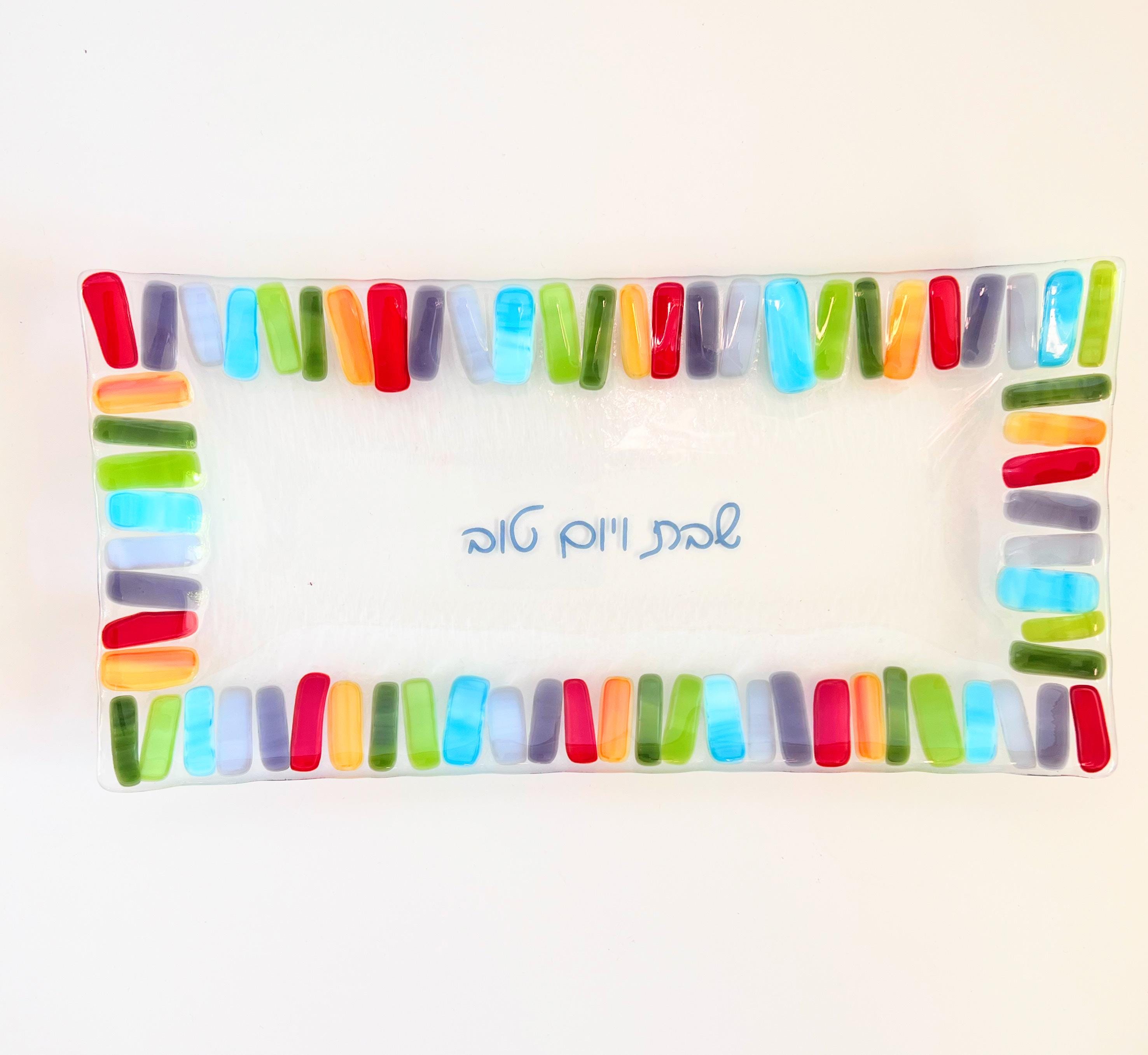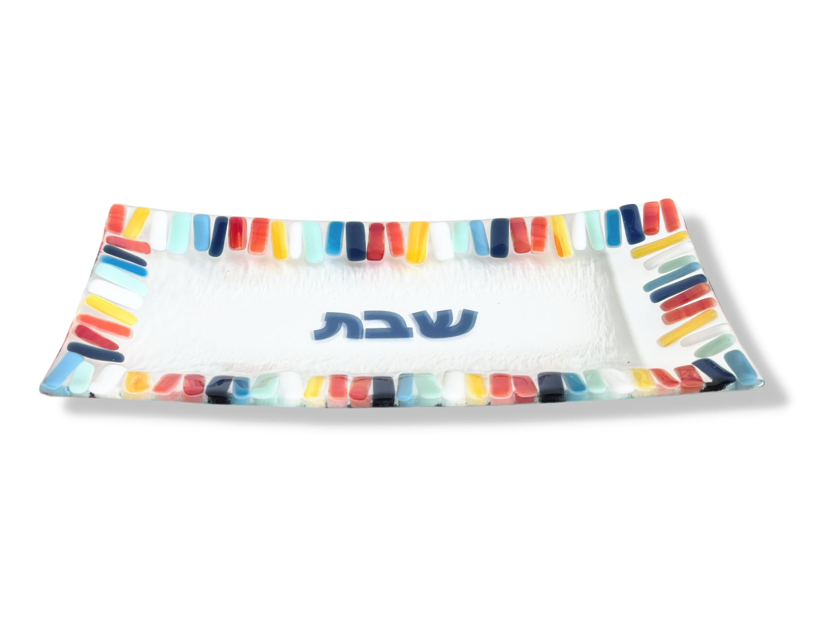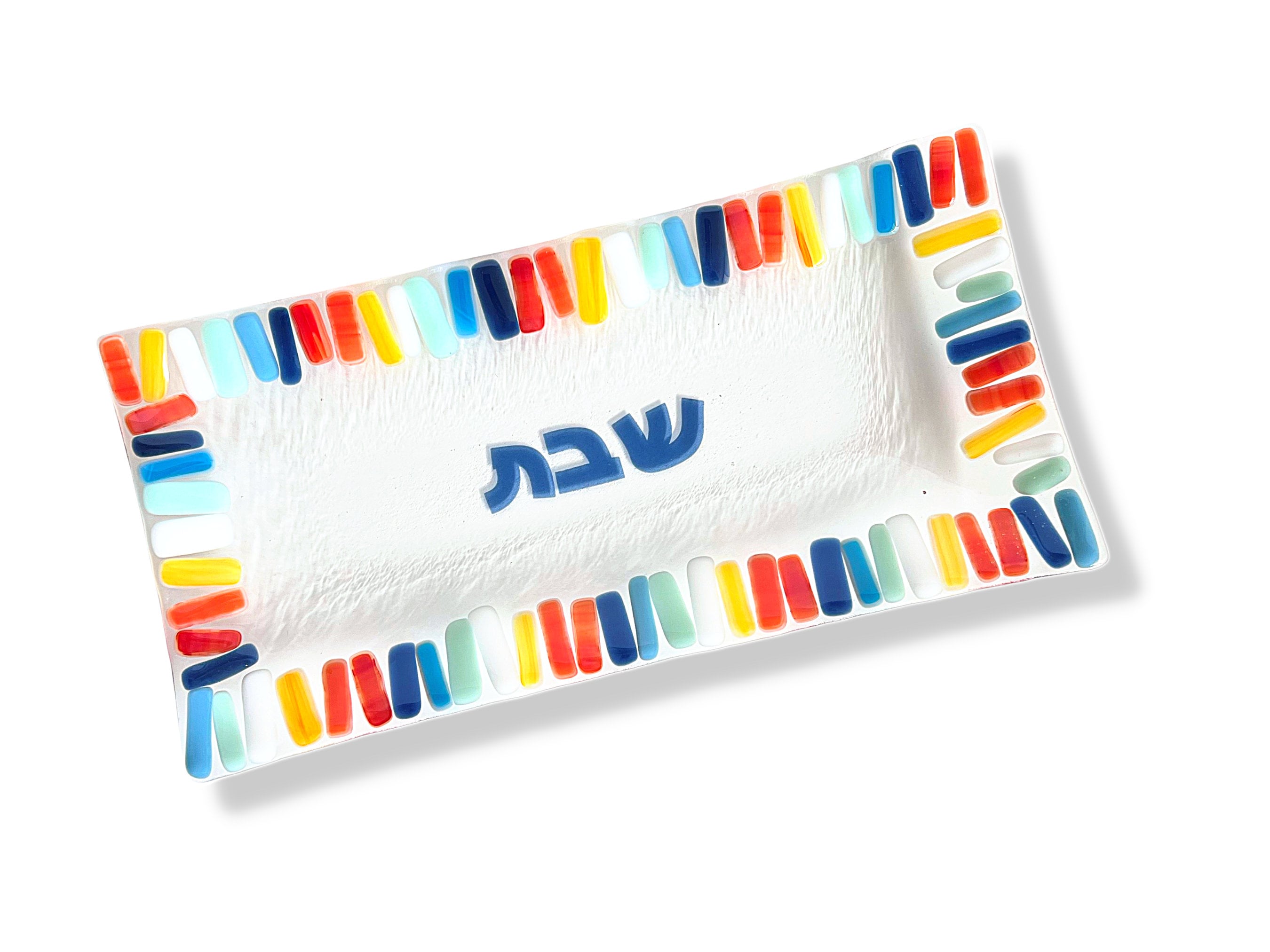 A unique gift for a Jewish home, these fused glass Shabbat platters are a colorful and modern piece of Judaica that will make a beautiful adornment to a Shabbat table. The rainbow colors make a unique and joyous addition to the Shabbat table.