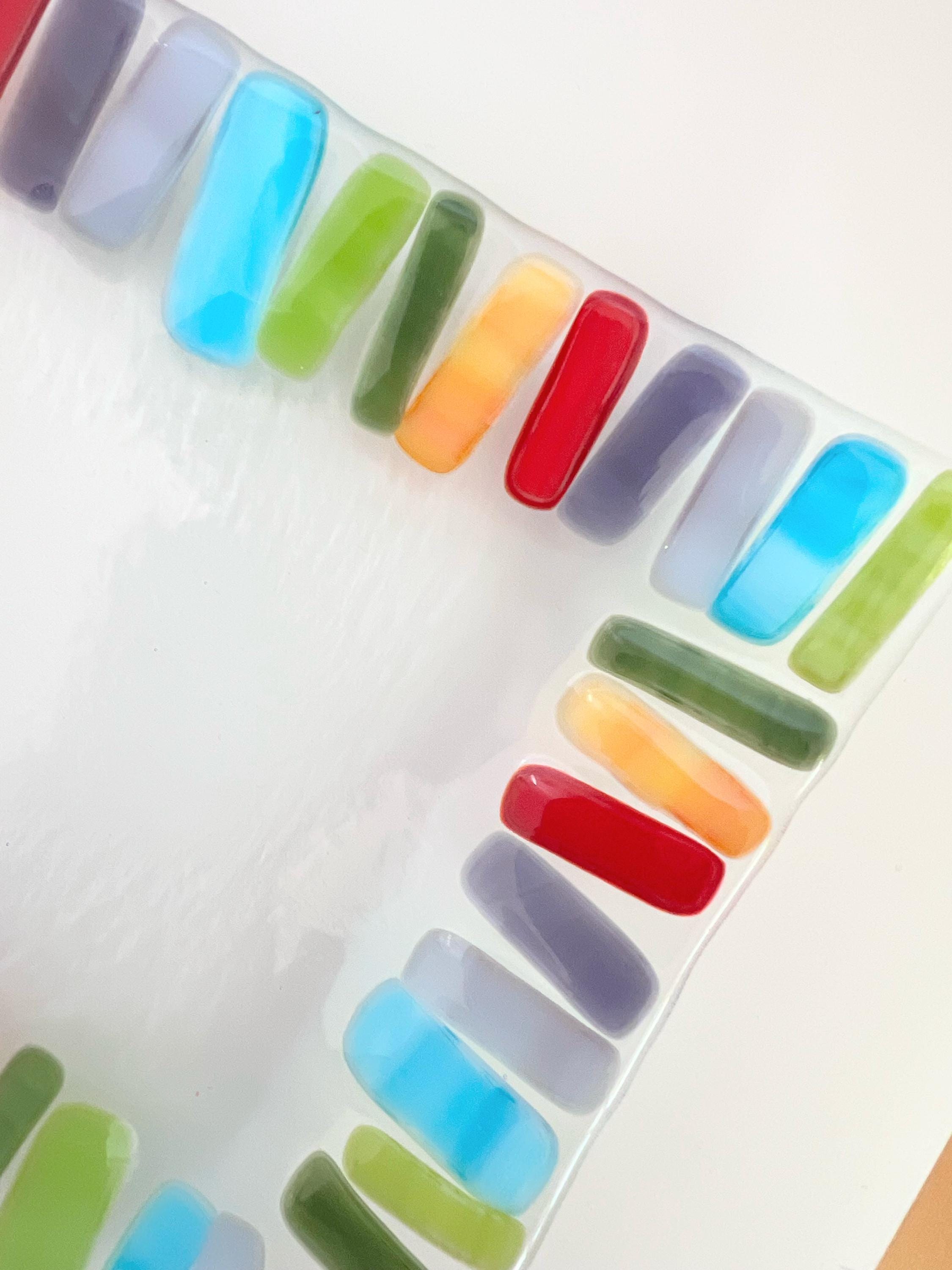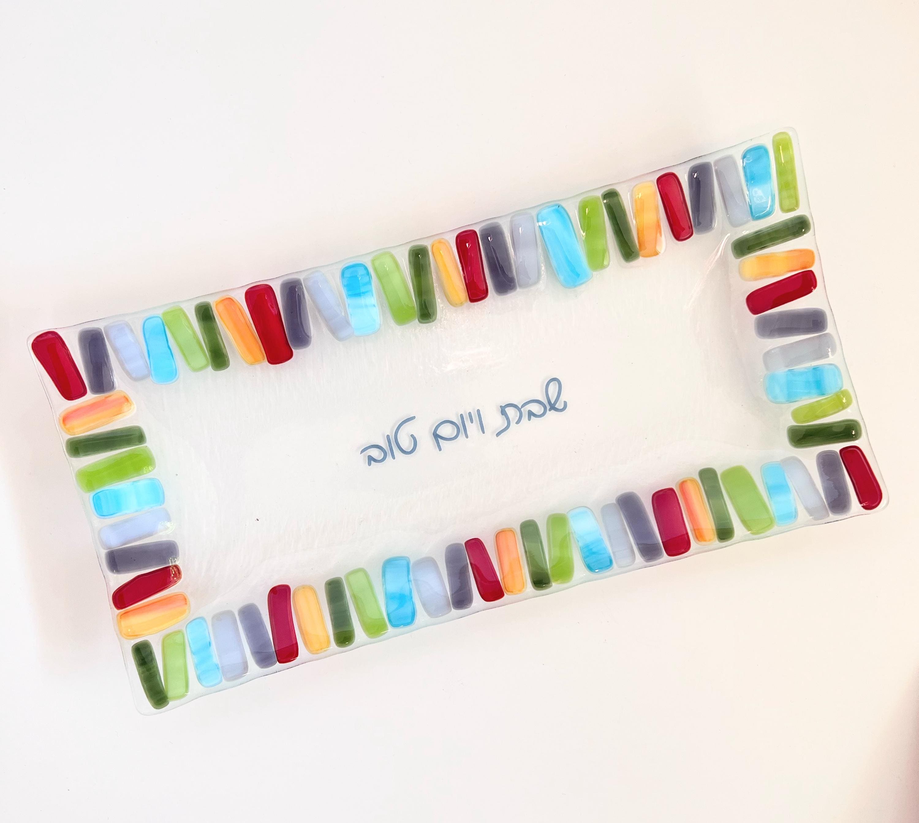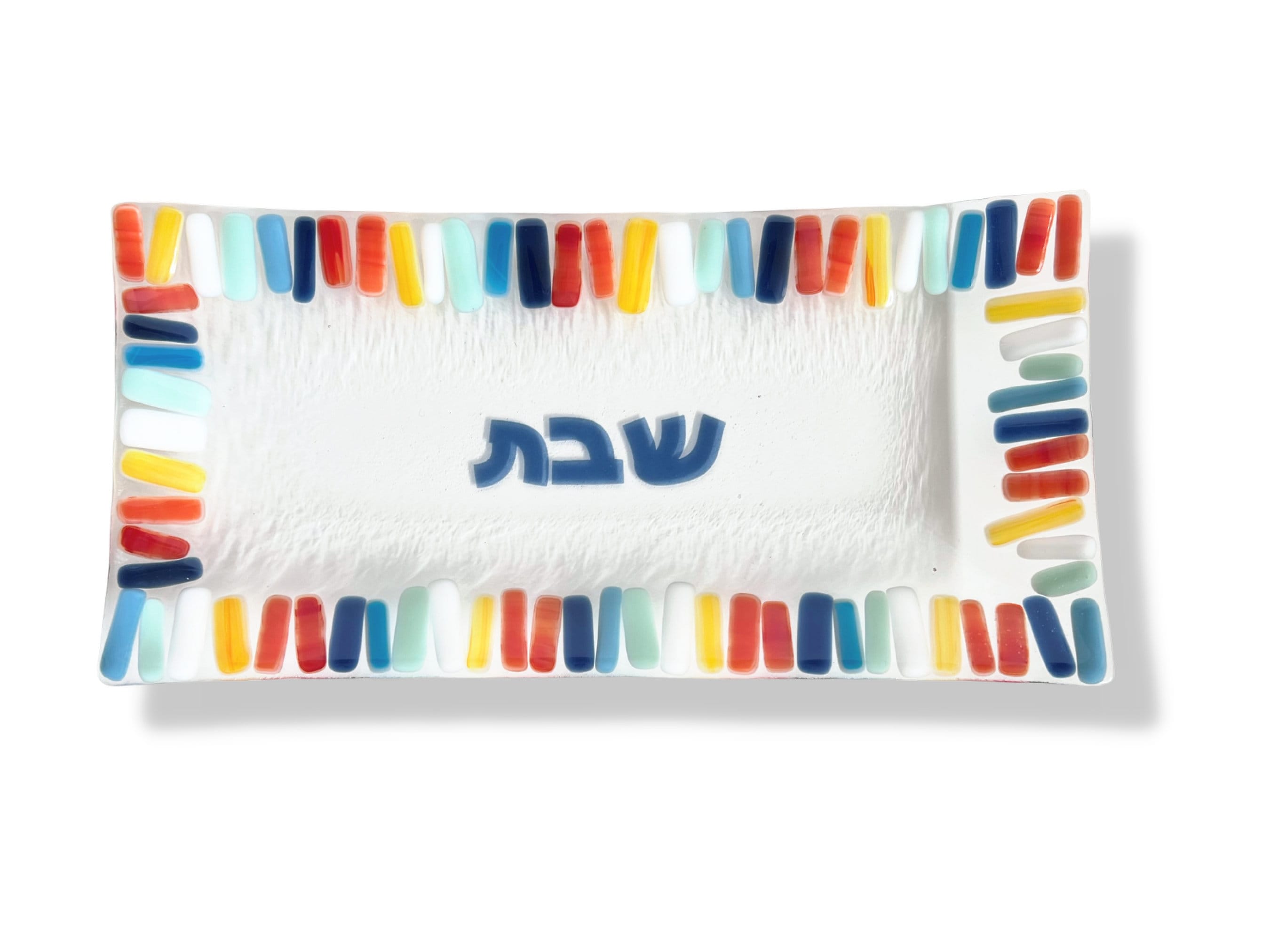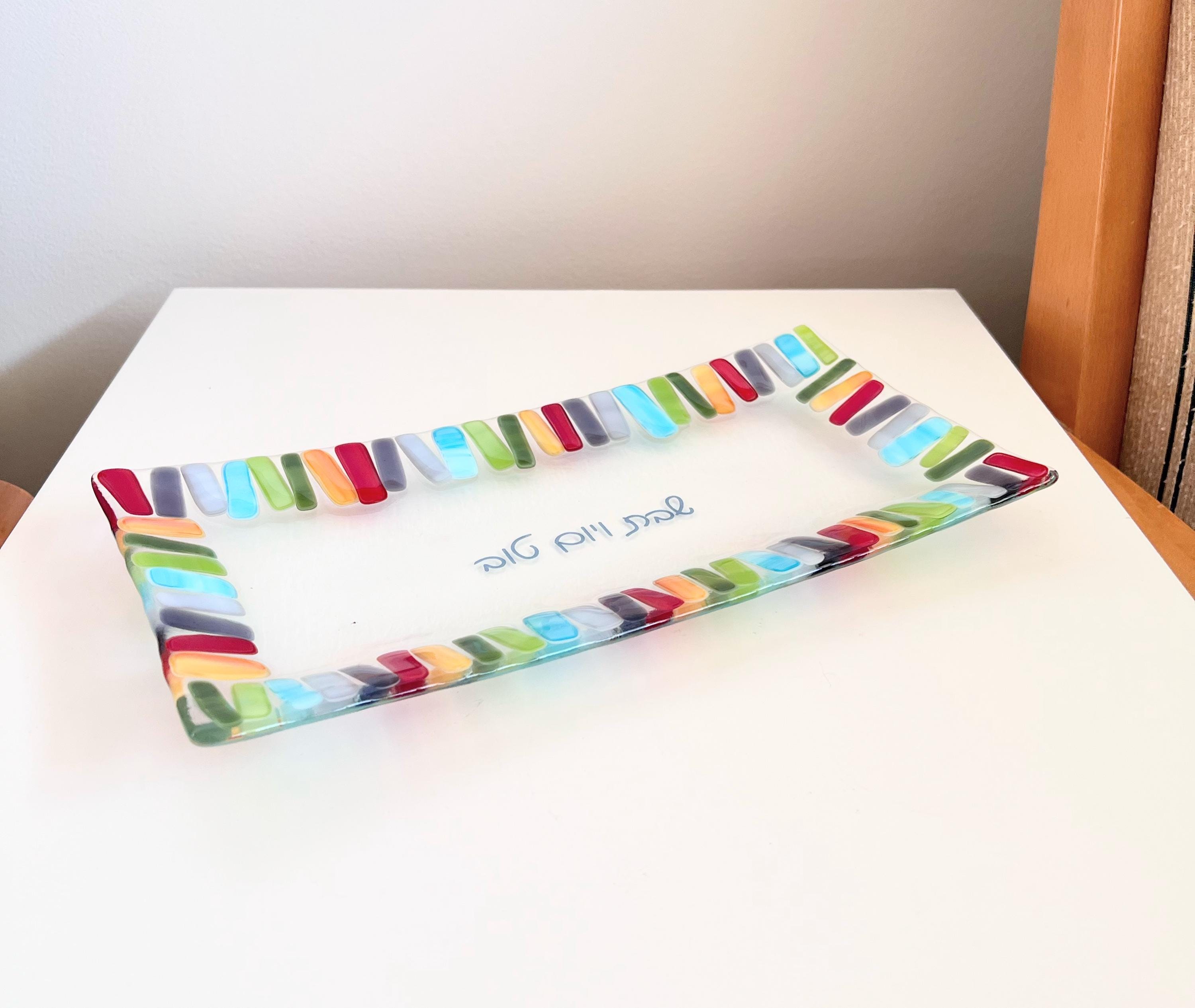 A unique gift for a Jewish home, these fused glass Shabbat platters are a colorful and modern piece of Judaica that will make a beautiful adornment to a Shabbat table. The rainbow colors make a unique and joyous addition to the Shabbat table.