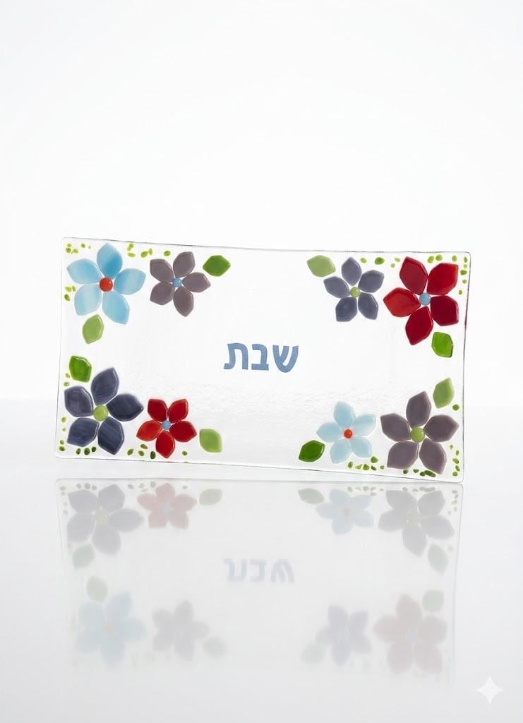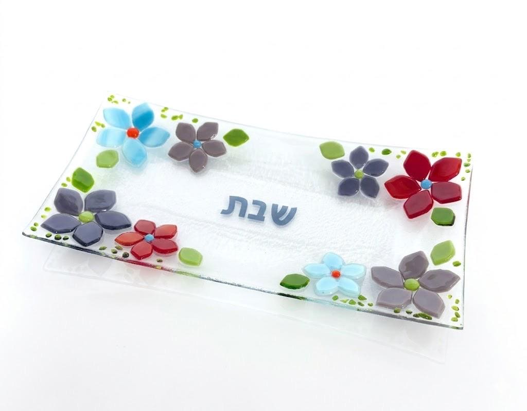 This fused glass Shabbat platter is a unique, colorful and modern Judaica piece. Fanciful and alive, this tray will make a beautiful adornment to a Shabbat table and is a unique gift for a Jewish home. The beautiful flowers in vibrant tones of blue, red and purple, make a unique and elegant addition to the Shabbat table.