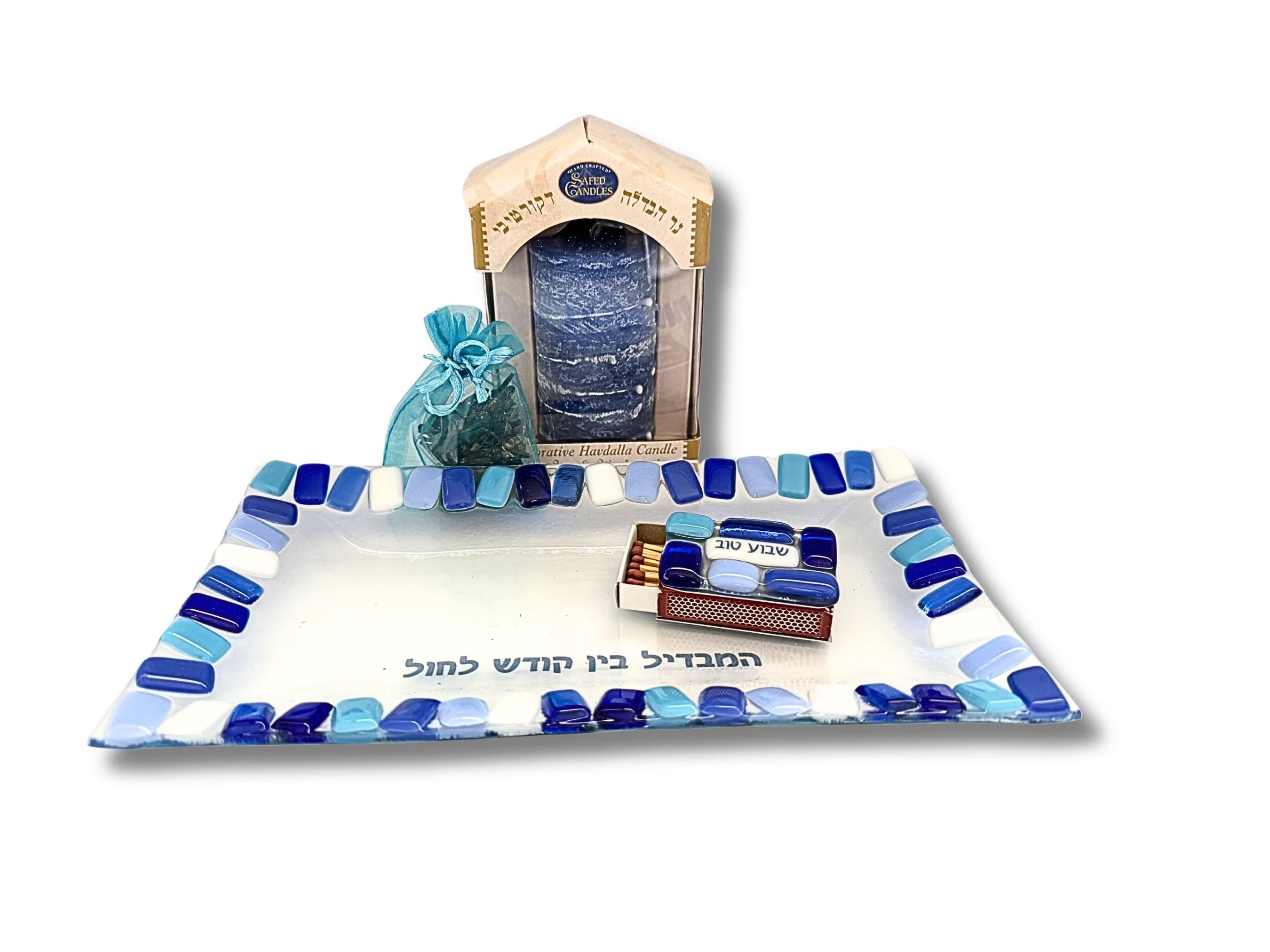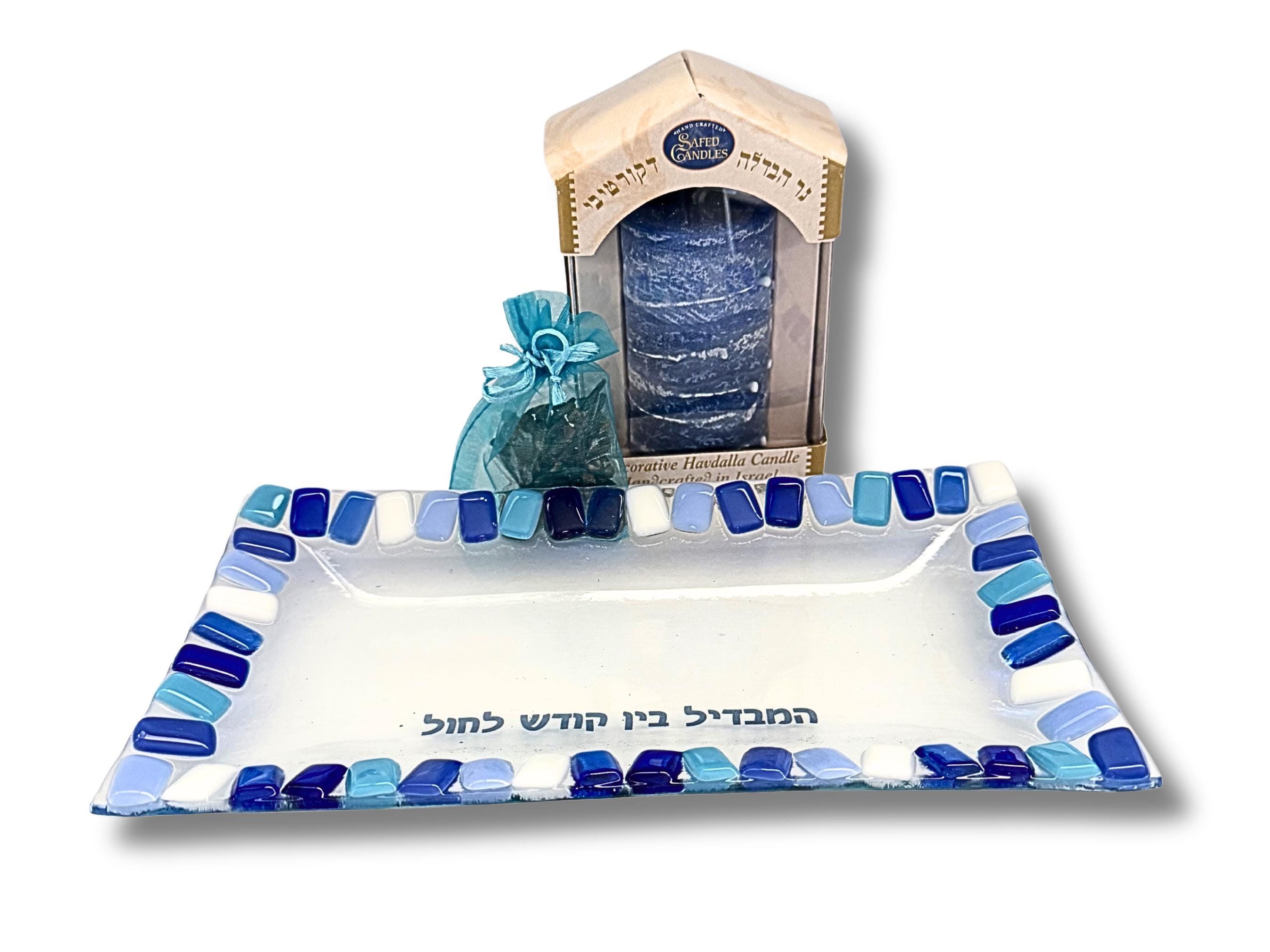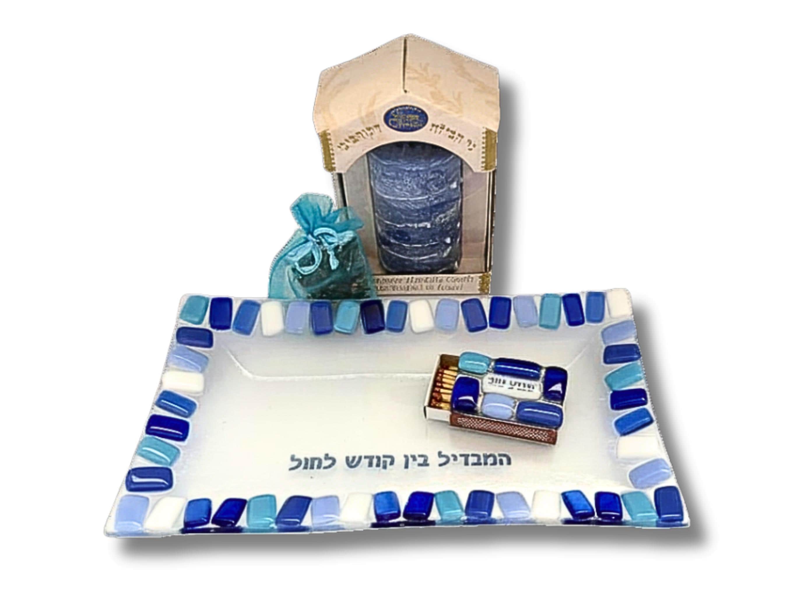 Bring beauty and meaning to the close of Shabbat with this stunning fused glass Havdalah set - an exciting addition to any Judaica collection. The handcrafted glass plate is paired with a beautiful freestanding Havdalah candle from Safed Candles, also made in Israel, creating a thoughtful and cohesive set.