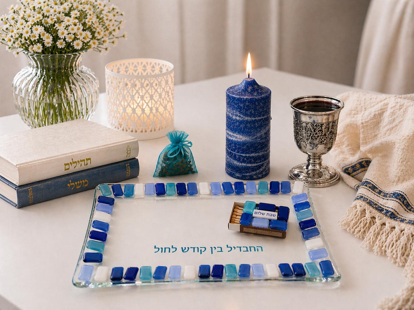 The plate features the words from the Havdalah blessing, המבדיל בין קדש לחול, delicately fused into the glass, blending tradition with modern artistic design.