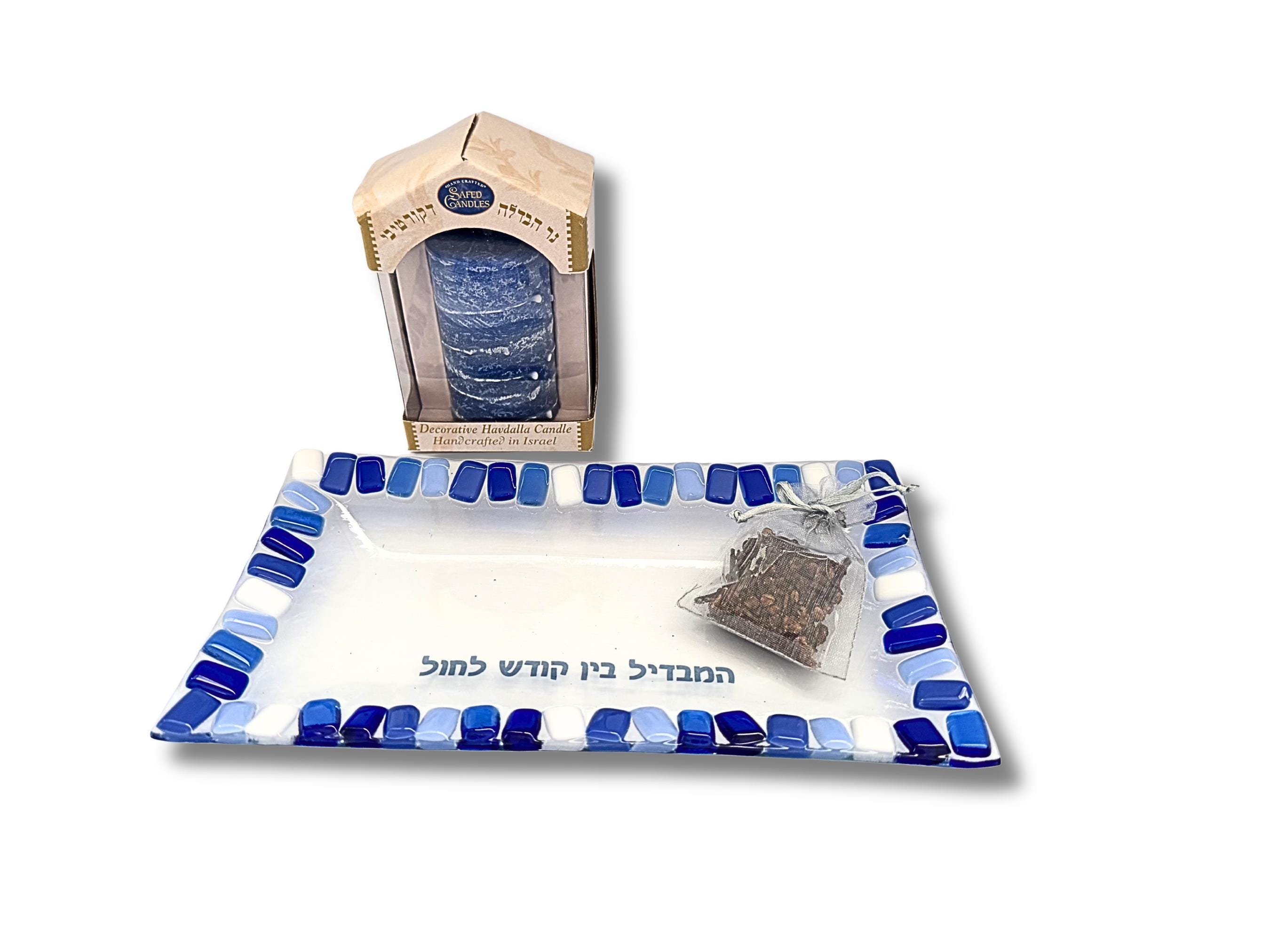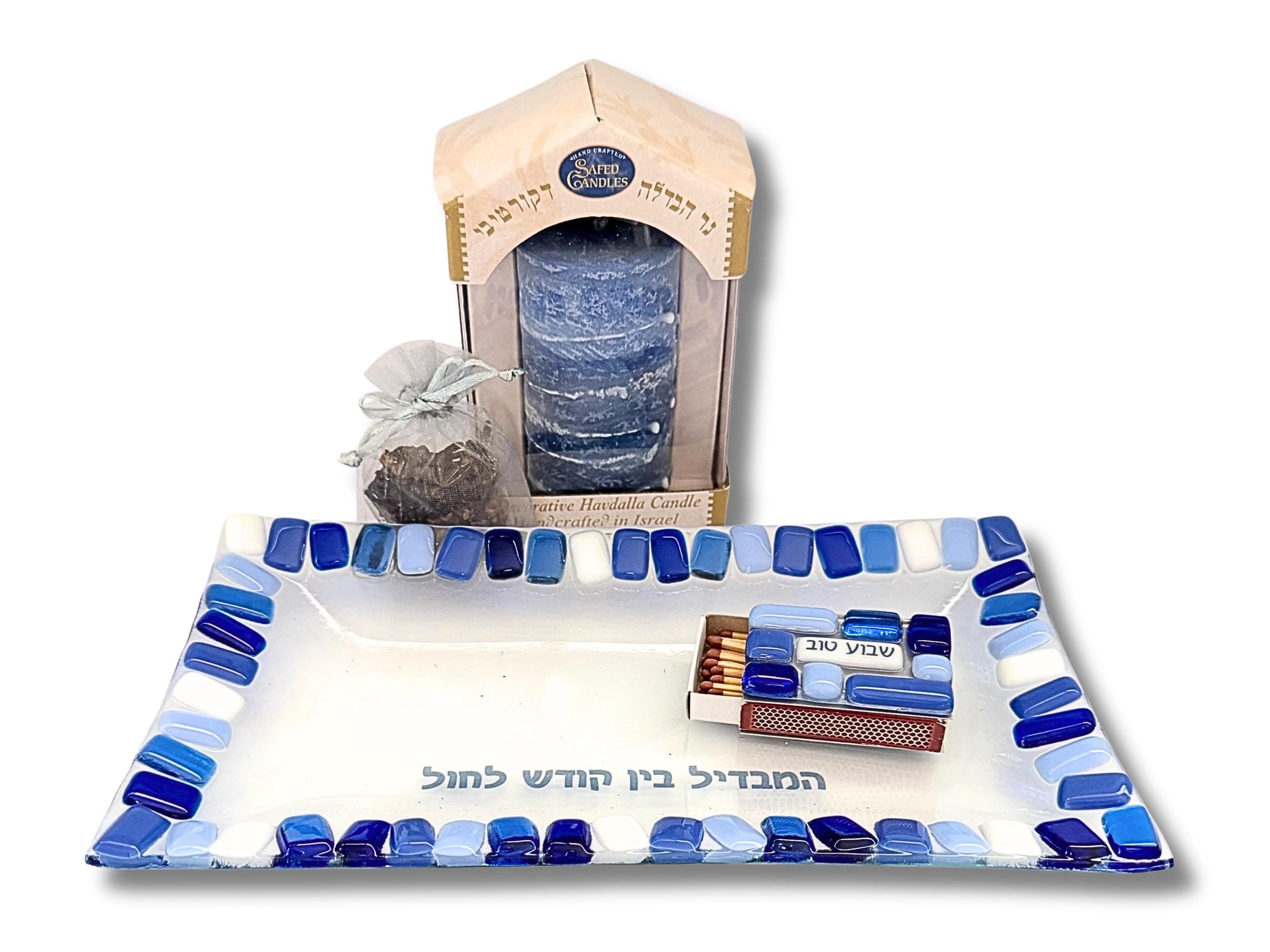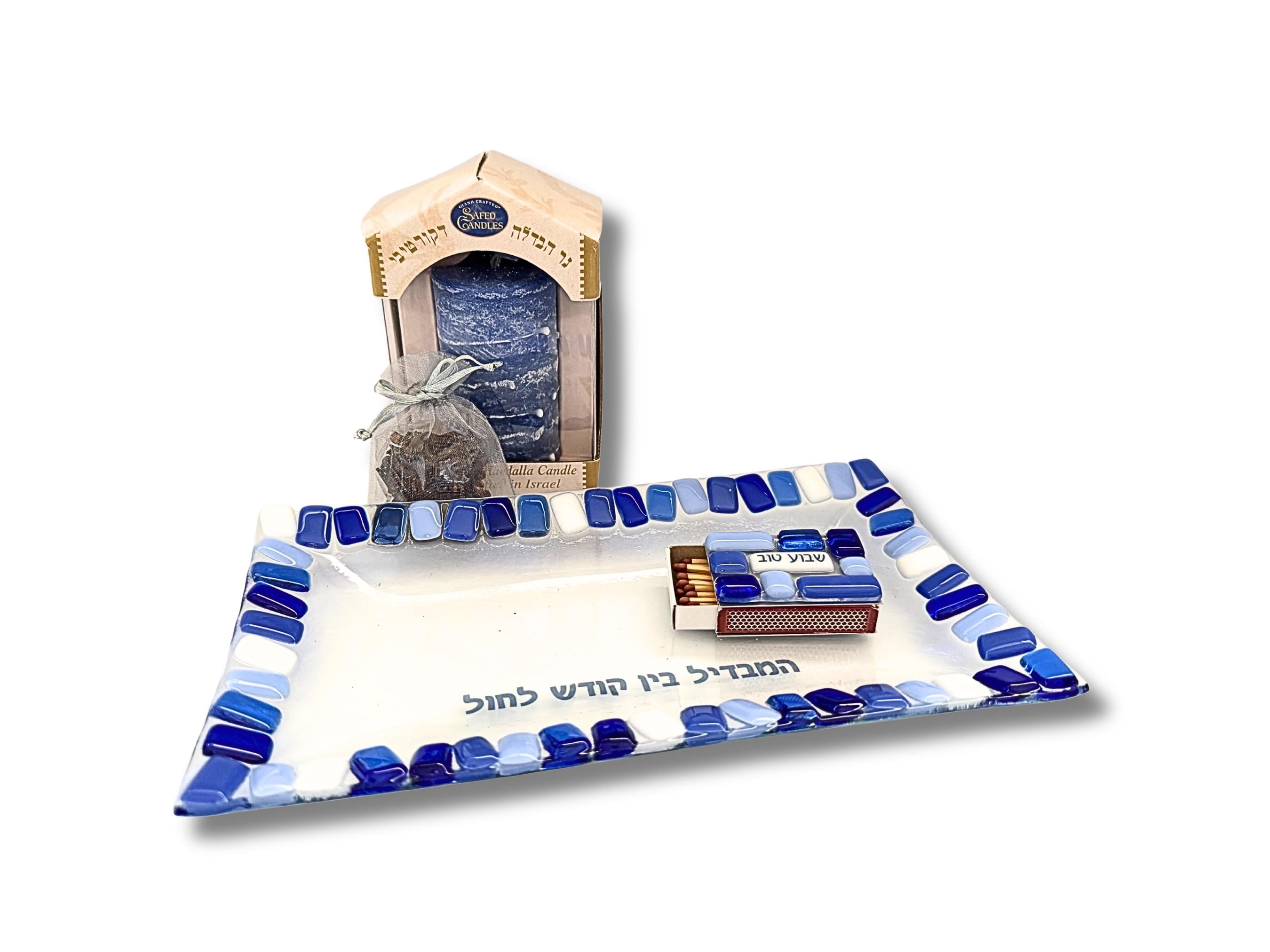 The rectangular glass plate features the Hebrew phrase המבדיל בין קדש לחול, symbolizing the transition from sacred to everyday. Paired with a freestanding Havdalah candle from Safed Candles, also crafted in Israel, the set feels both refined and cohesive.