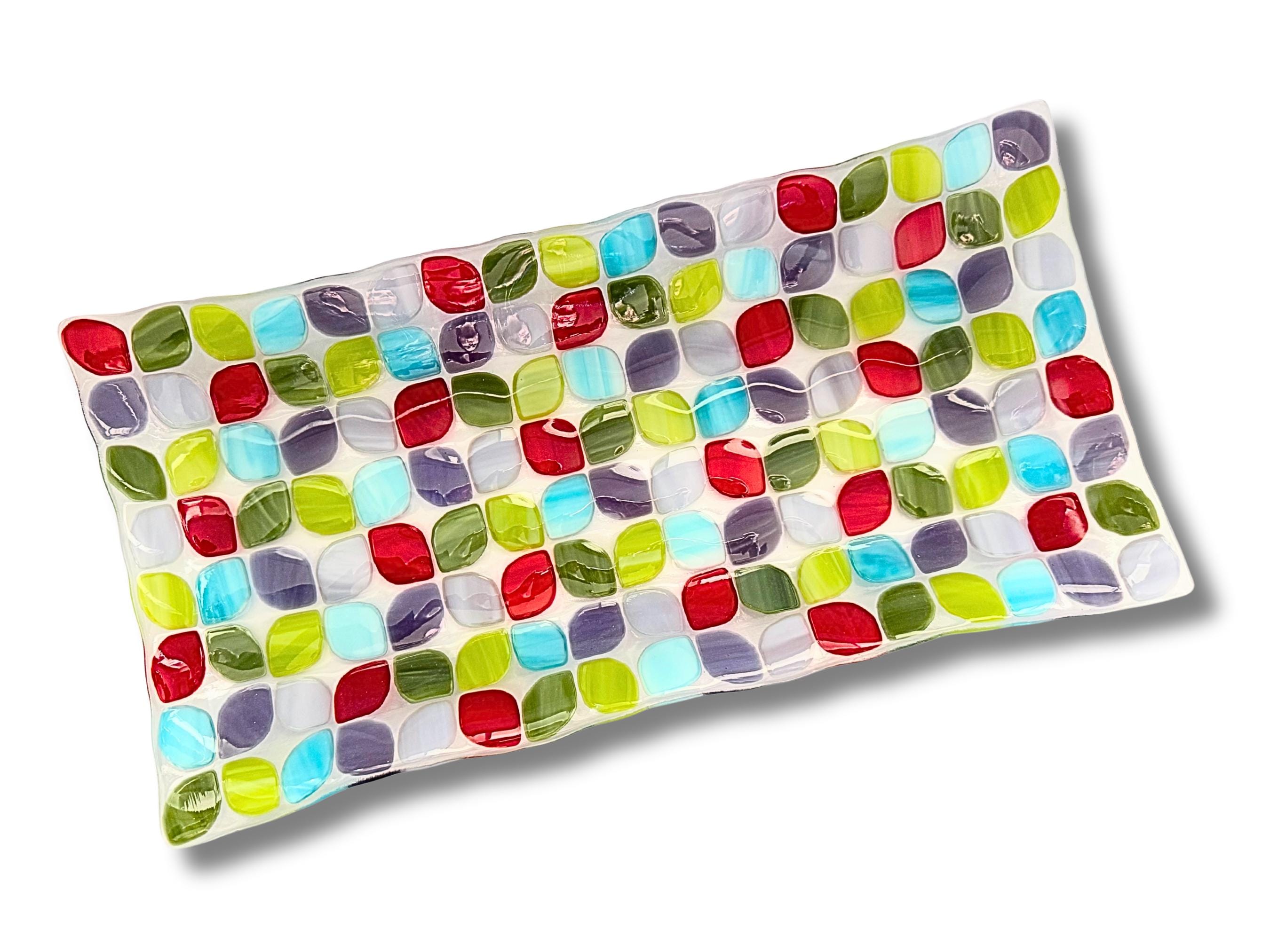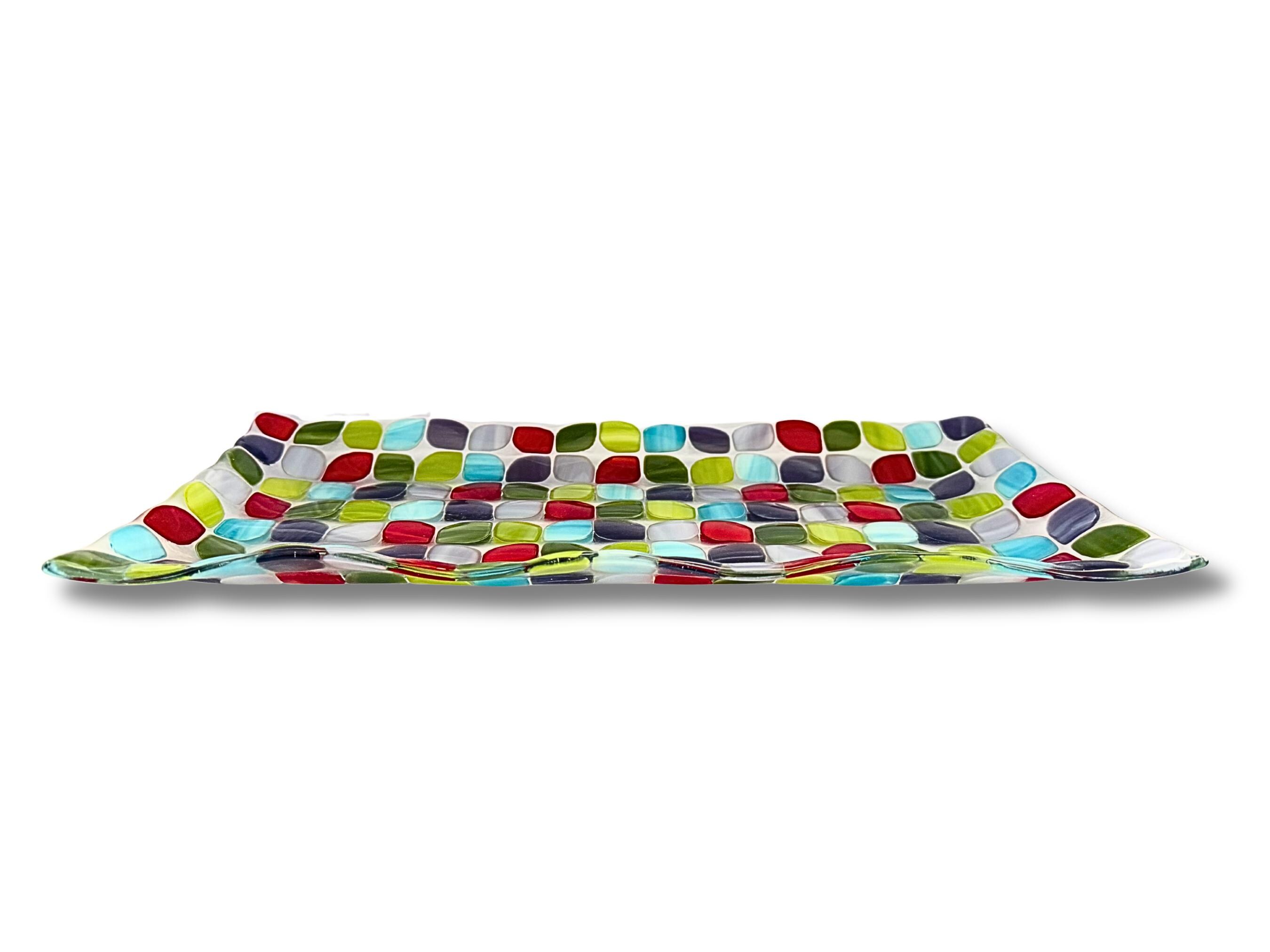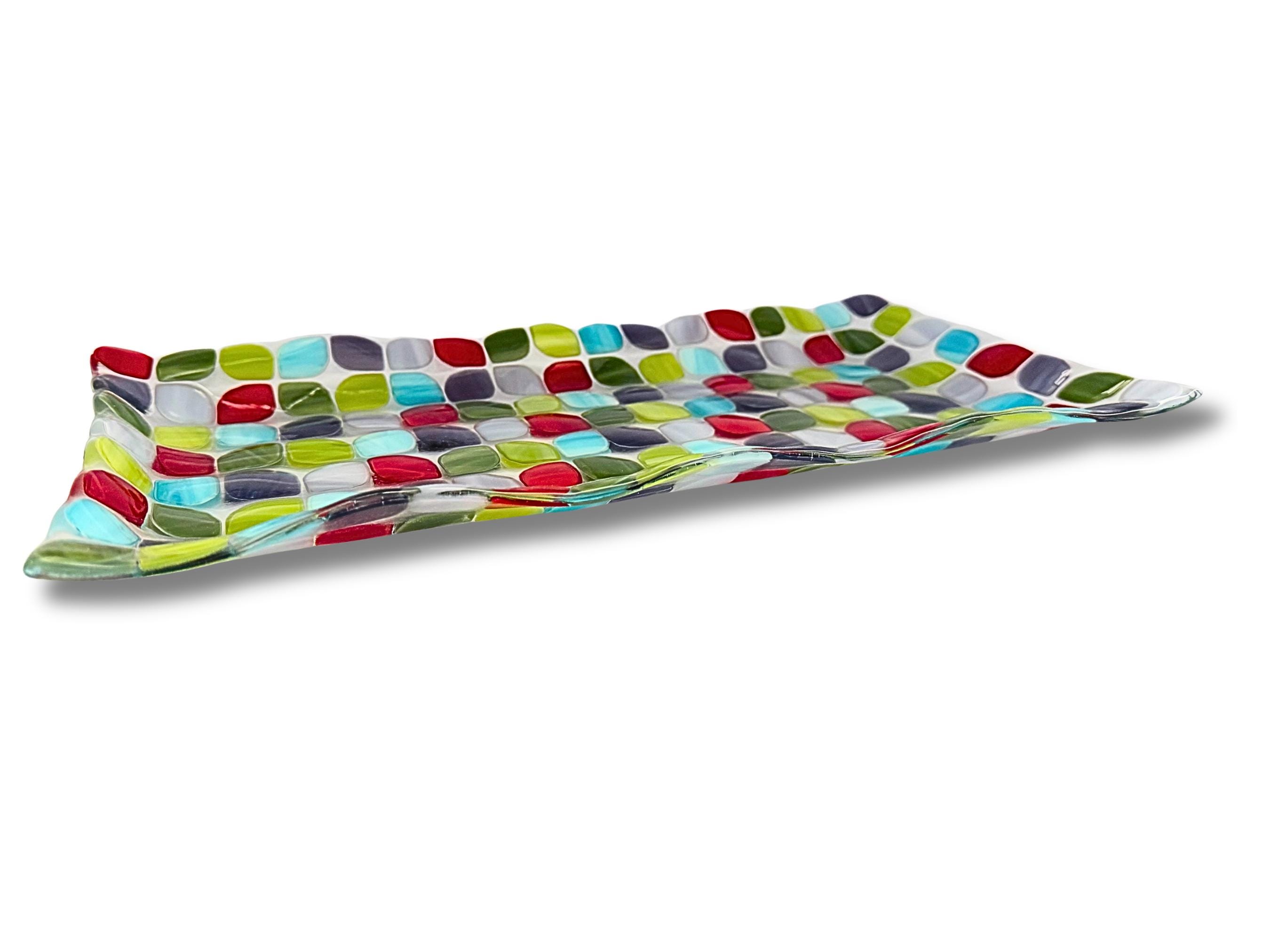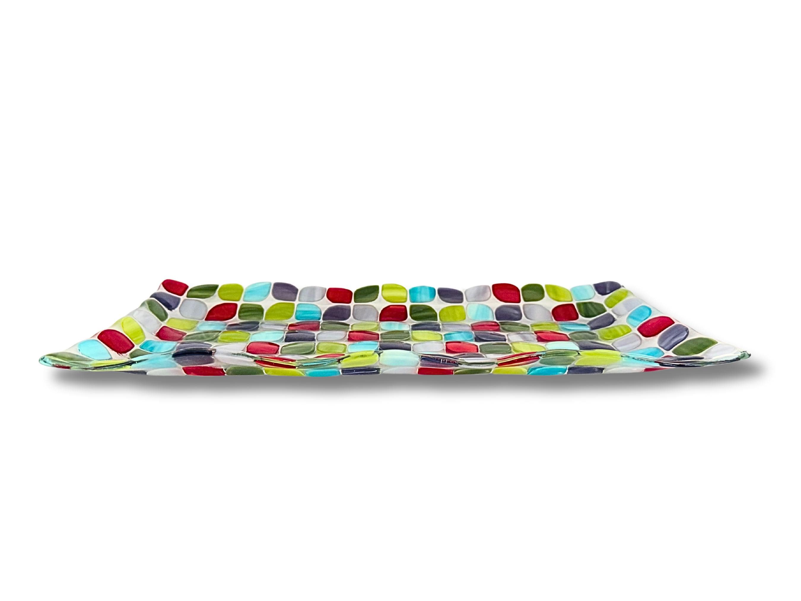A beautifully handcrafted large fused glass tray featuring calming shades of blue, green, purple and red in a modern mosaic design. Each piece is kiln-fired and one of a kind, with a smooth, food-safe surface and gently raised wavy edges.