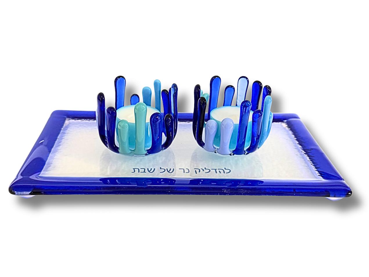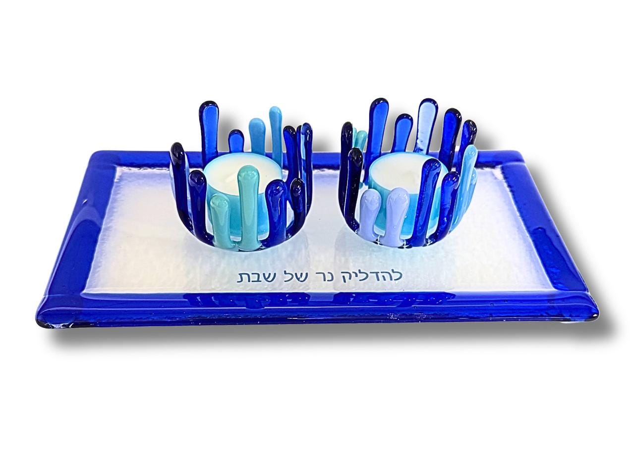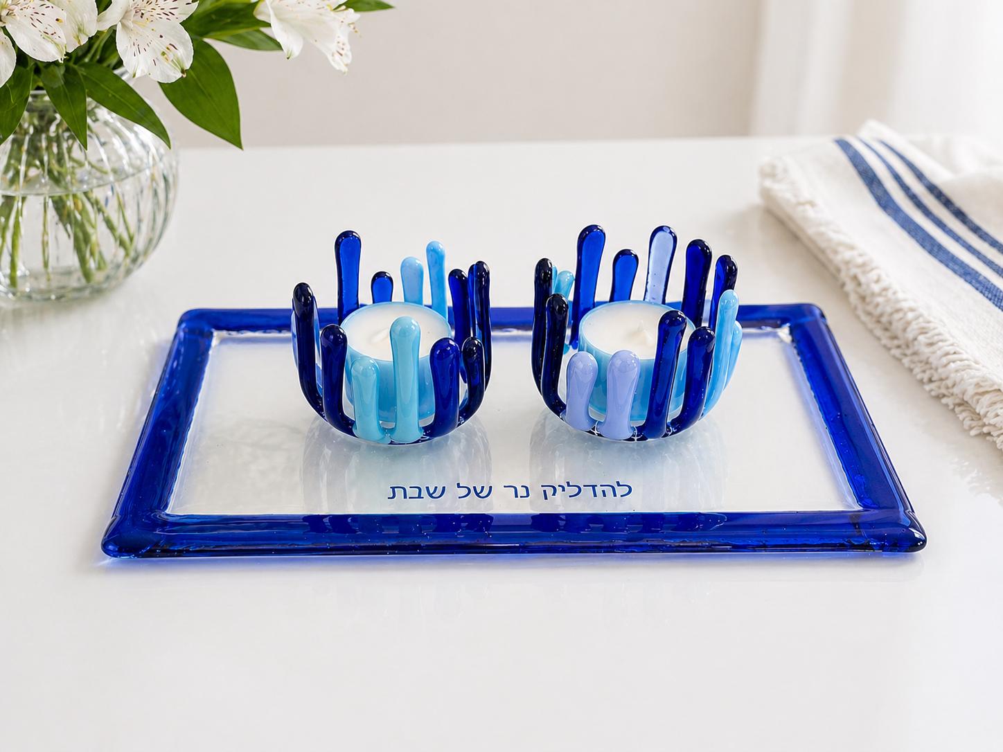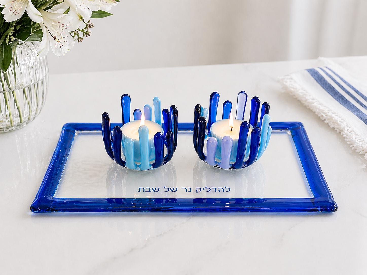 Sold as a set of two, with the option to add a clear glass tray featuring a vibrant blue border with the Hebrew Shabbat candle blessing, להדליק נר של שבת.