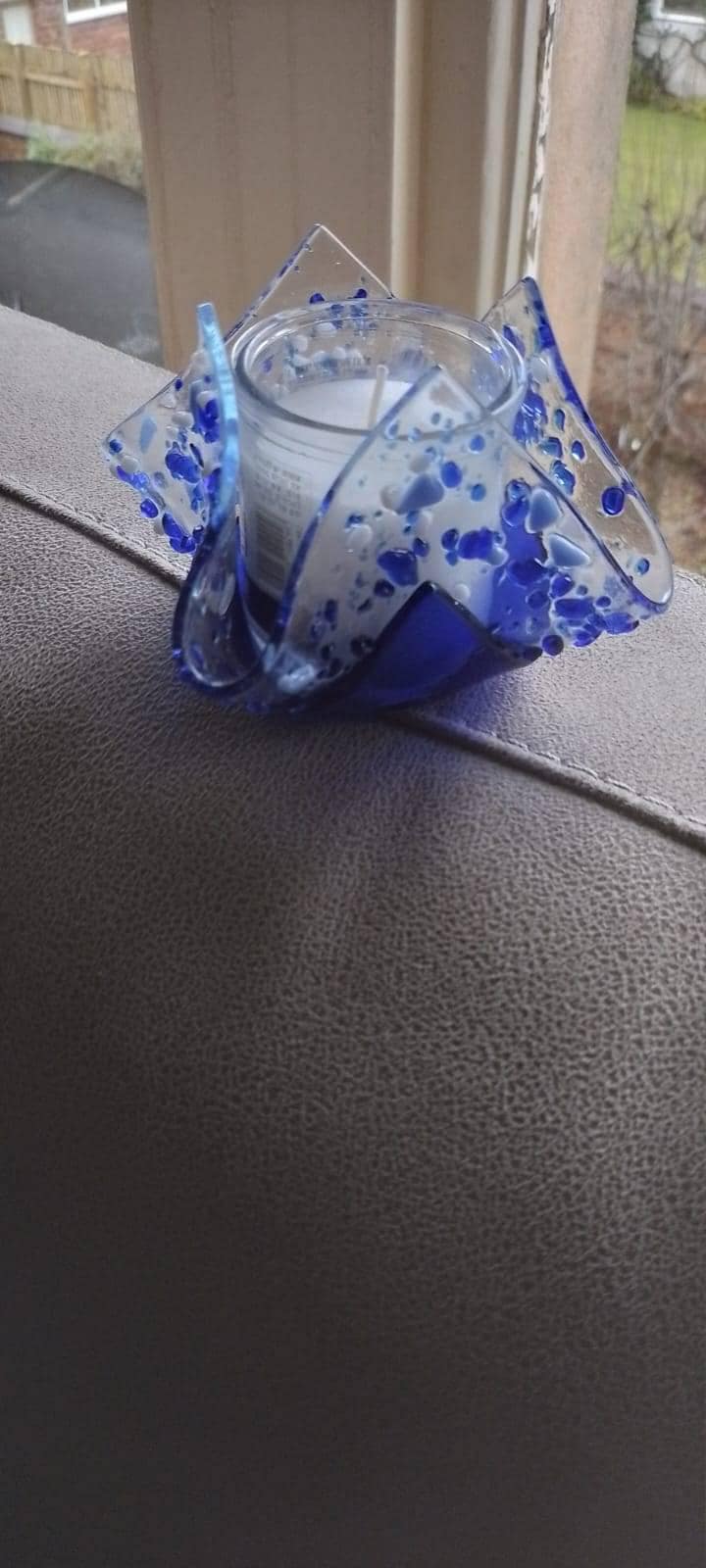 This elegant candle holder is made from fused glass. In Jewish tradition a 24 hour memorial (Yahrzeit) candle is lit on the anniversary of death of a close relative and on certain Jewish holidays when the Yizkor prayer is recited. These candle holders were designed to enhance this tradition allowing the memory of a loved one to be honored in a more beautified fashion.