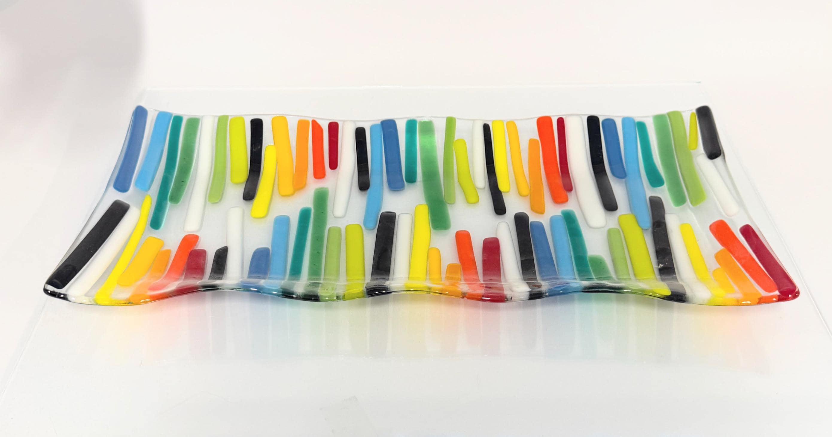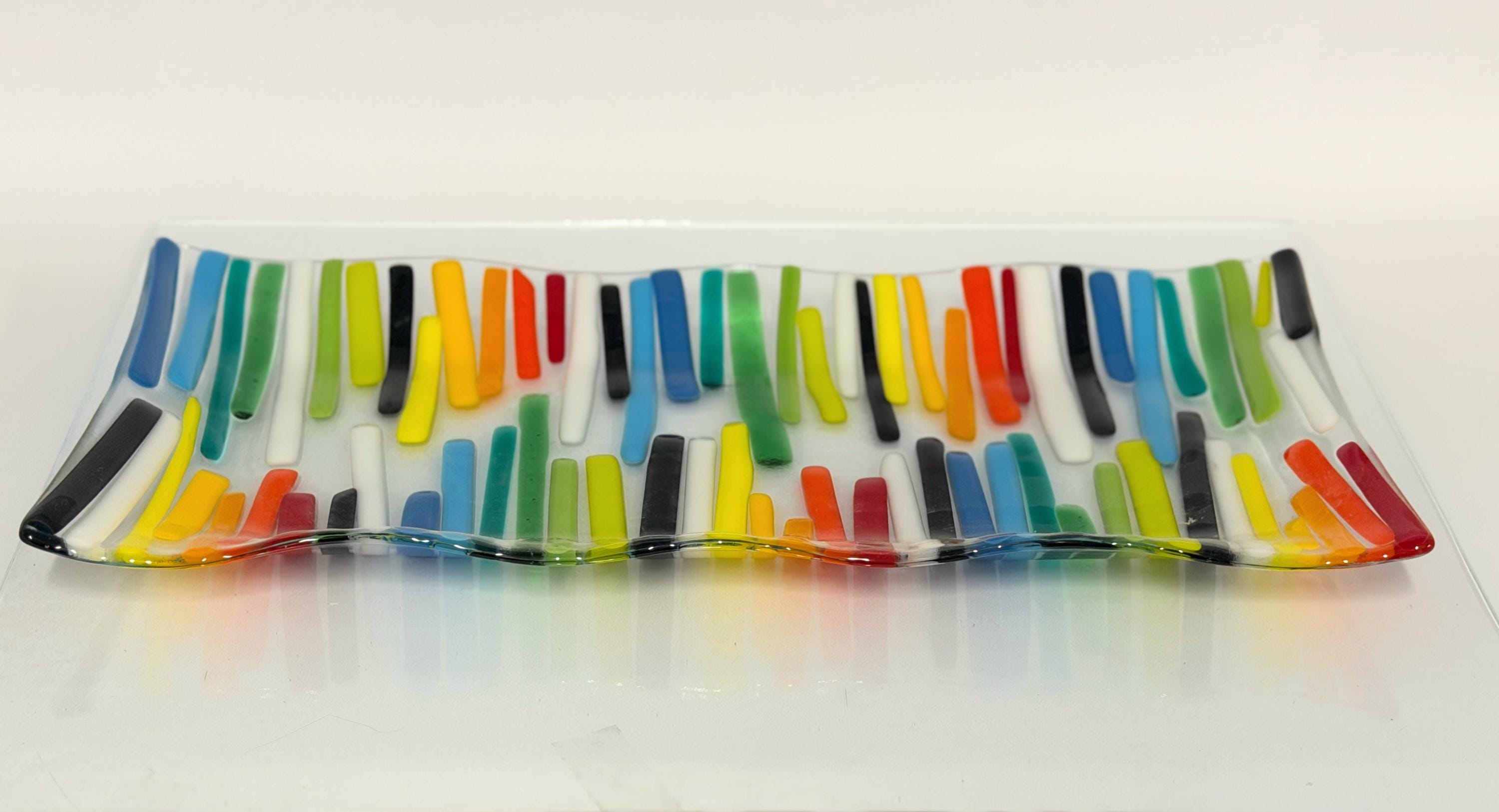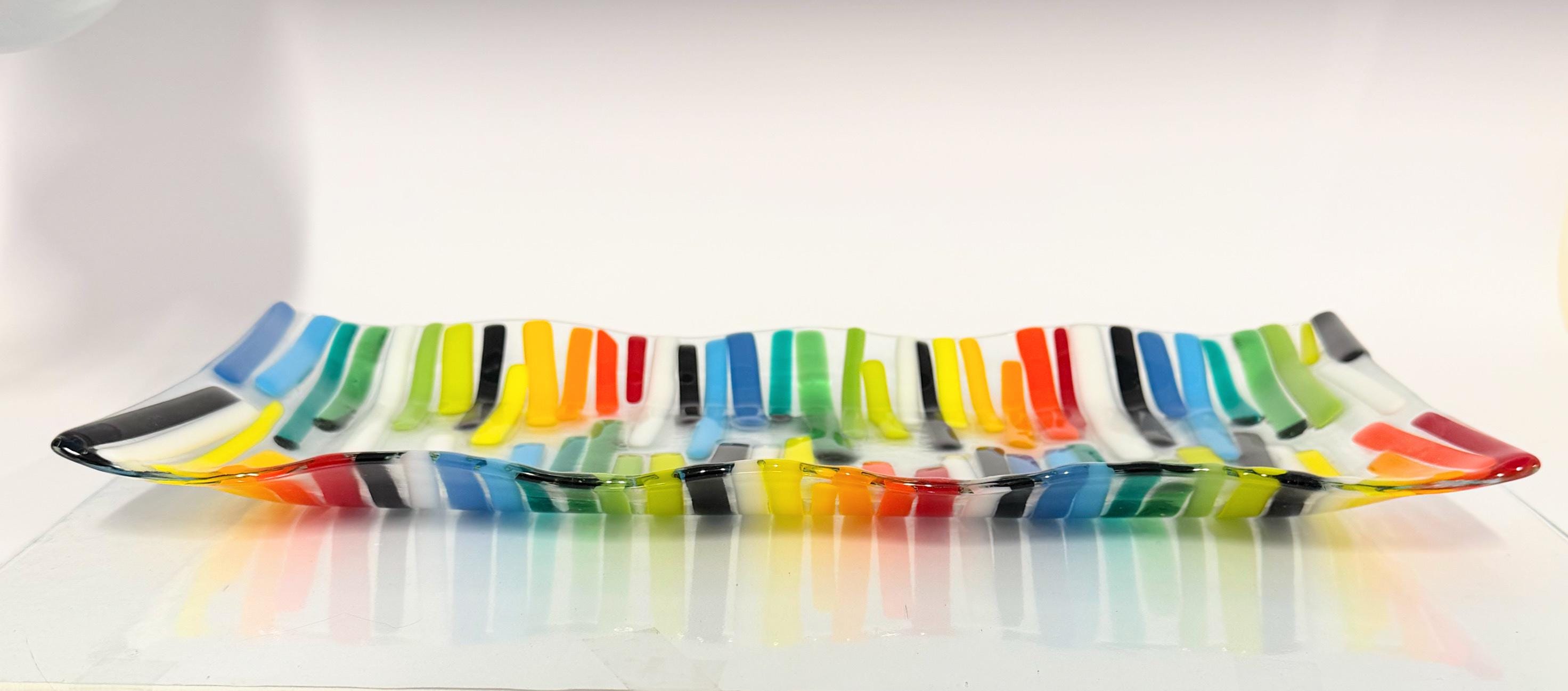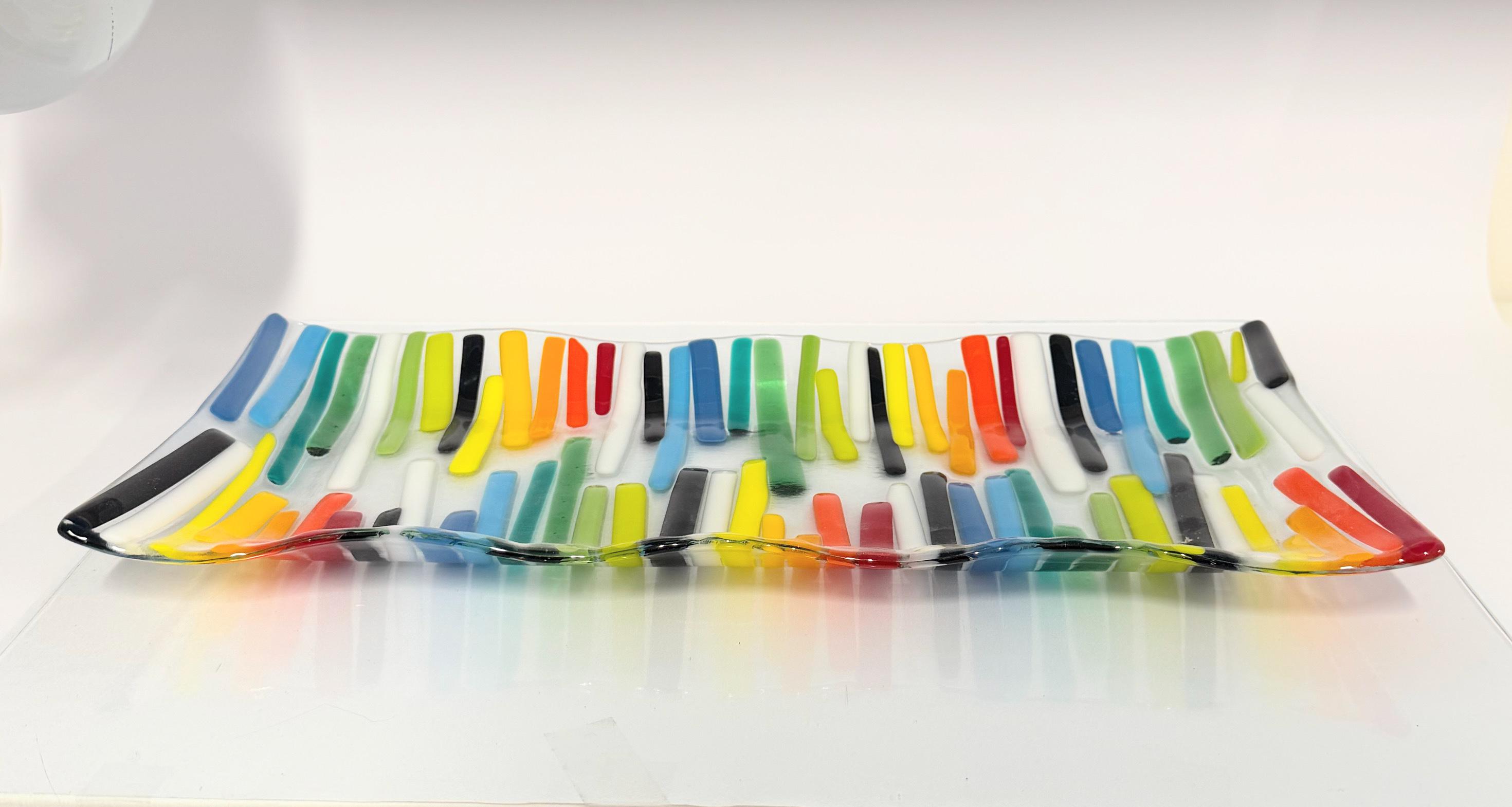 Many strips of colorful glass were cut and arranged on a single layer of clear glass. The 2 layers of glass were then fused in a kiln at high temperatures to create a uniform, smooth and glossy finish. The fused piece was then fired again in a mold to create this decorative and useful tray. This piece is strong and solid.
