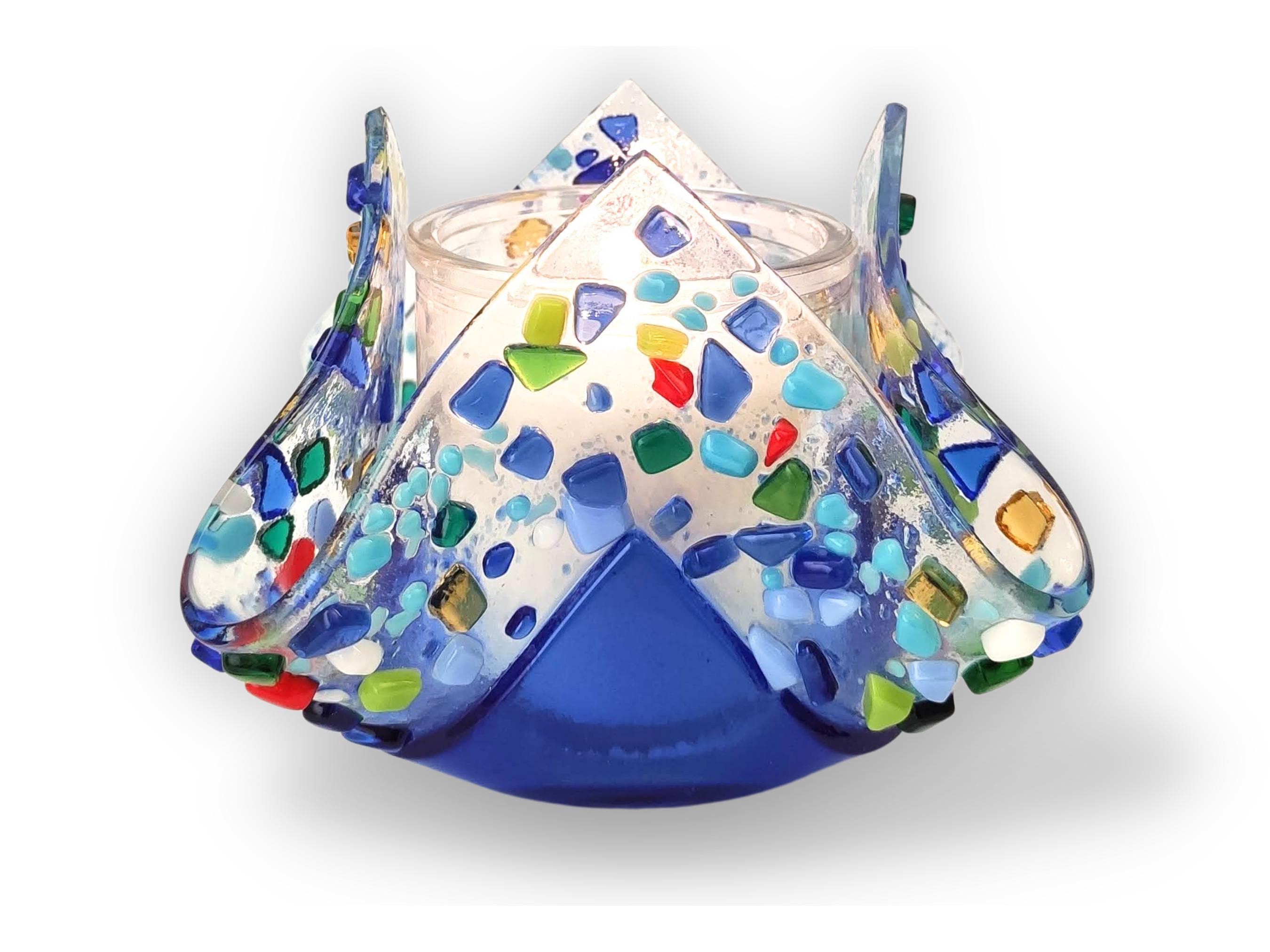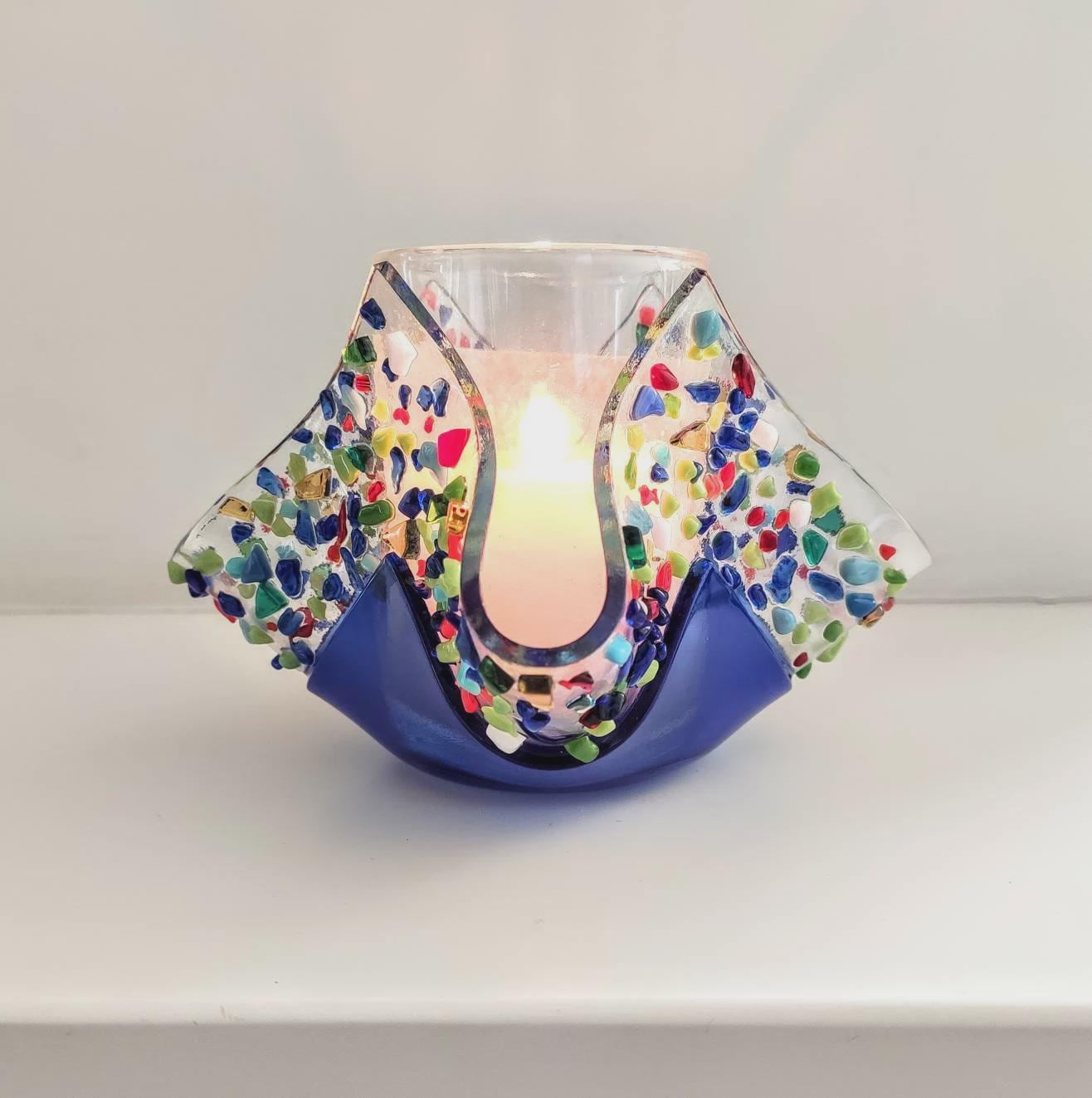This elegant candle holder is made from fused glass. In Jewish tradition a memorial (Yahrzeit) candle is lit on the anniversary of death of a close relative and on certain Jewish holidays when the Yizkor prayer is recited. These candle holders were designed to enhance this tradition allowing the memory of a loved one to be honored in a more beautified fashion.