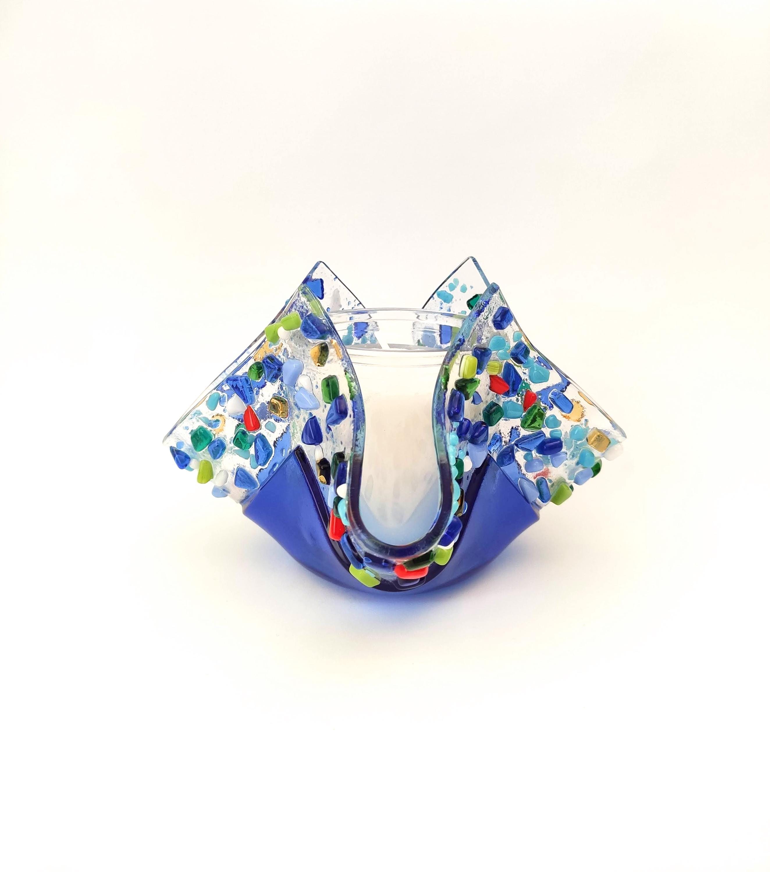The glass is kiln fired at high temperatures to fuse the pieces together and then draped over a mold and fired again to create an artistic draping form.