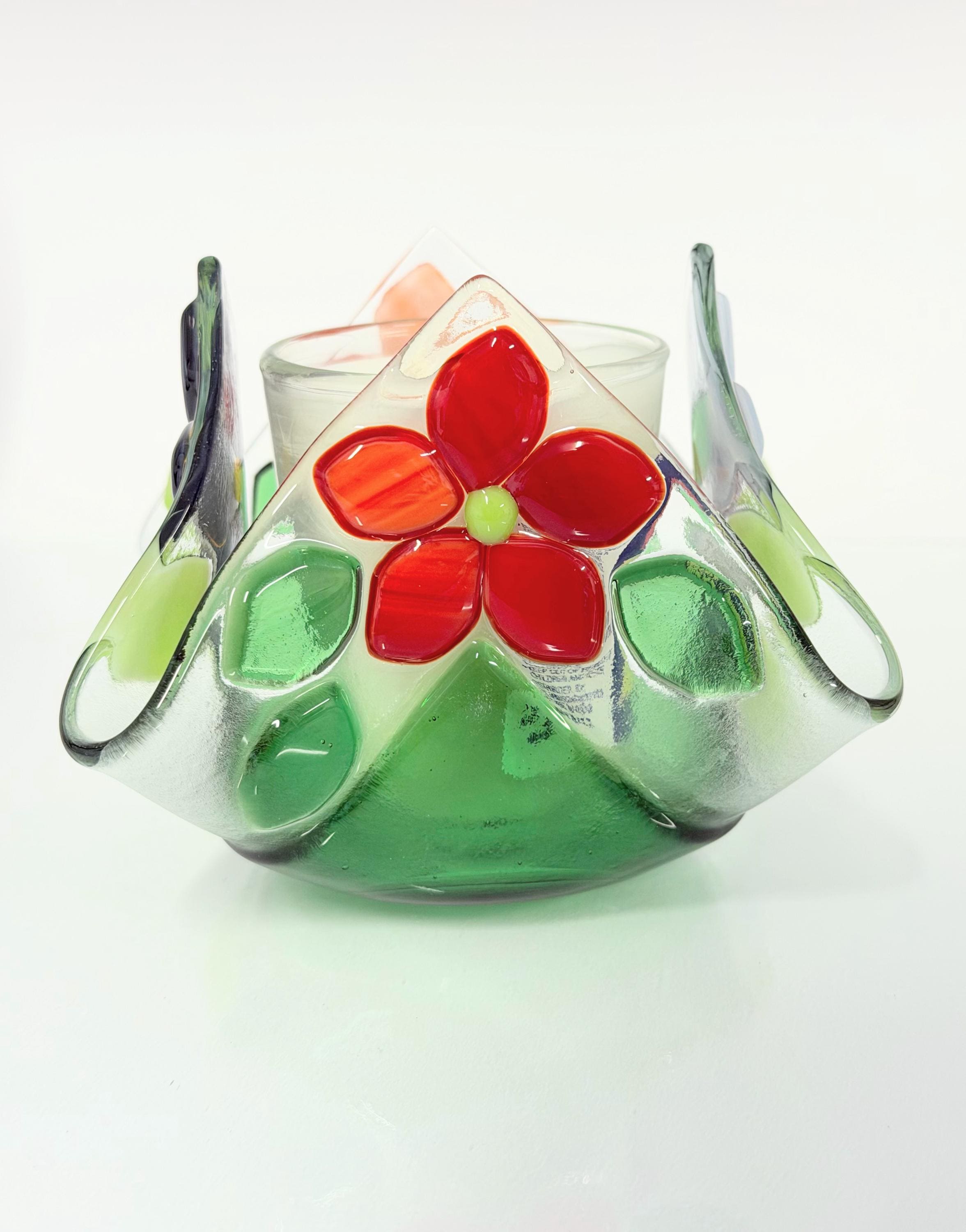 This exquisite floral candle holder is an exclusive and distinctive piece. Made from fused glass, it resembles a garden or bouquet of flowers. In Jewish tradition a memorial (Yahrzeit) candle is lit on the anniversary of death of a close relative and on certain Jewish holidays when the Yizkor prayer is recited. These candle holders were designed to enhance this tradition allowing the memory of a loved one to be honored in a more beautified fashion.