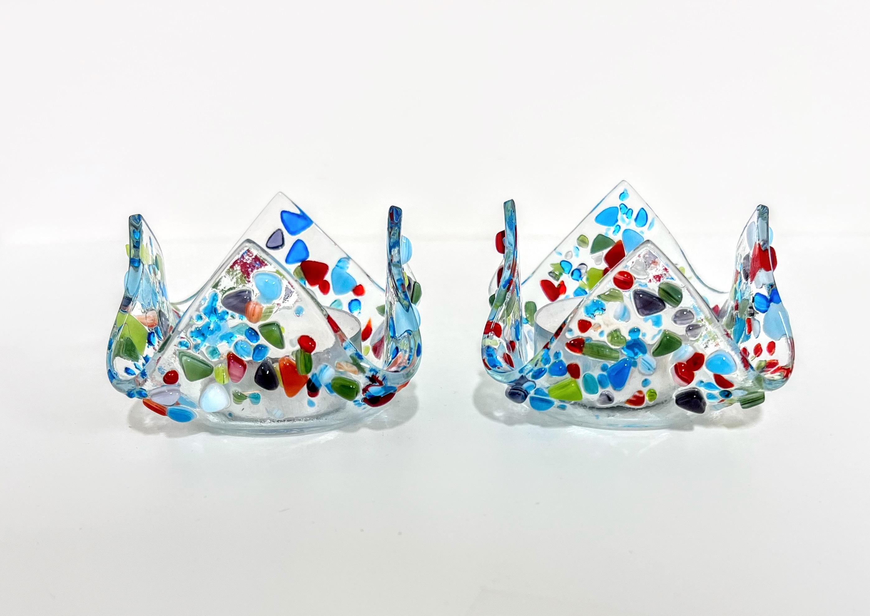 The tack-fused glass frit on the tea light holders keeps each piece of colored glass slightly raised, giving the surface a sparkling, textured finish. The vibrant colors add a lively and festive touch to any space.