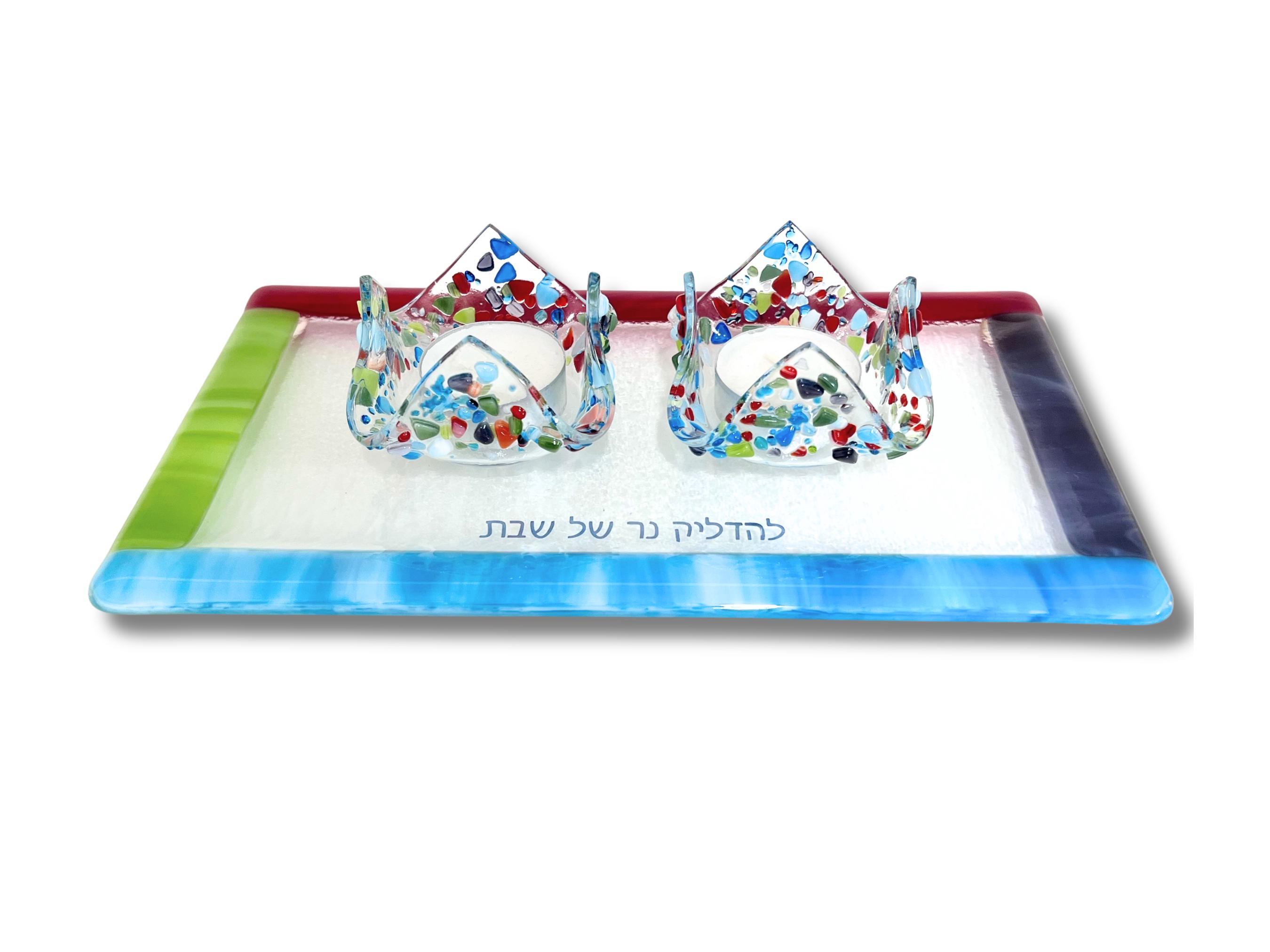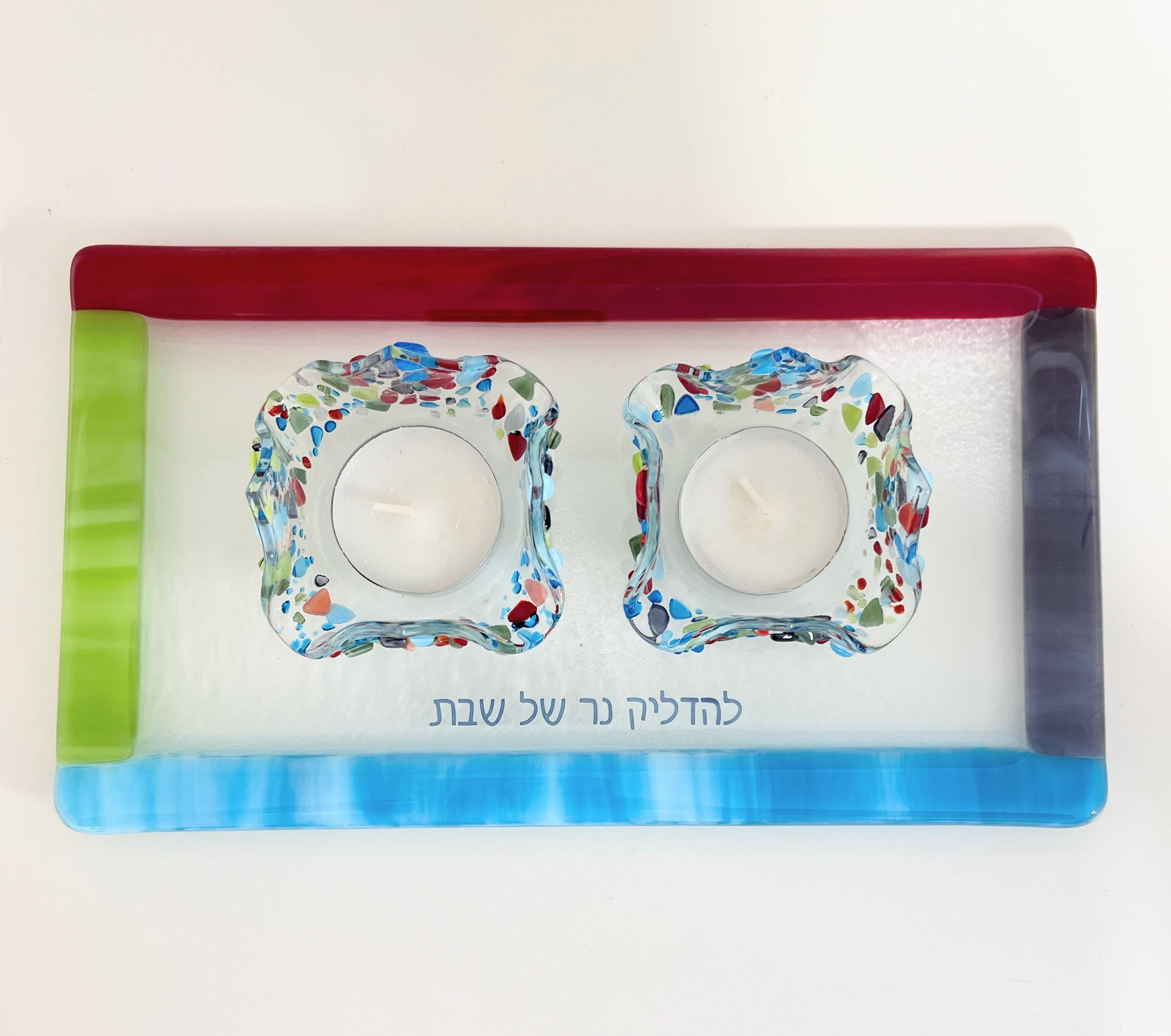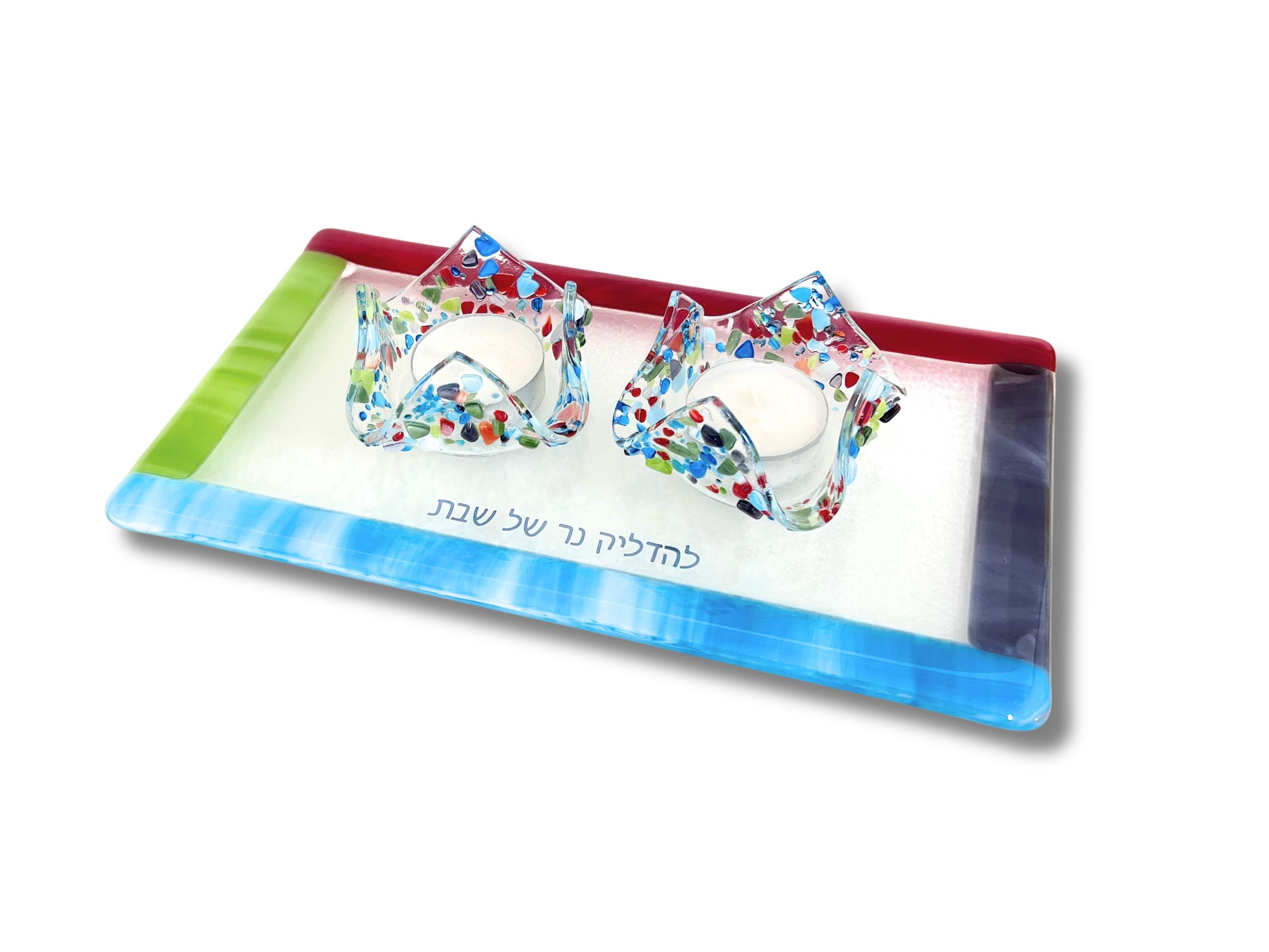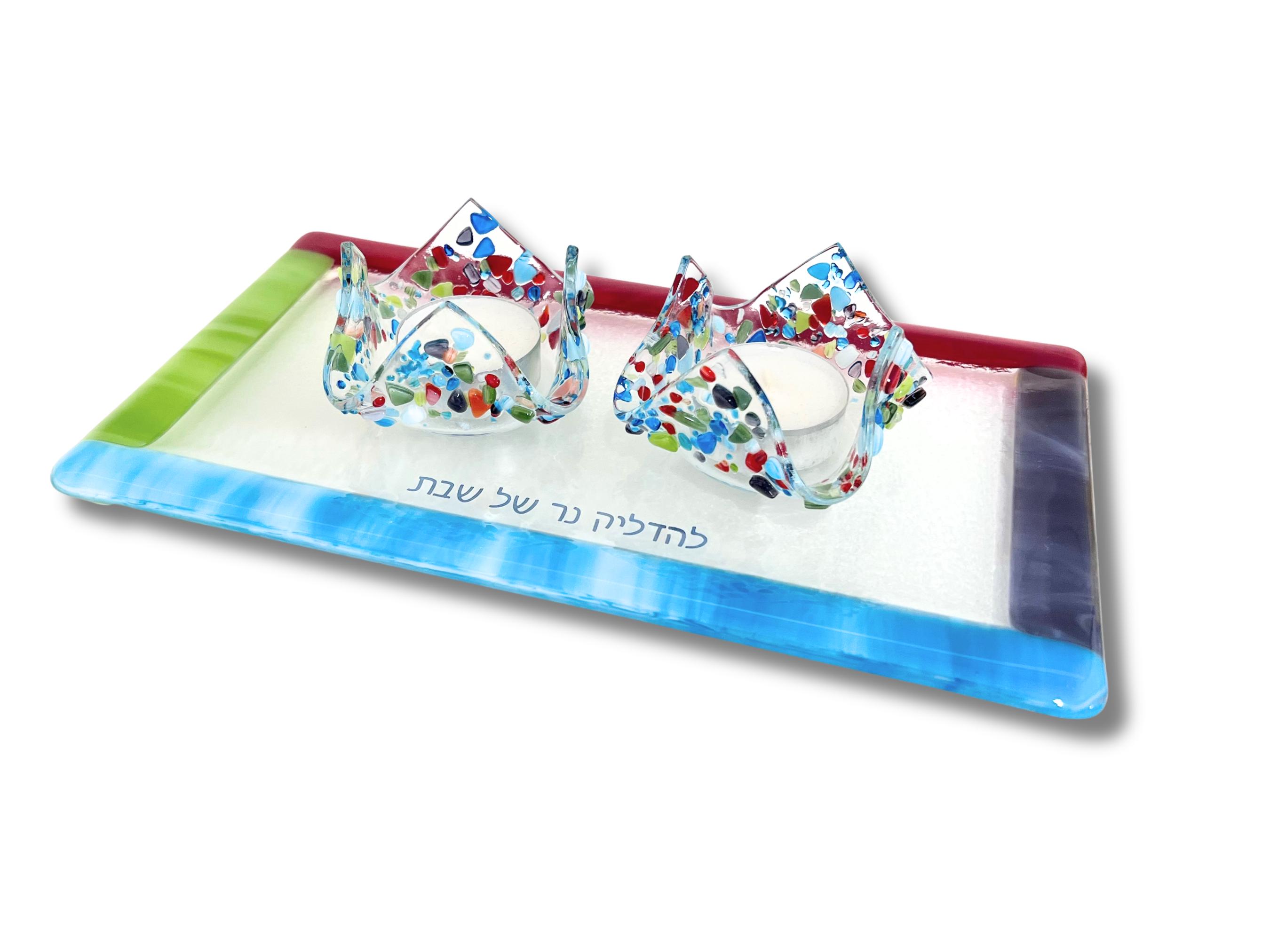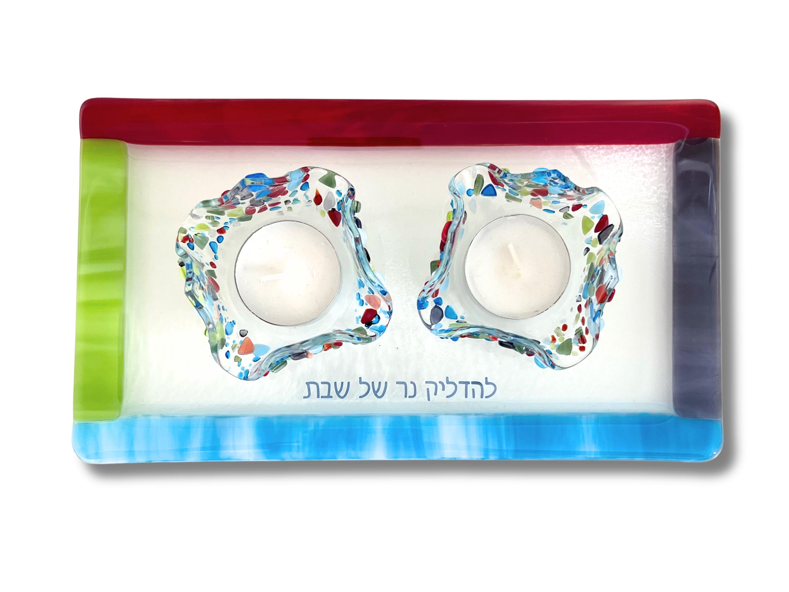 Vibrant Fused Glass Shabbat Tealight Candle Holder Set | Handmade Judaica from Israel