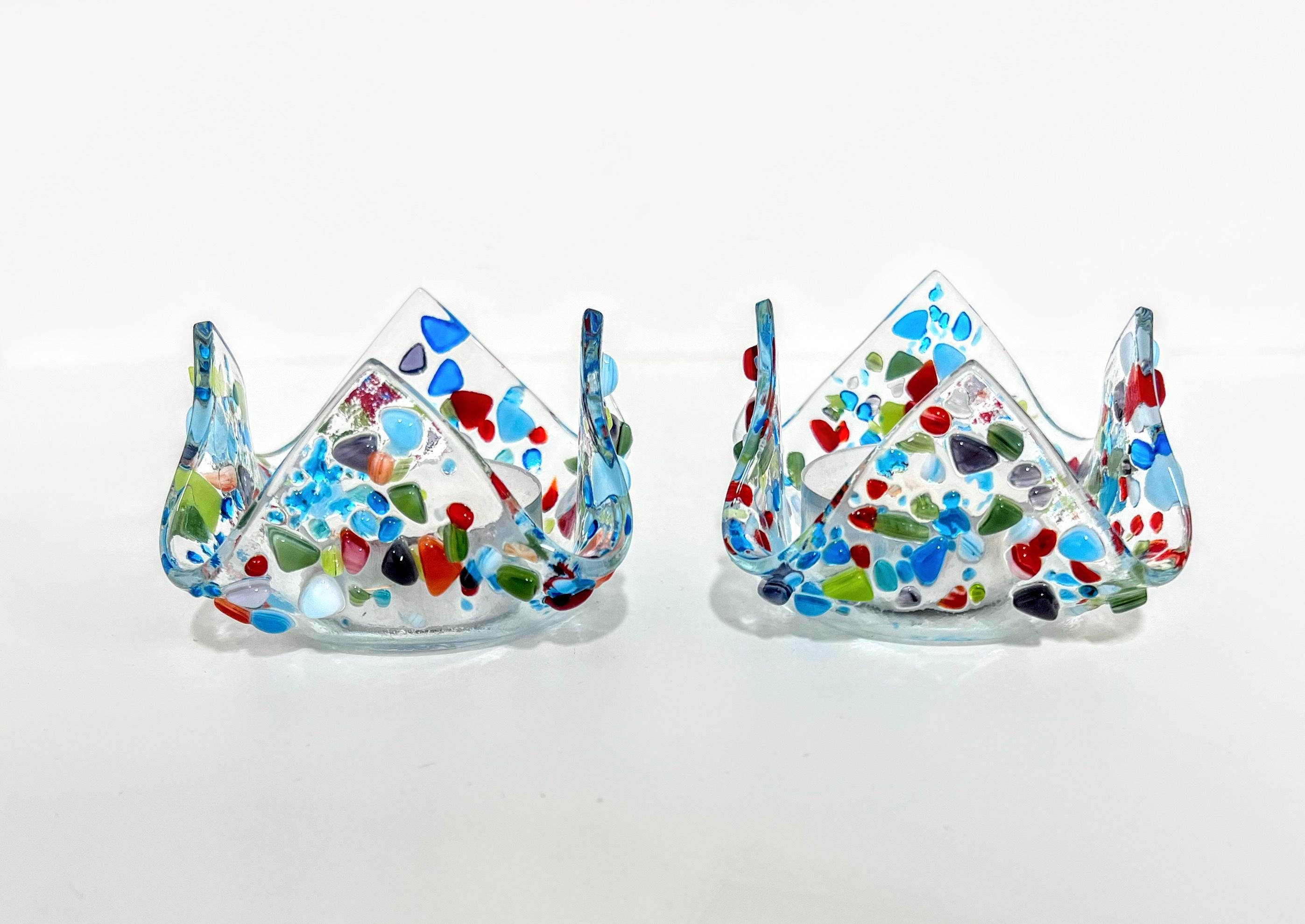 Add color, light, and meaning to your Shabbat table with this handmade fused glass tealight holder set by Israeli artist Shevi Berman. Each piece is carefully crafted in Israel, blending modern design and Jewish tradition to create a joyful expression of contemporary Judaica.